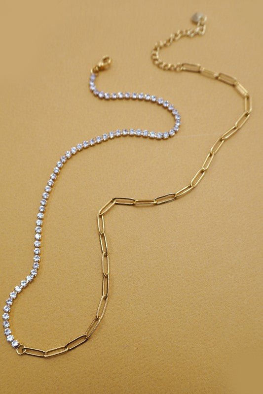 18K Stainless Steel Tarnish-Free Tennis Paper Clip Rhinestone Necklace, Tennis Rhinestone mixed with paper clip chain necklace. Crafted from high-quality stainless steel with an 18K gold finish, this necklace is designed to resist tarnish and maintain its shine.