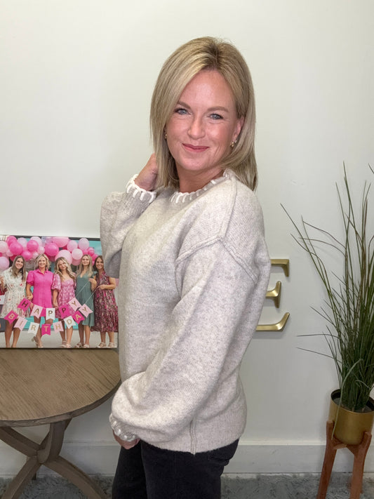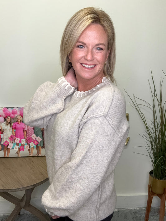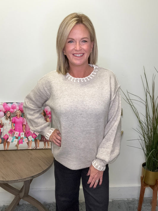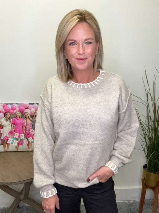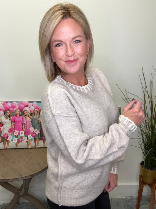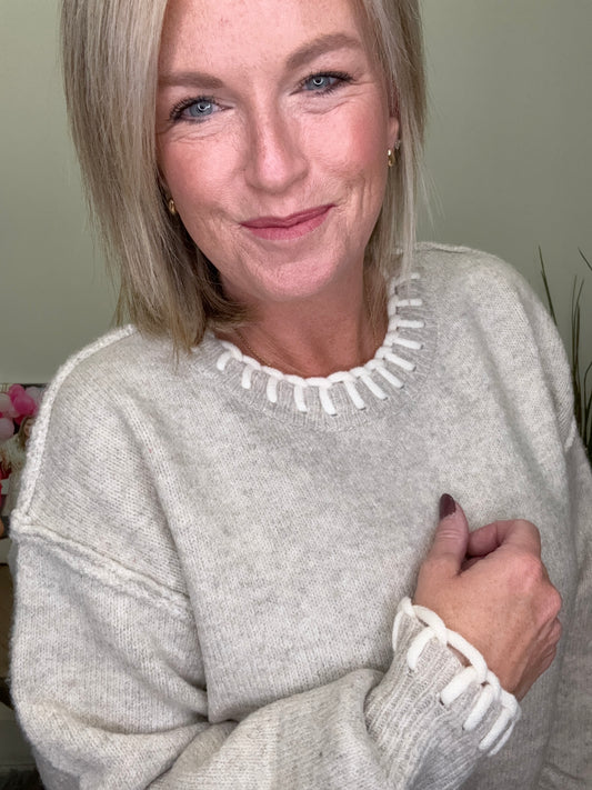 Stay warm and stylish in our Blanket Stitch Warm and Cozy Sweater. The perfect mix of taupe and gray, with ivory stitching accents on the cuffs and neckline. The thick and chunky fit is sure to keep you snug.