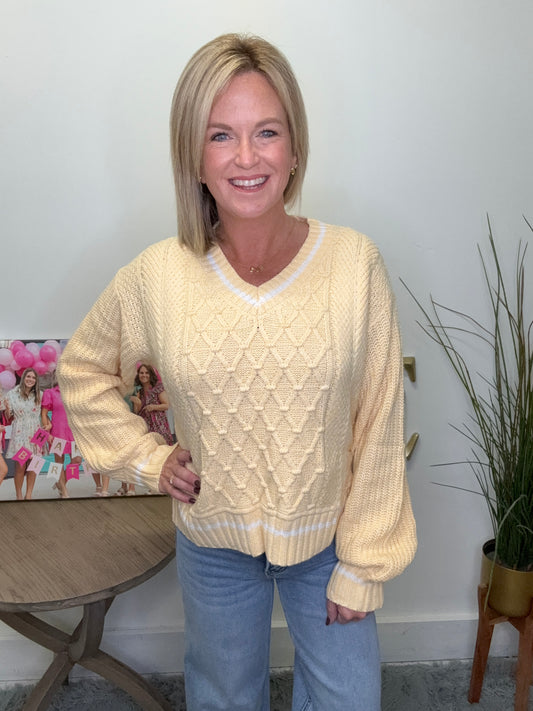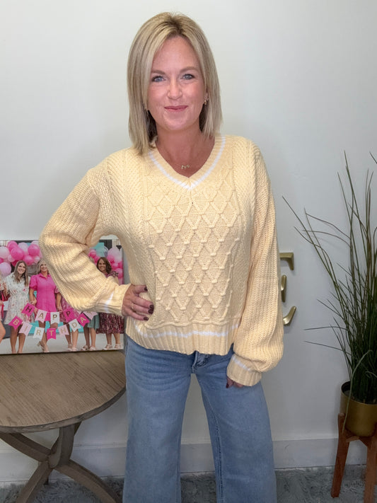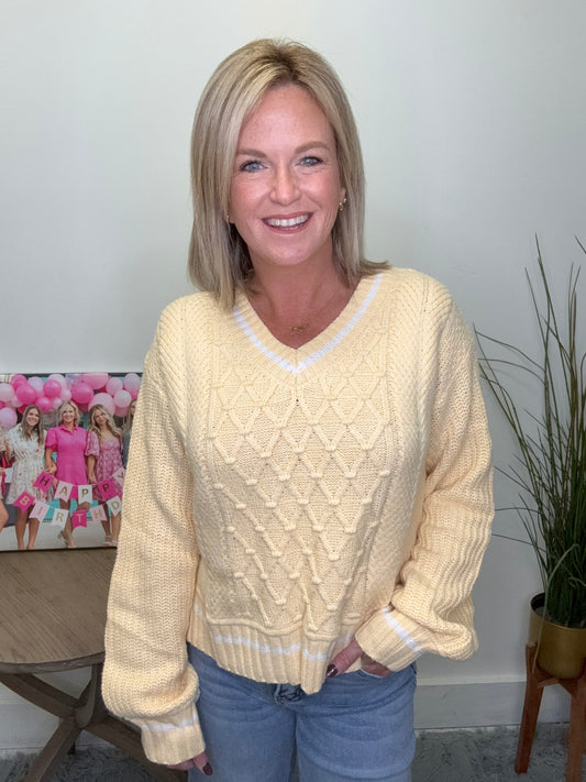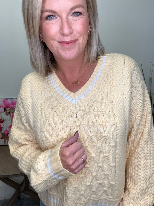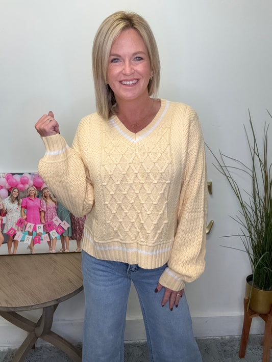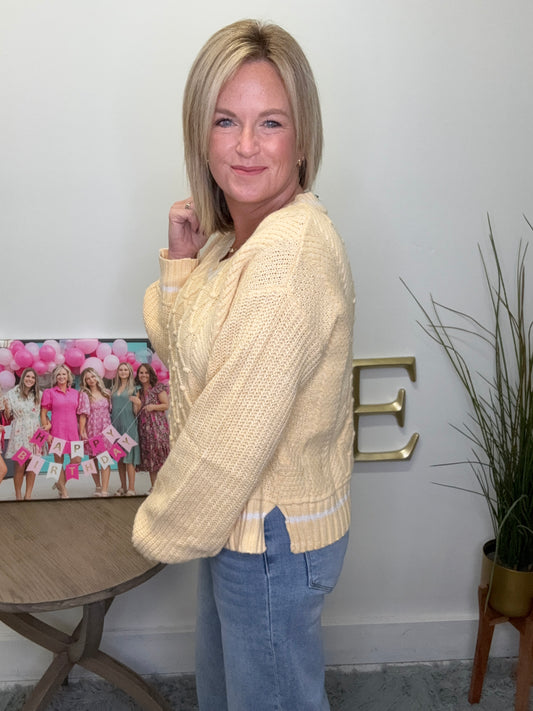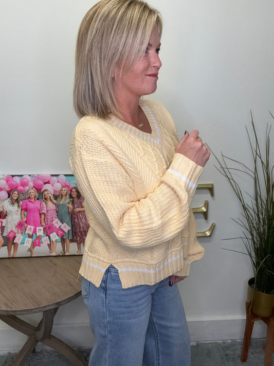 Add a pop of butter yellow to your wardrobe with this trendy yet classic preppy sweater. The cable knit design and white trim give it a unique touch, while the v-neck and split hem add versatility. Stay cozy and stylish in this must-have piece!