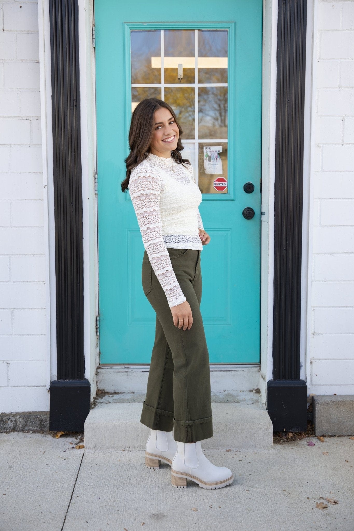 Unleash your inner fashionista with these deep olive green jeans! Designed with a high waist and wide cuff hem, these pants provide a comfortable fit while adding a pop of color to your wardrobe. Pair them with your favorite top for a perfect combination of style and comfort.