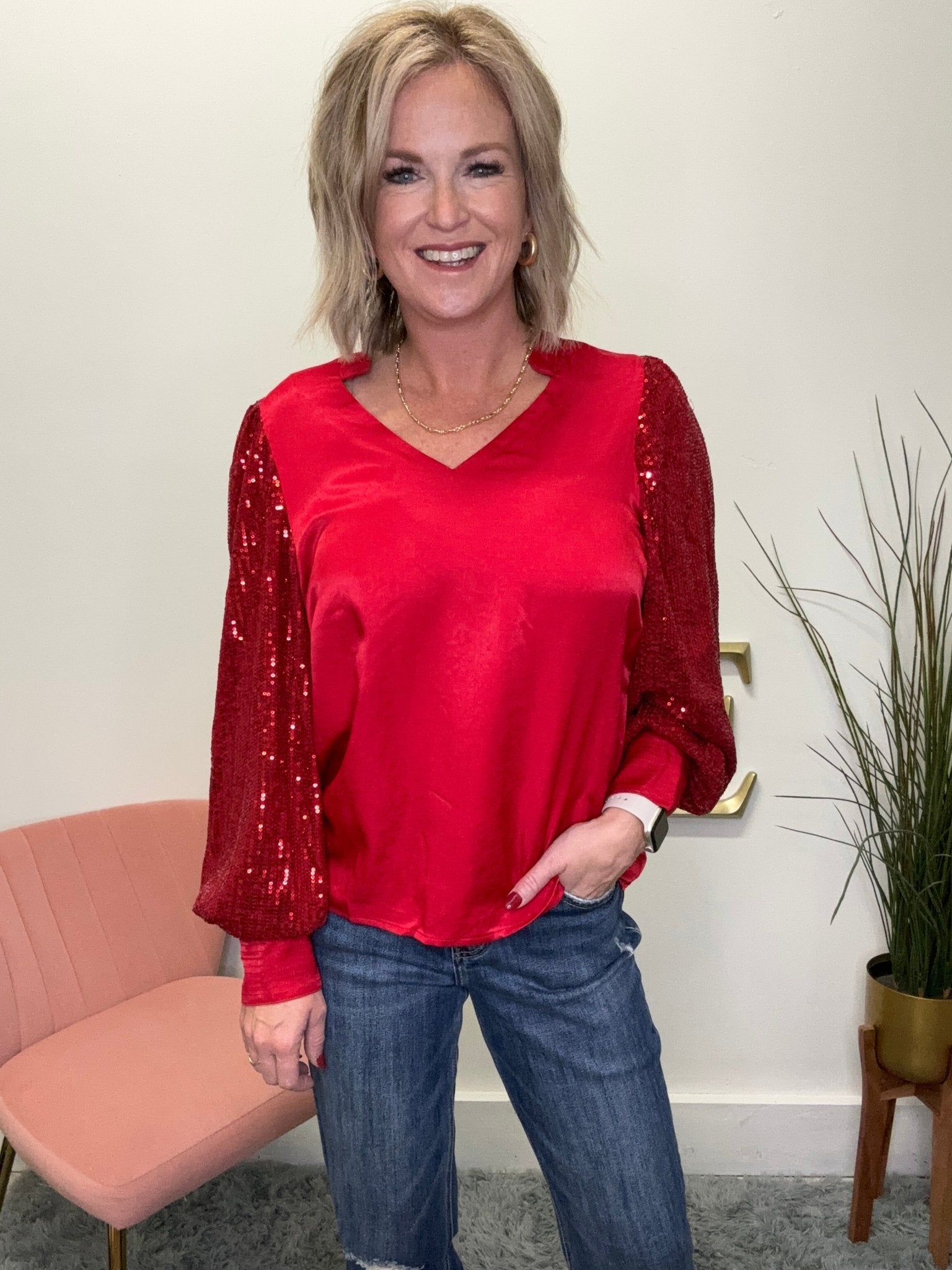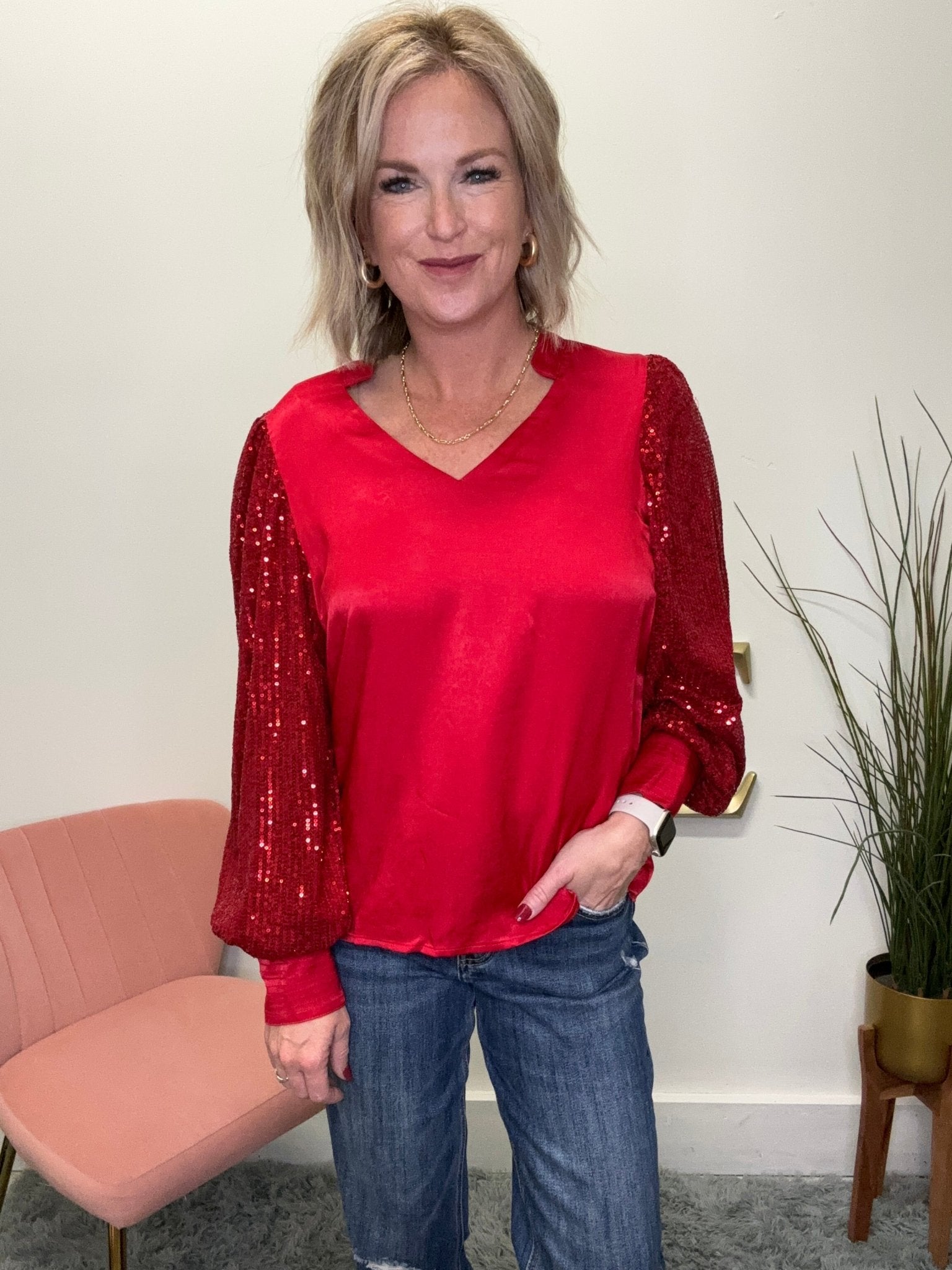 • Jordan Red Sequin V - Neck Date Top - FINAL SALE Tops holiday party Christmas sparkle blouse shirt - Ella Chic Boutique
