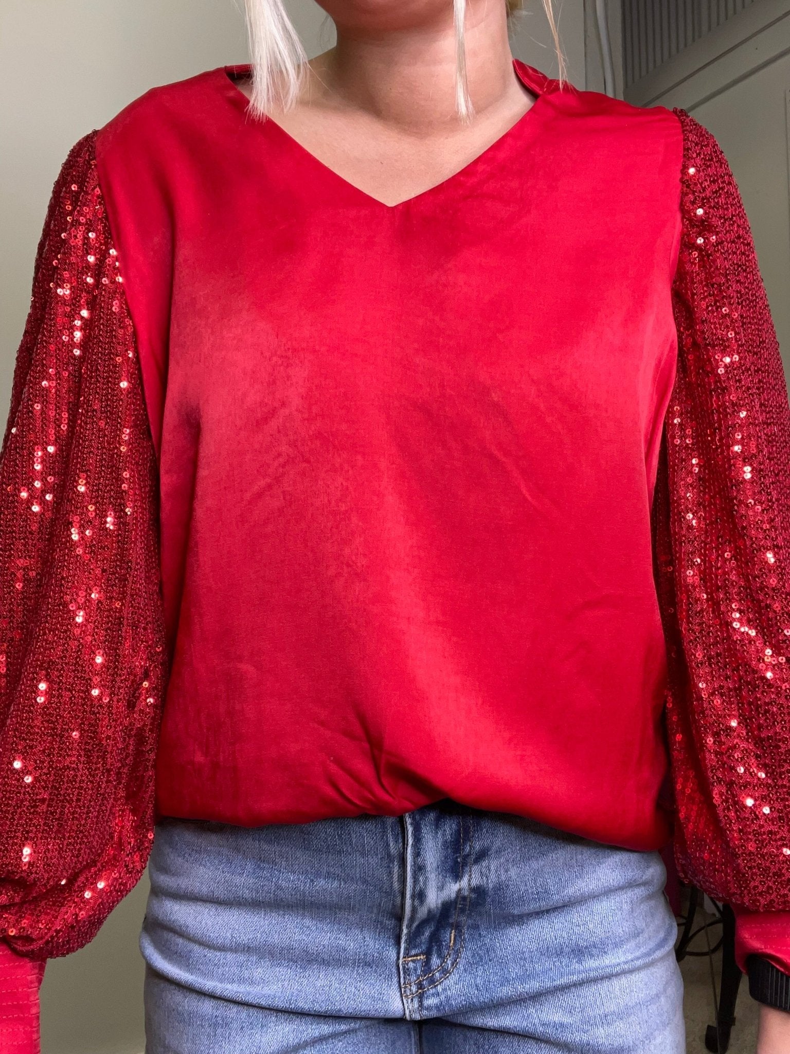 Turn heads at any party with our stunning Jordan Red Sequin V-Neck top. This festive and dressy piece features a gorgeous silky bodice and eye-catching sequin sleeves. The versatile V-neck design makes it perfect for any occasion. Party on!