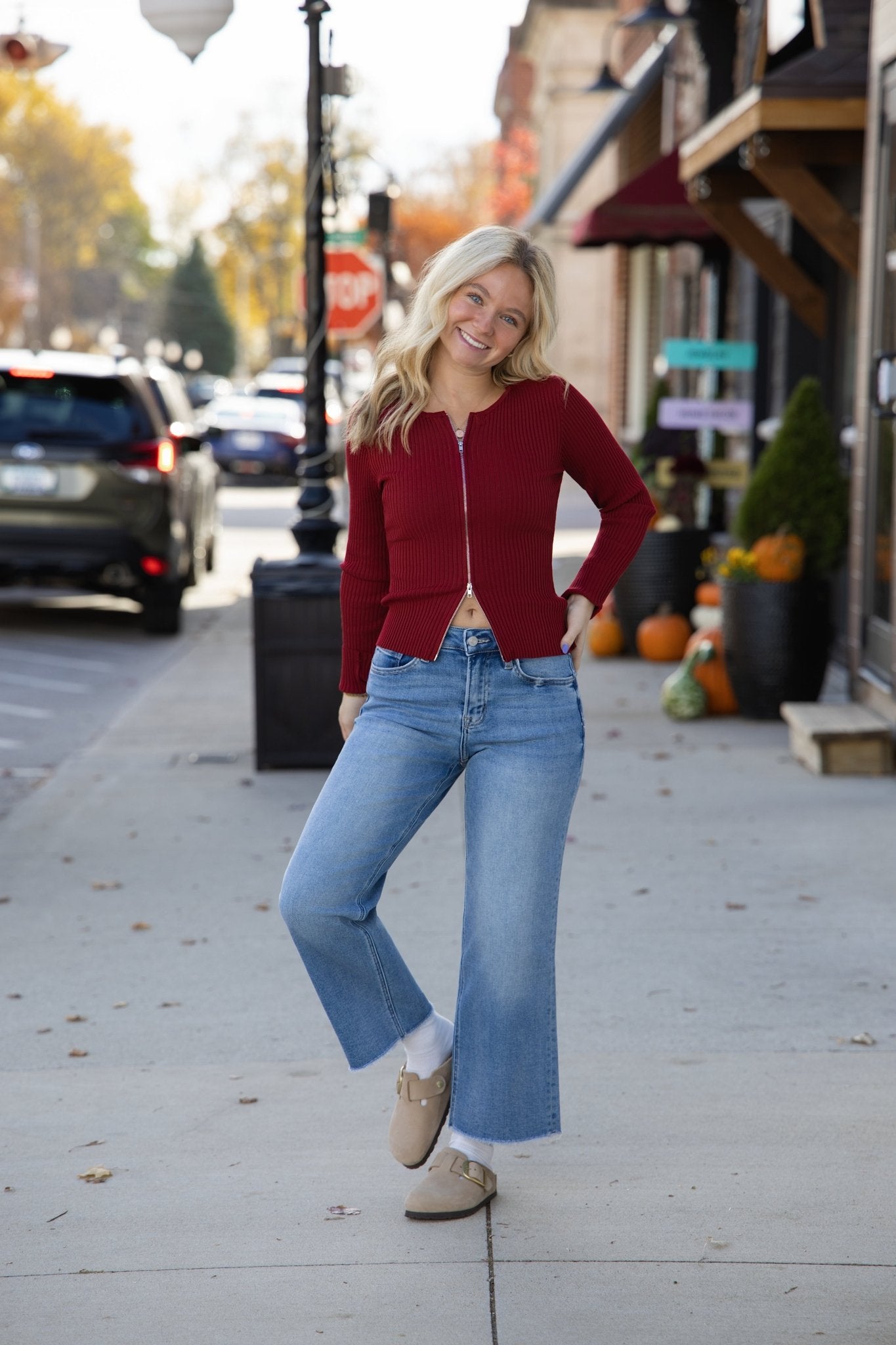 Be stylish and playful in our Two Way Zipper Knit Cardigan. Show off your quirky side with this ribbed, stretchy, and Merlot-colored piece. The 2-way zipper adds a fun touch to this cozy cardigan. Perfect for cooler days.