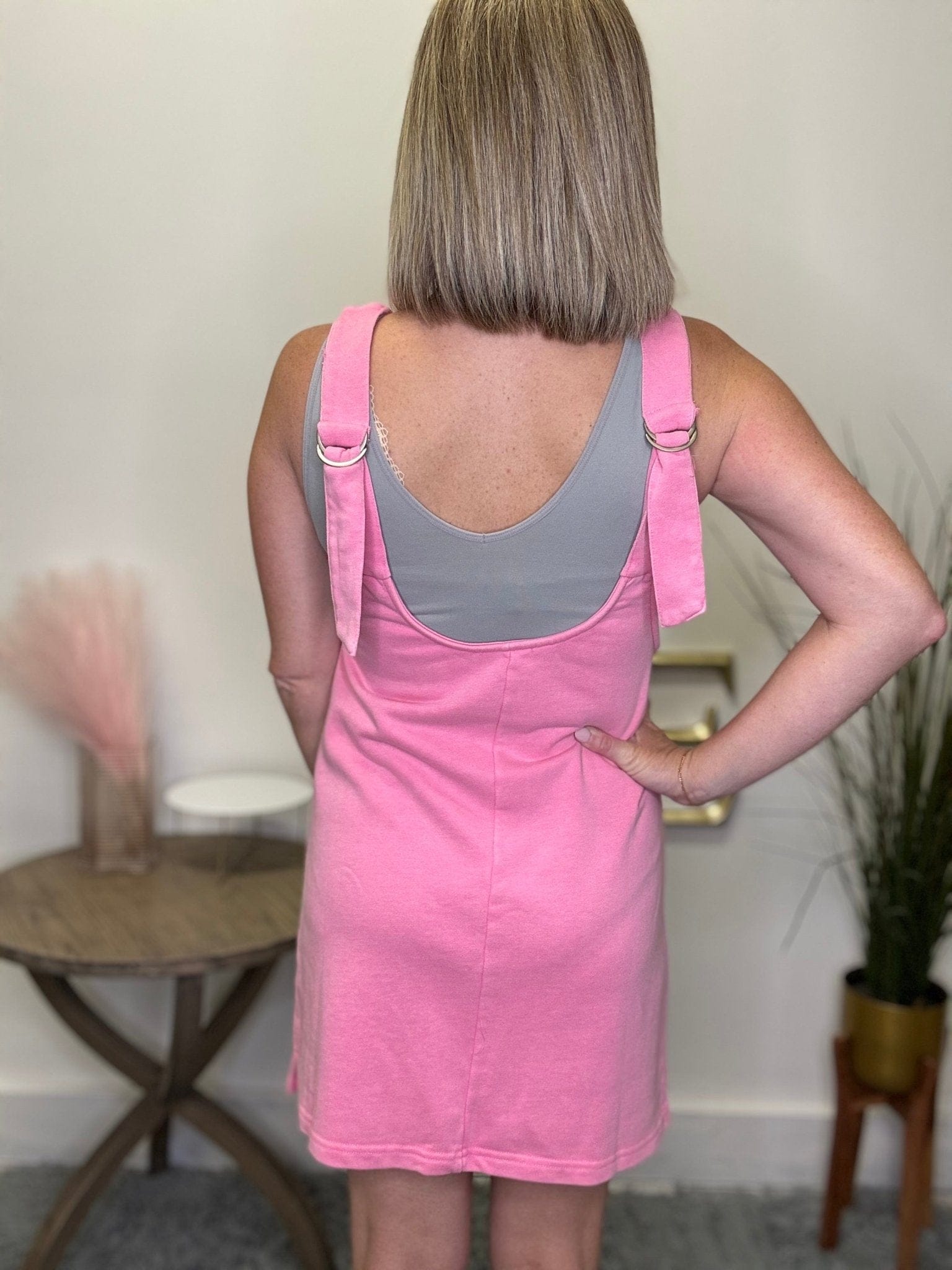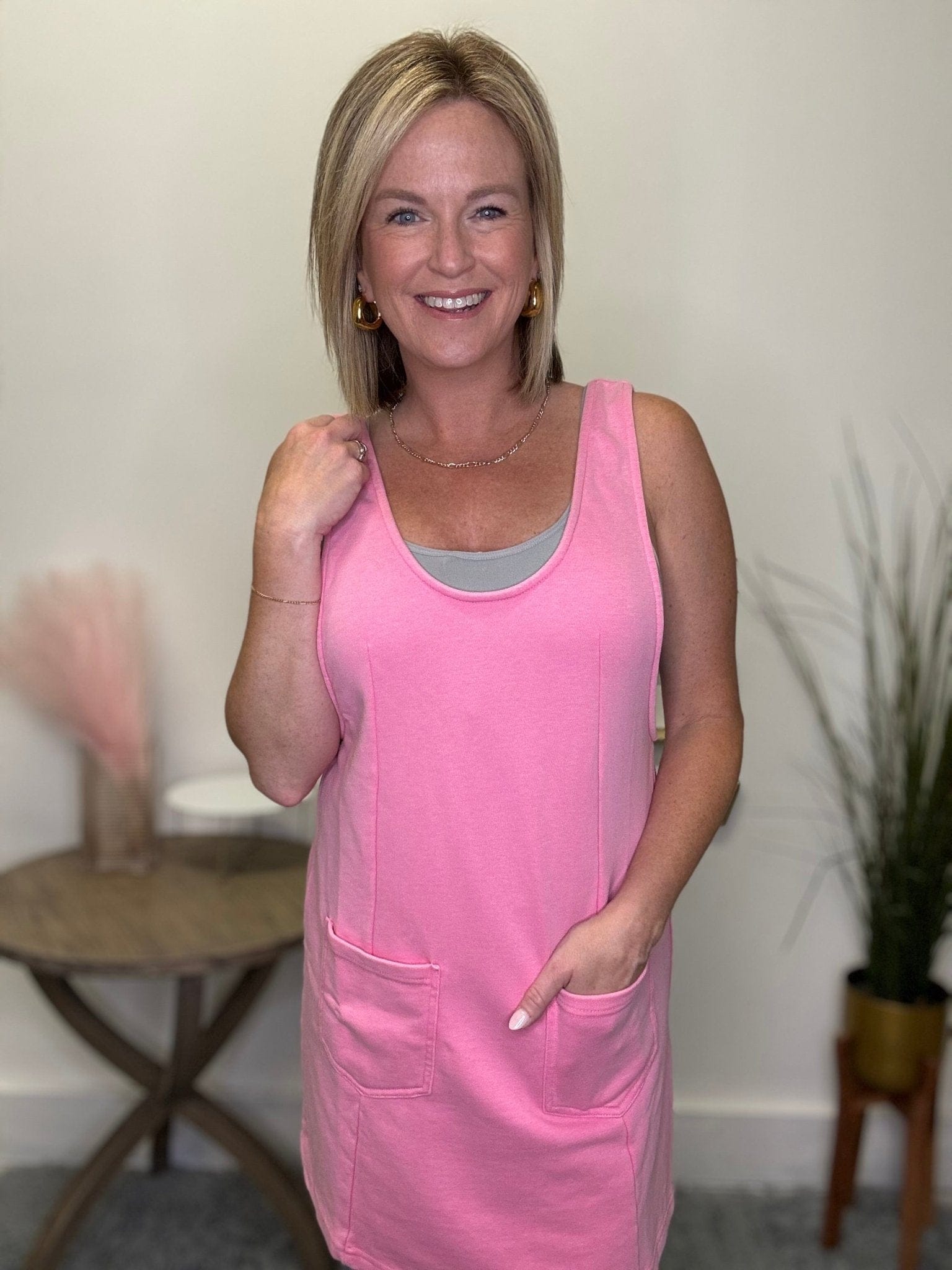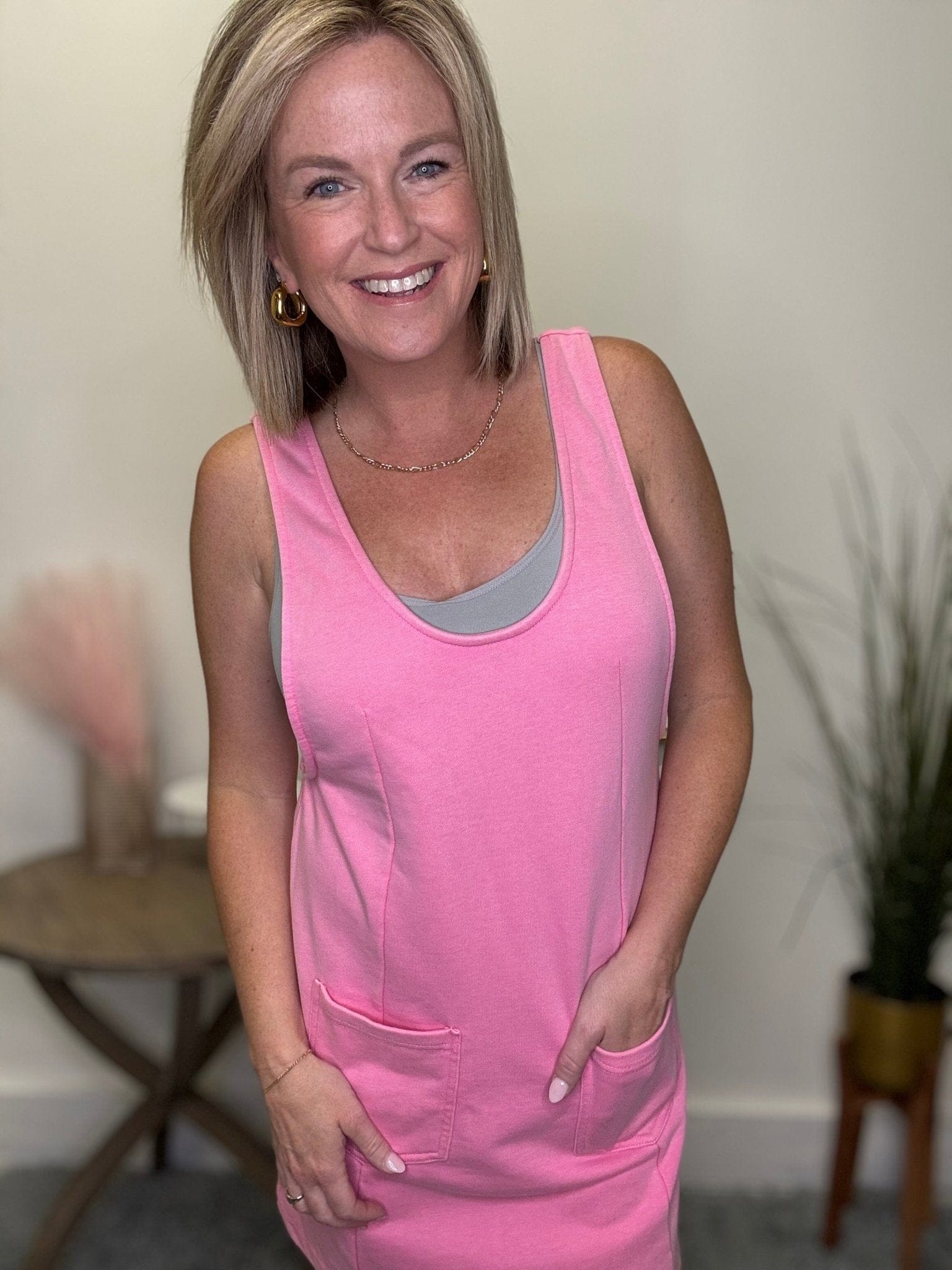 Get ready to turn heads in our Pretty Pink Sleeveless Jumper Dress! With its perfect pink color and adjustable straps, you'll be comfortable and cute all day long. Plus, who doesn't love front pockets? Perfect for any occasion!