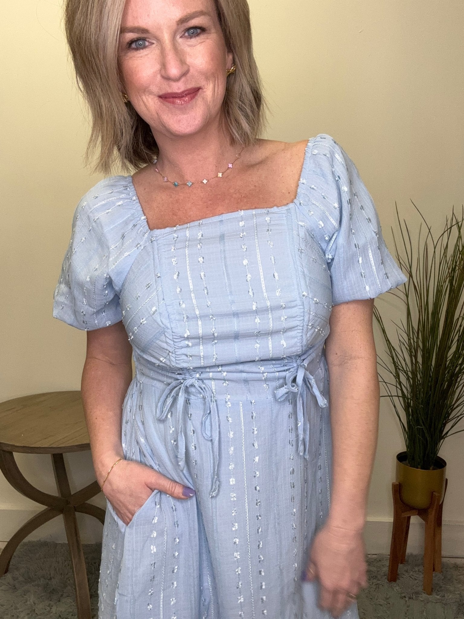 Introducing the Saylor Dress in Soft Blue, crafted from premium light blue fabric. This knee-length dress features a flattering square neckline with gathered detail and short bubble sleeves. Made with 100% polyester for a luxurious feel. Elevate your wardrobe with this beautiful and sophisticated piece.