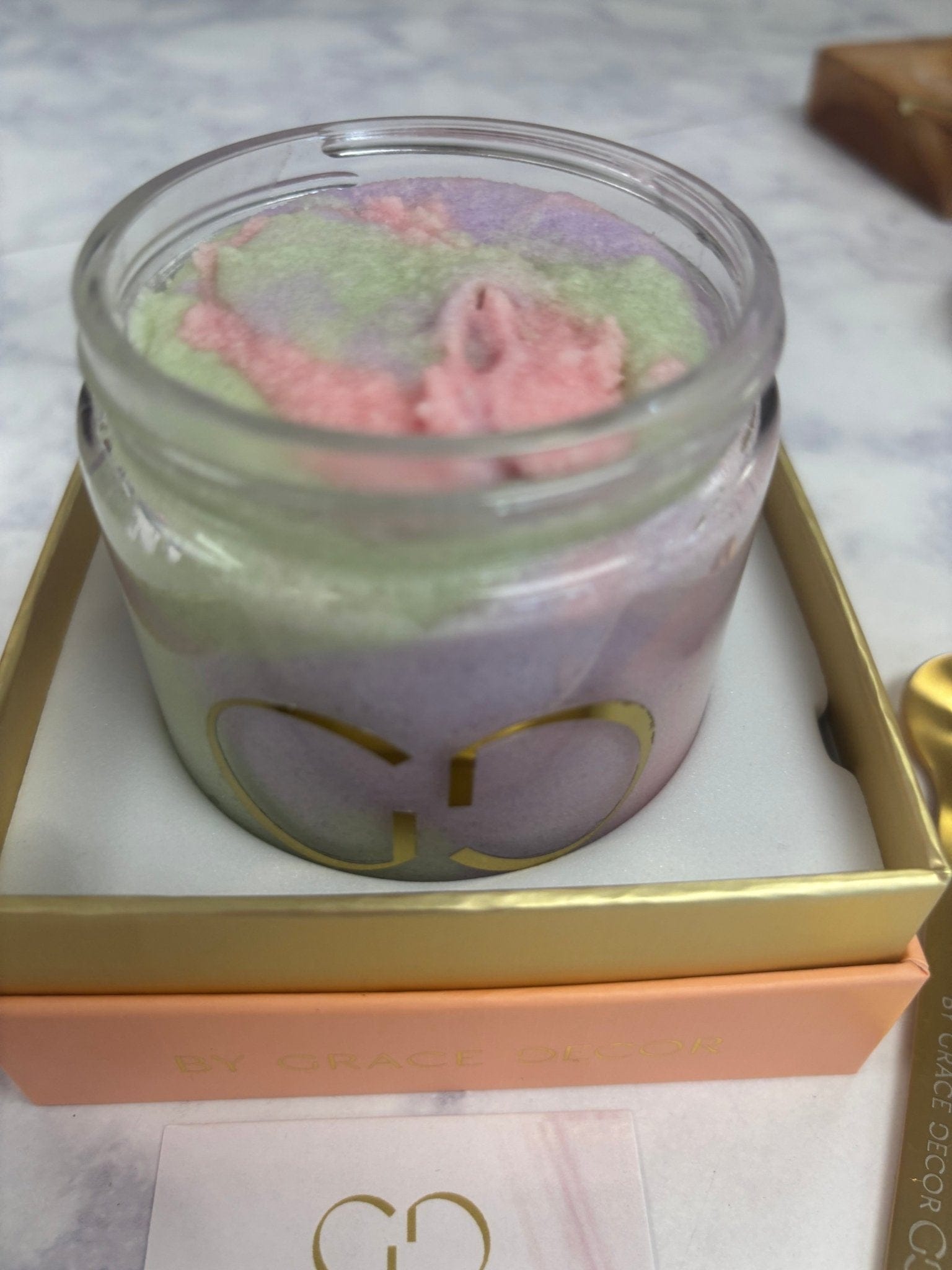 Ingredients: Sugar, mango butter, shea butter, coconut oil, avocado oil, vitamin E, Optiphen plus, essential oils