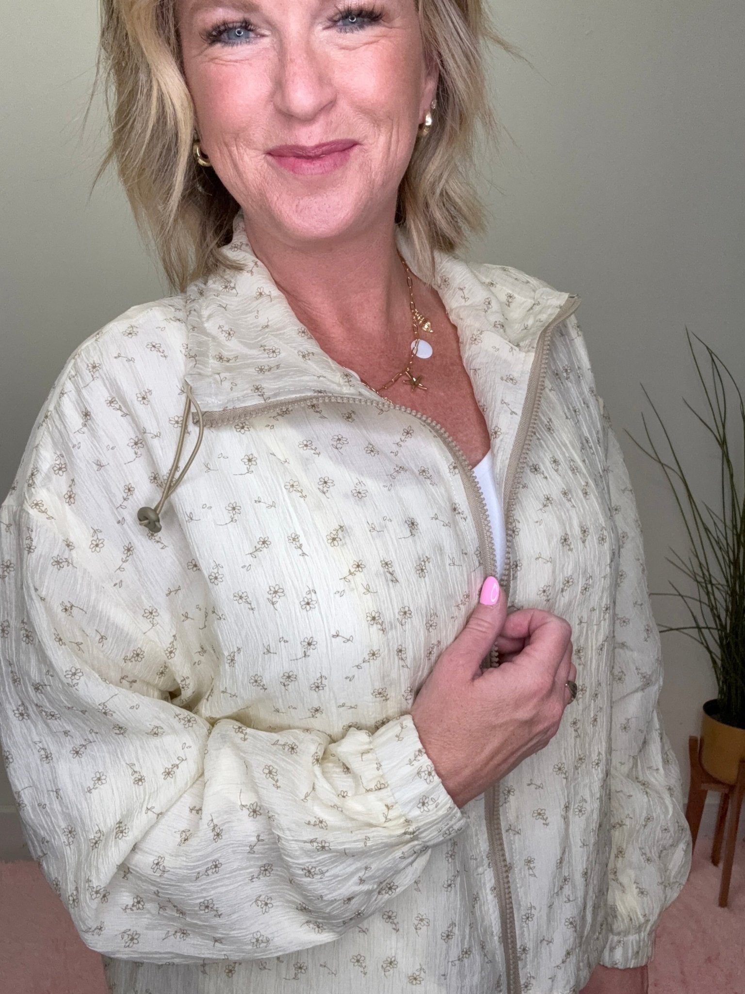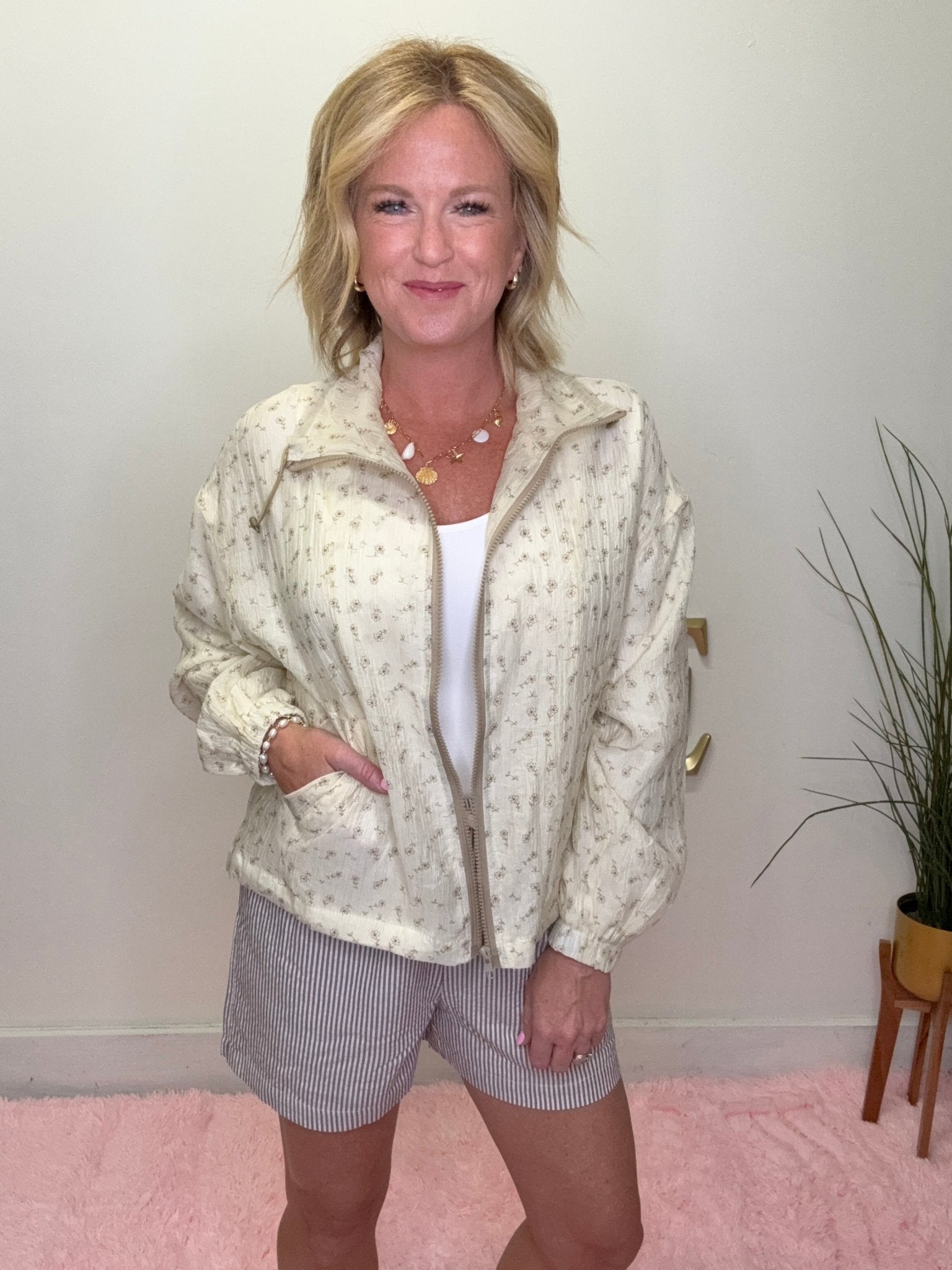 This jacket is the perfect mix of soft, feminine, and effortless. With its delicate floral print and flowy fit, it adds just the right amount of charm to any outfit—without feeling heavy or bulky.