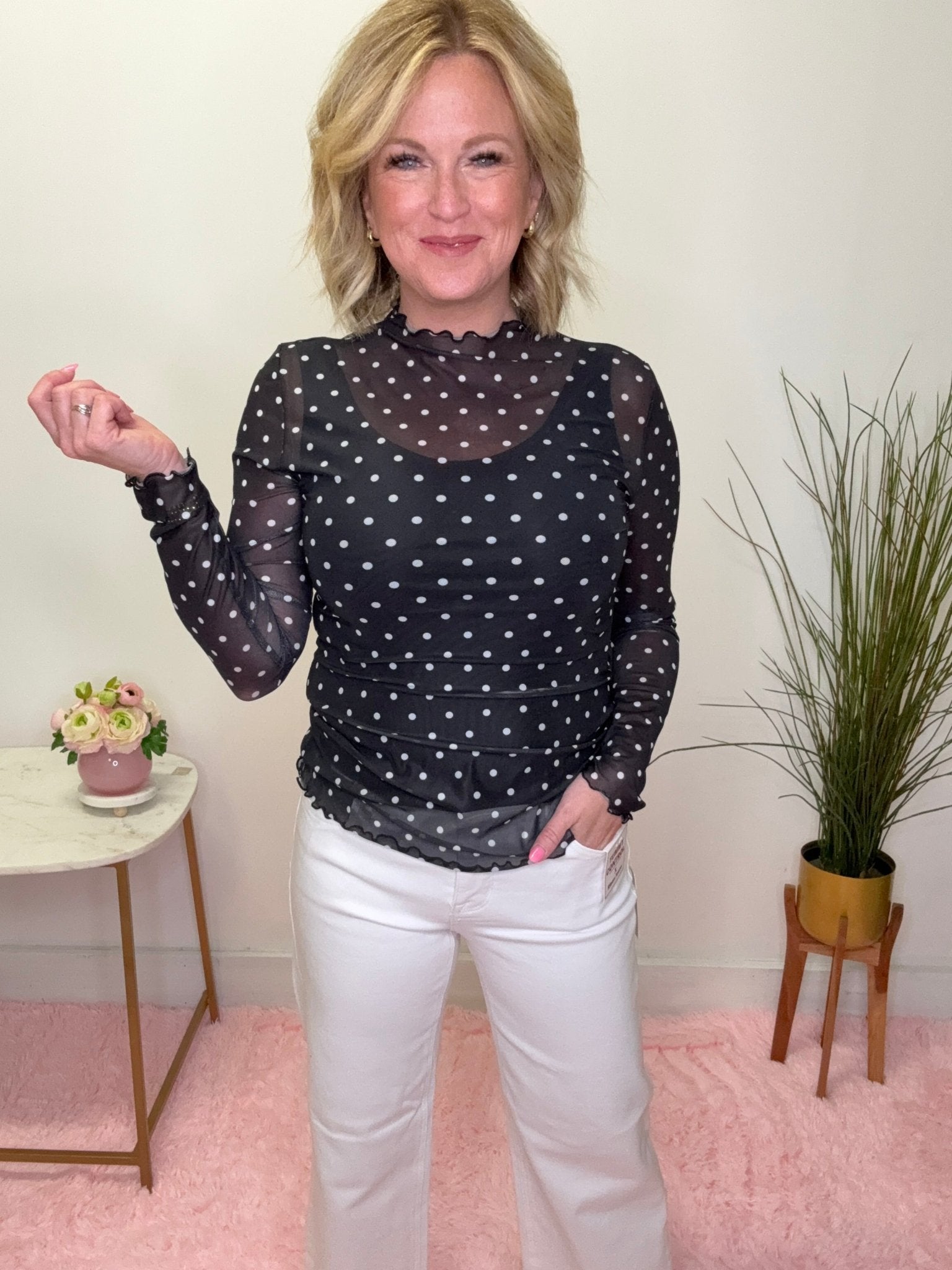 Polka Dot Mesh Long Sleeve Top in Black  sheer spring 2026 Ella Chic Boutique Sewn and Seen