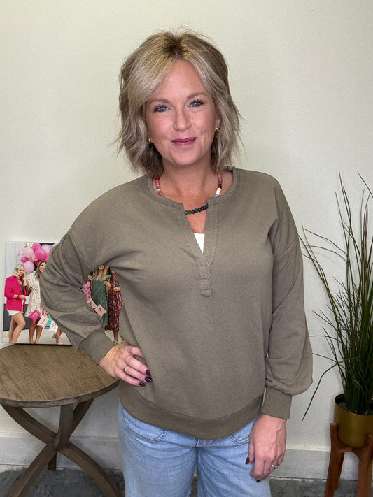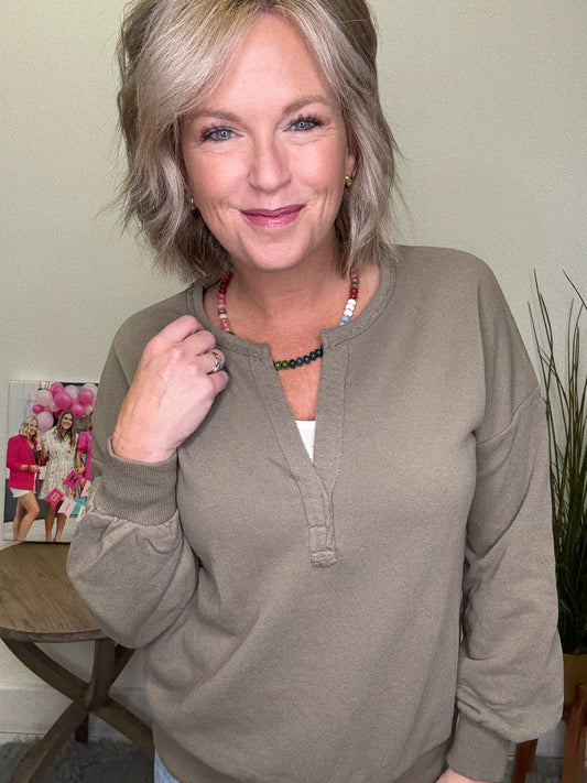 The Last Time I Checked Pullover Sweatshirt is a must-have for anyone looking for easy, fun style. With its split neck and great cut and fit, this sweatshirt is perfect for anyone who wants to make a statement without sacrificing comfort. It’s a perfect dusty taupe with a nice touch of olive.