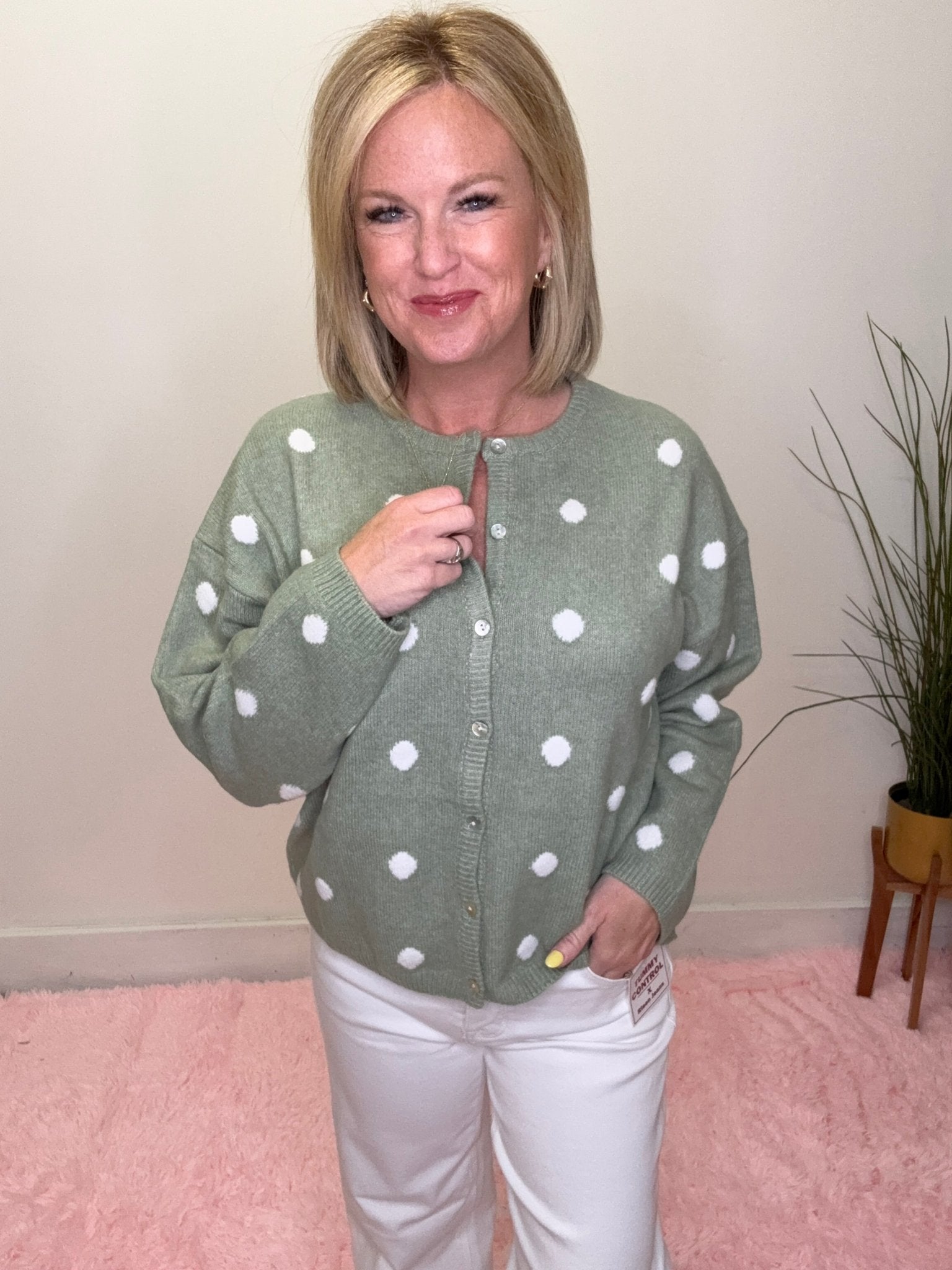 The cutest little layer your closet’s been waiting for 💚 This soft sage cardigan with classic white polka dots is equal parts cozy and charming—perfect for throwing on and instantly looking put together.