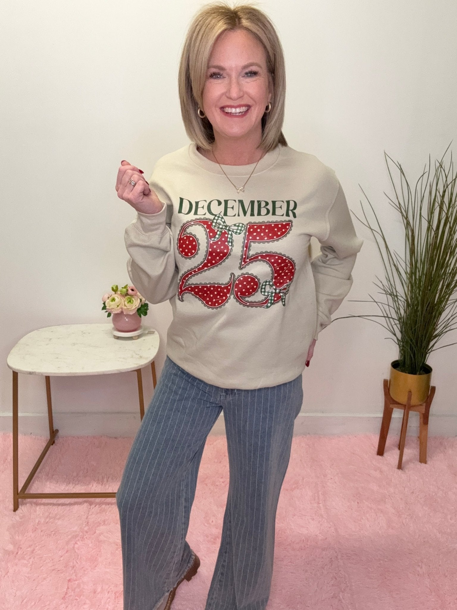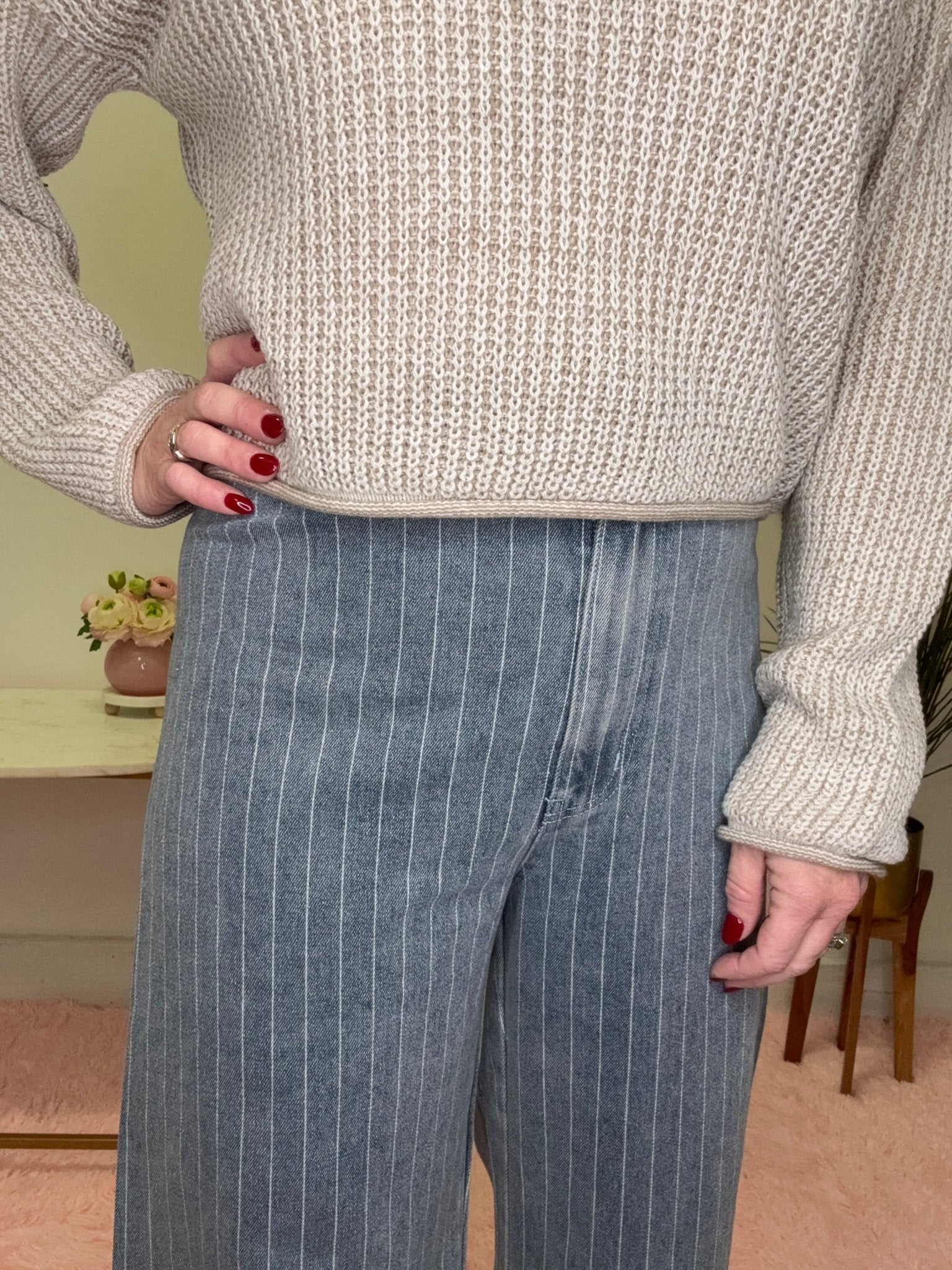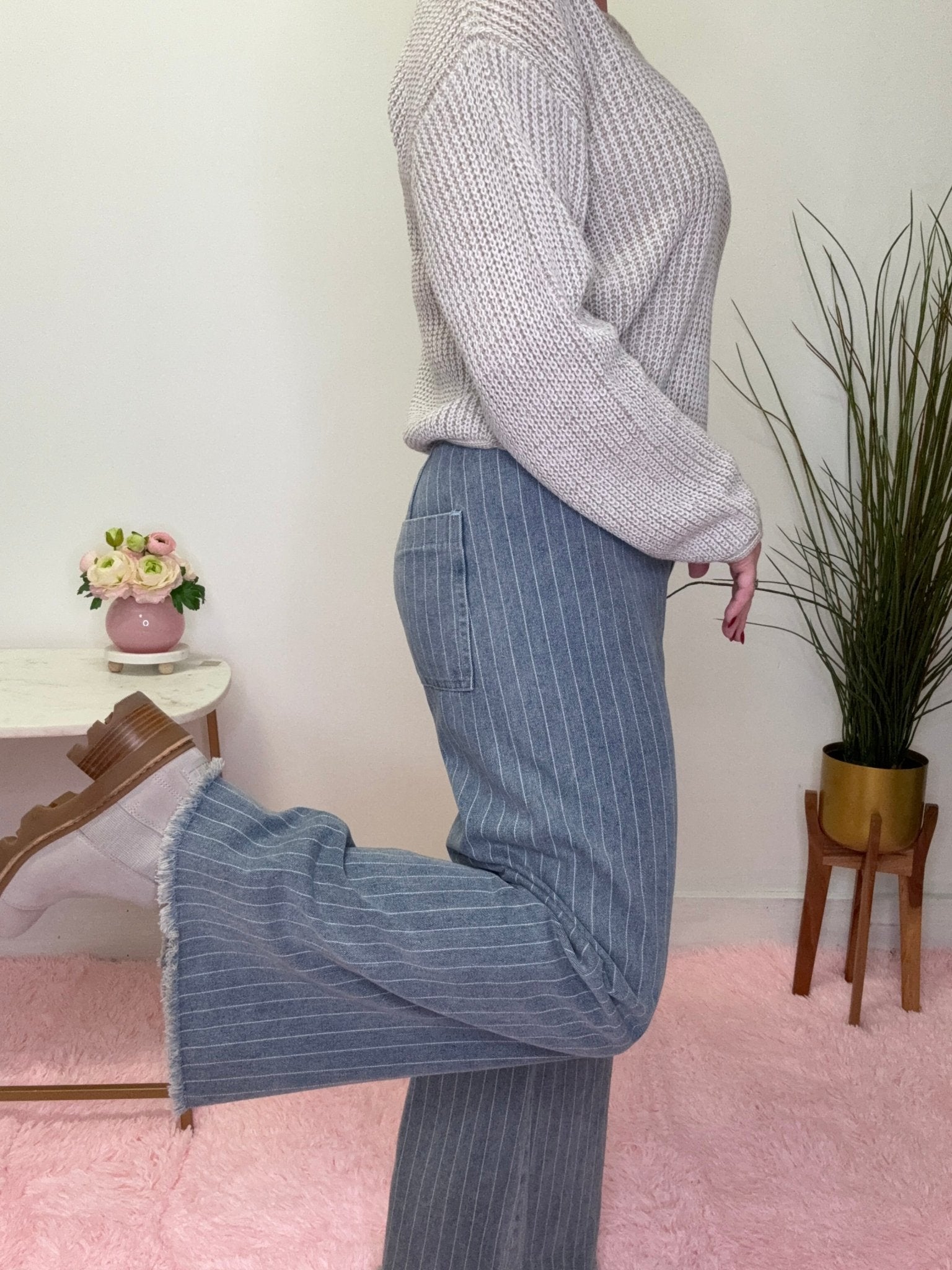 These high-waisted denim pants bring effortless style with classic pinstripes and a relaxed wide-leg silhouette. The medium-weight fabric offers comfortable everyday wear, while the frayed hem adds a laid-back, trendy edge. Perfect for dressing up or down, they're a versatile staple that works with everything in your closet!
