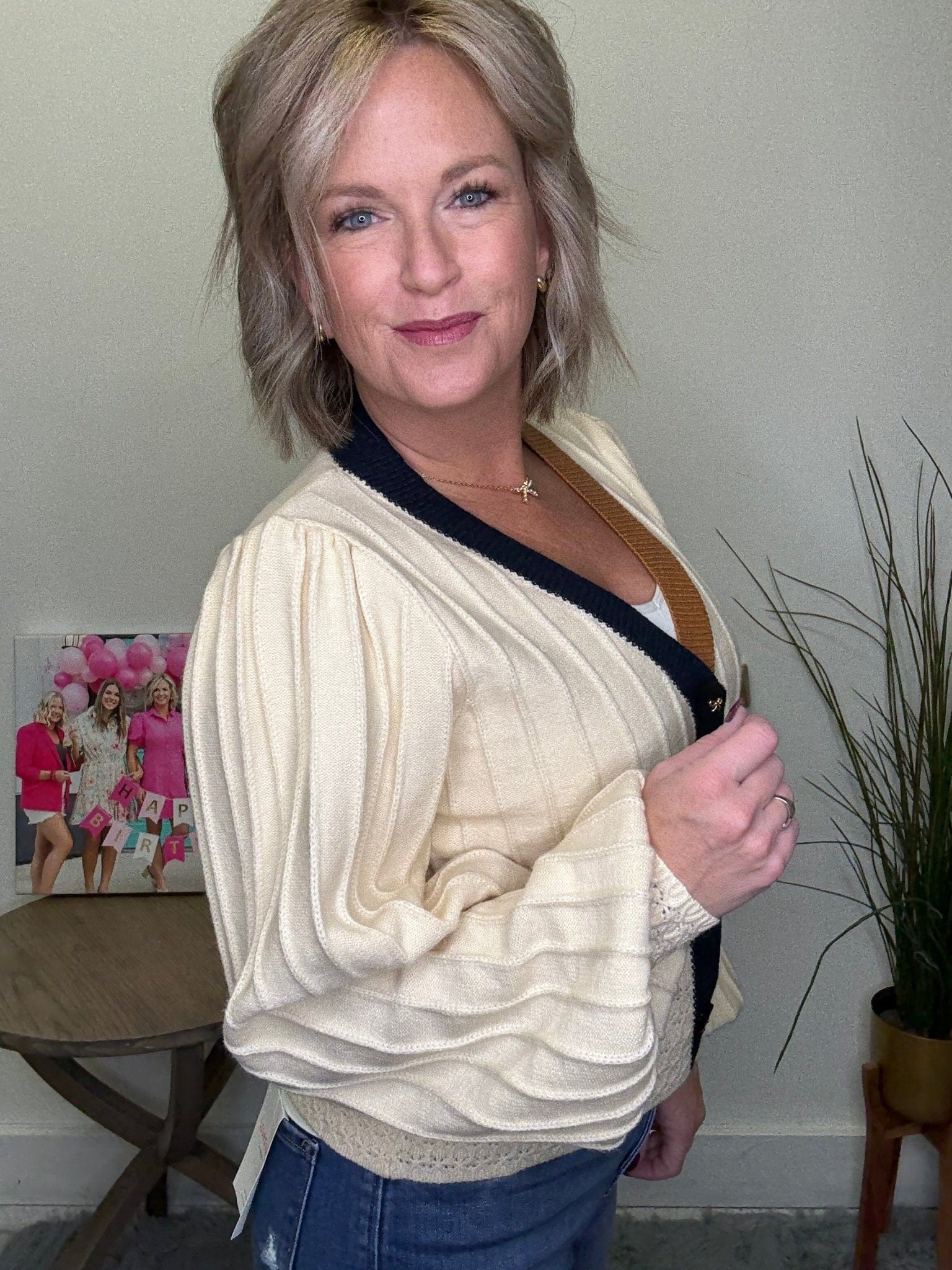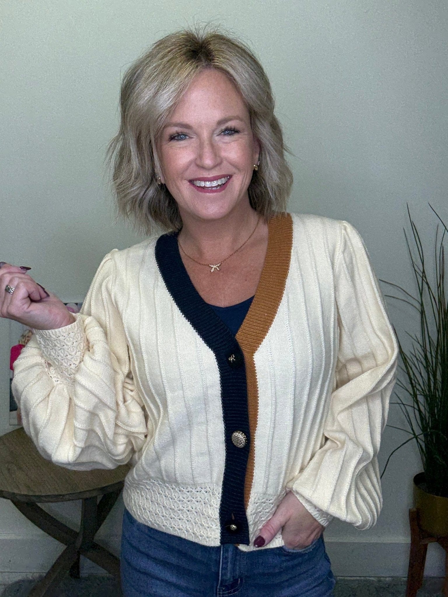 Add a touch of flair to your wardrobe with Be the Best Detailed Cardigan by THML. This ribbed cardigan features unique button details and styles, along with blouse sleeves, cuff details, and navy and rust trim. Your new go-to for compliments!