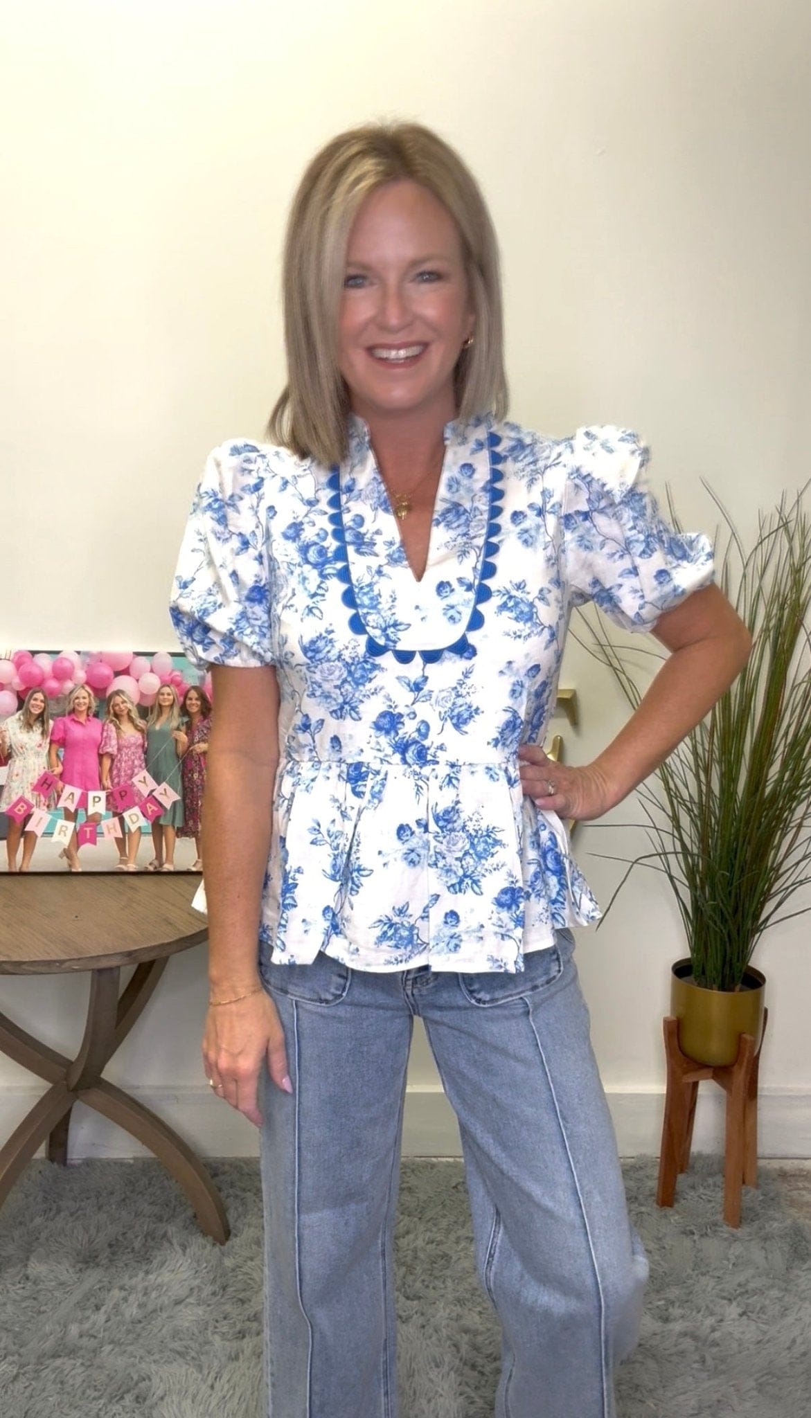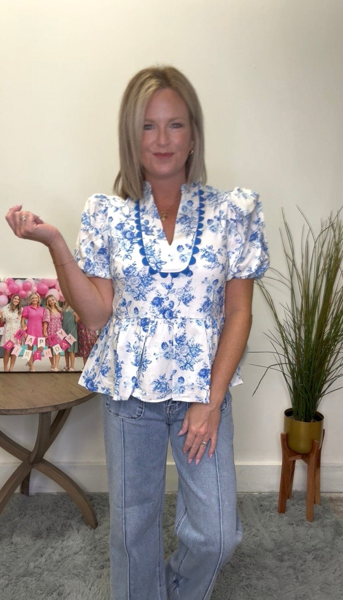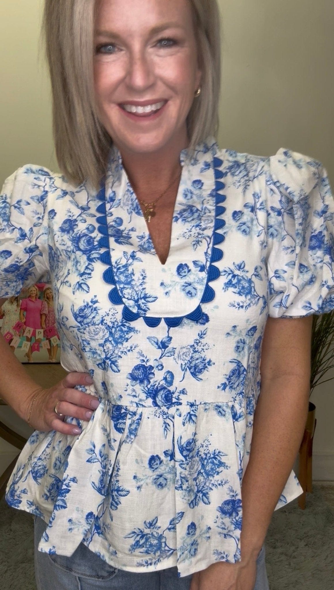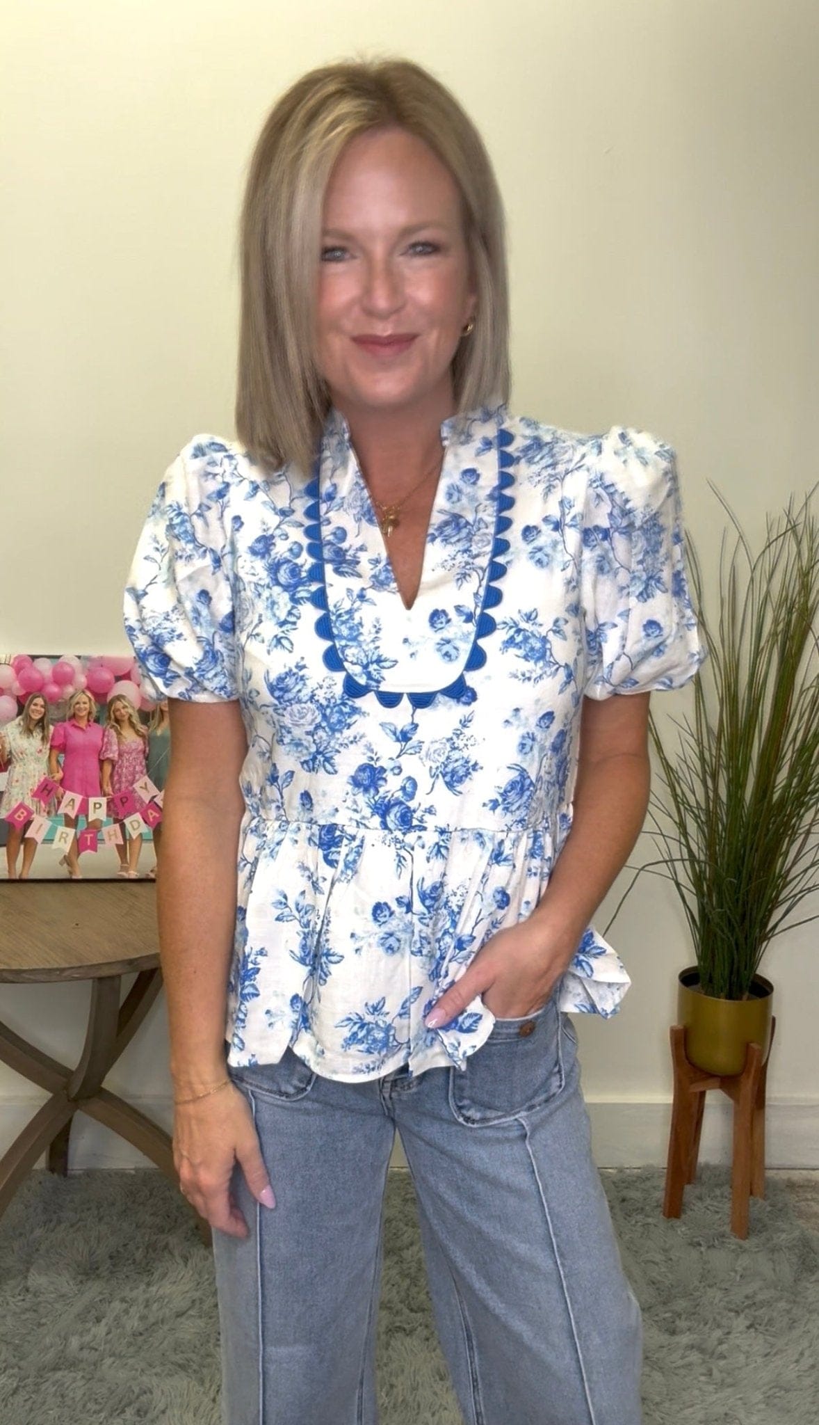 This playful top boasts a trendy blue floral print and scallop trim, with a v-neck and puff short sleeves for a feminine touch. The peplum fit adds just the right amount of flair. So cute, you'll be the envy of any outing.