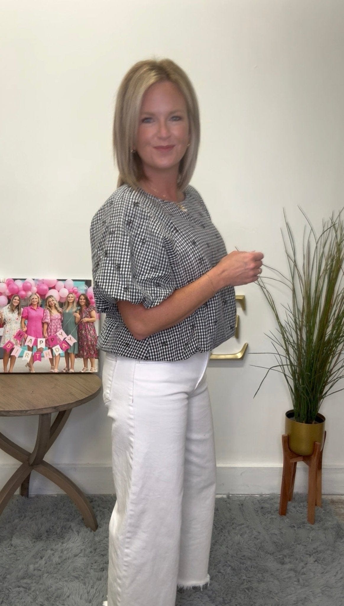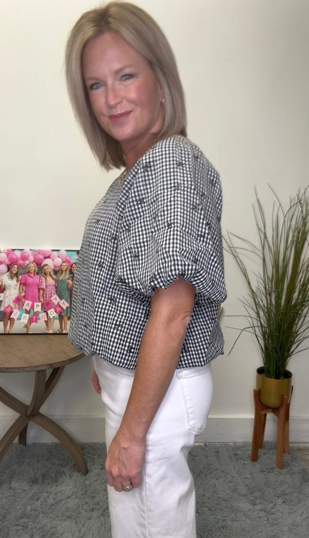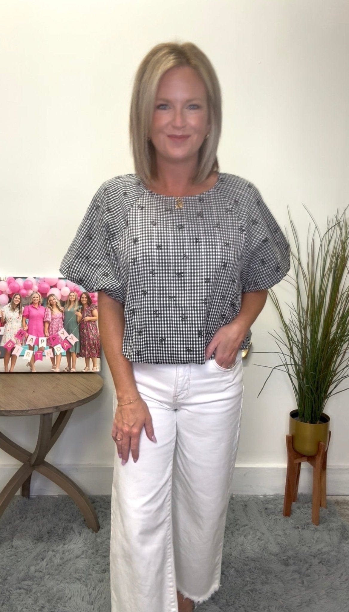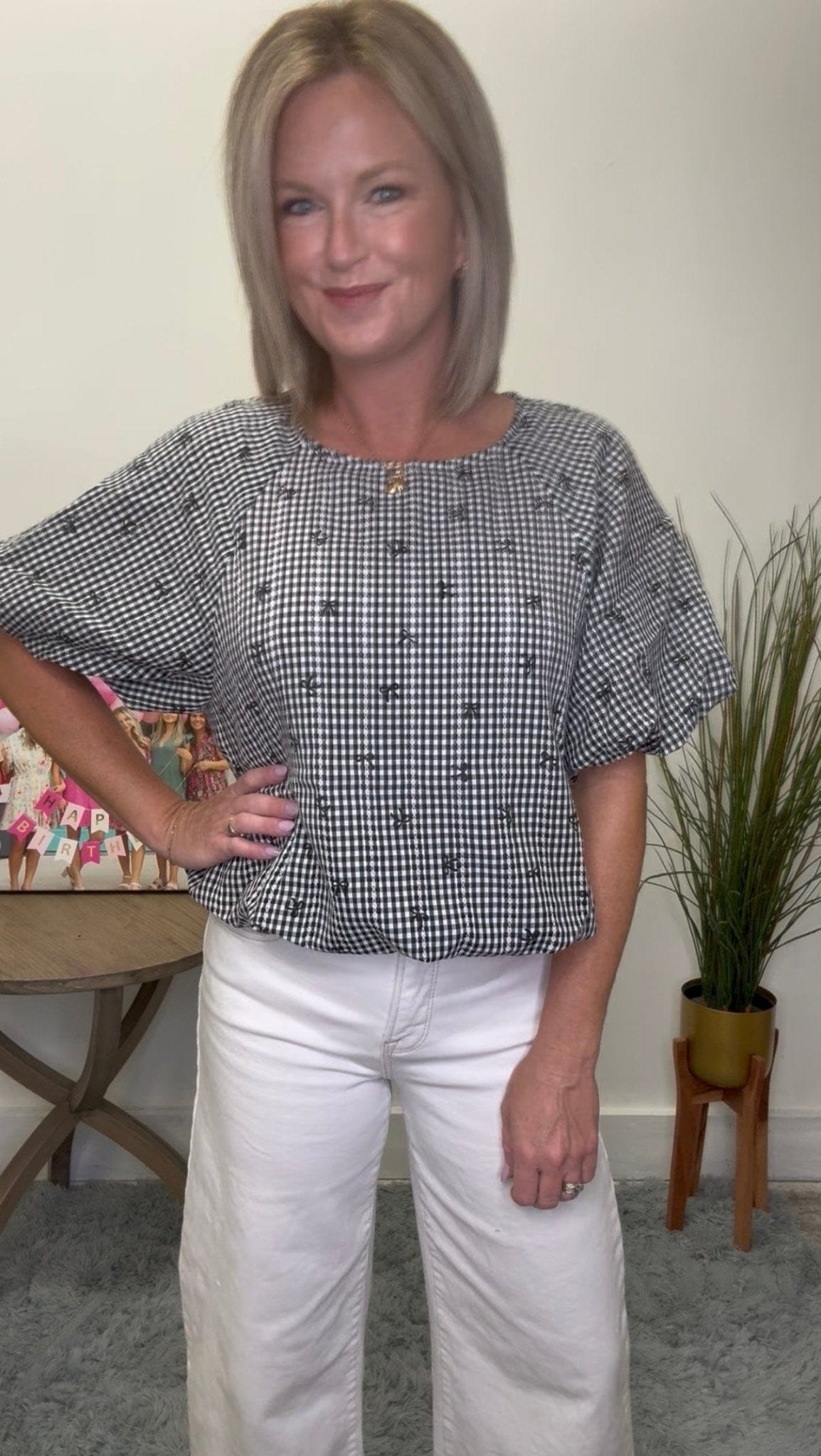 Be chic and playful in our Gingham Mini Bow Print Top! Featuring embroidered mini bows on a black and white gingham print, this top is both cute and trendy. The bubble hem and sleeves add a touch of uniqueness. Perfect for the fashion-forward who don't take themselves too seriously!