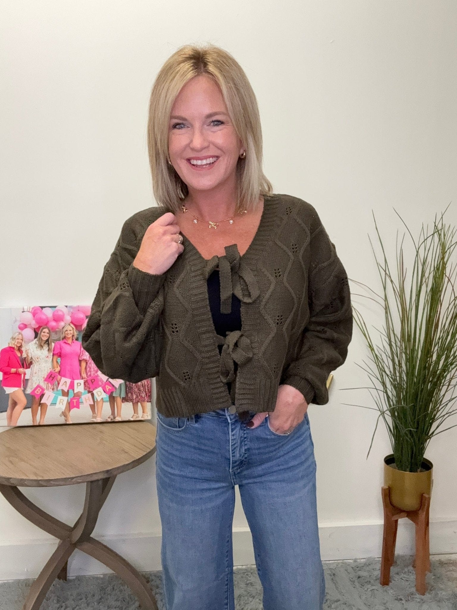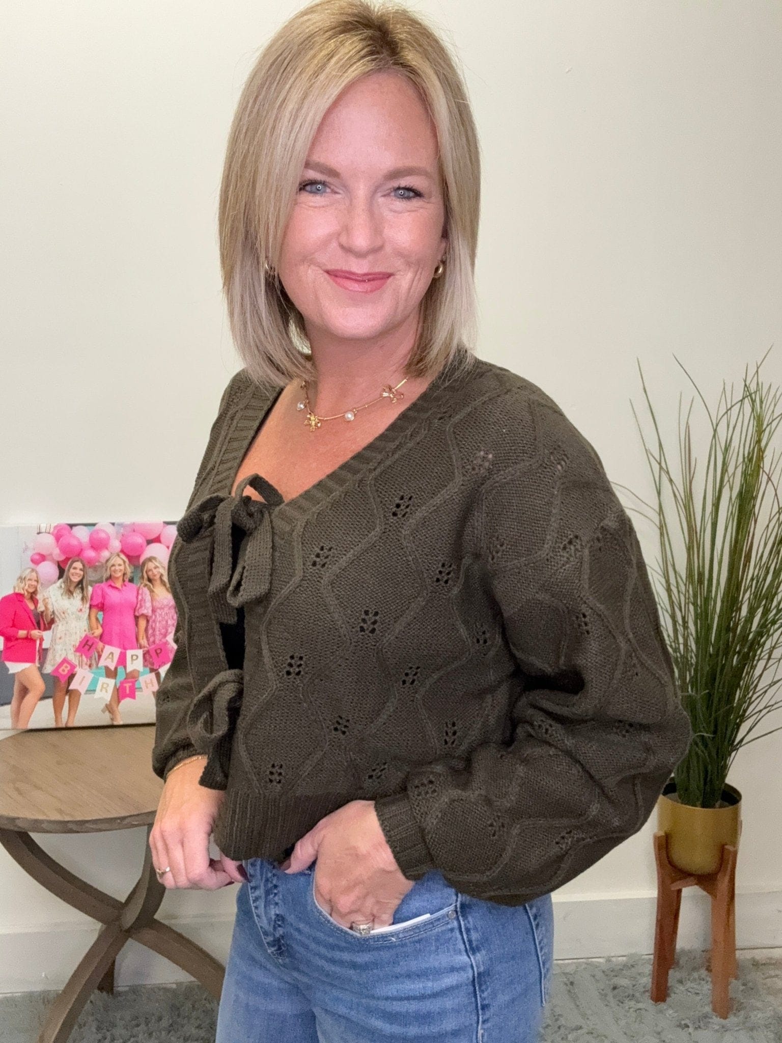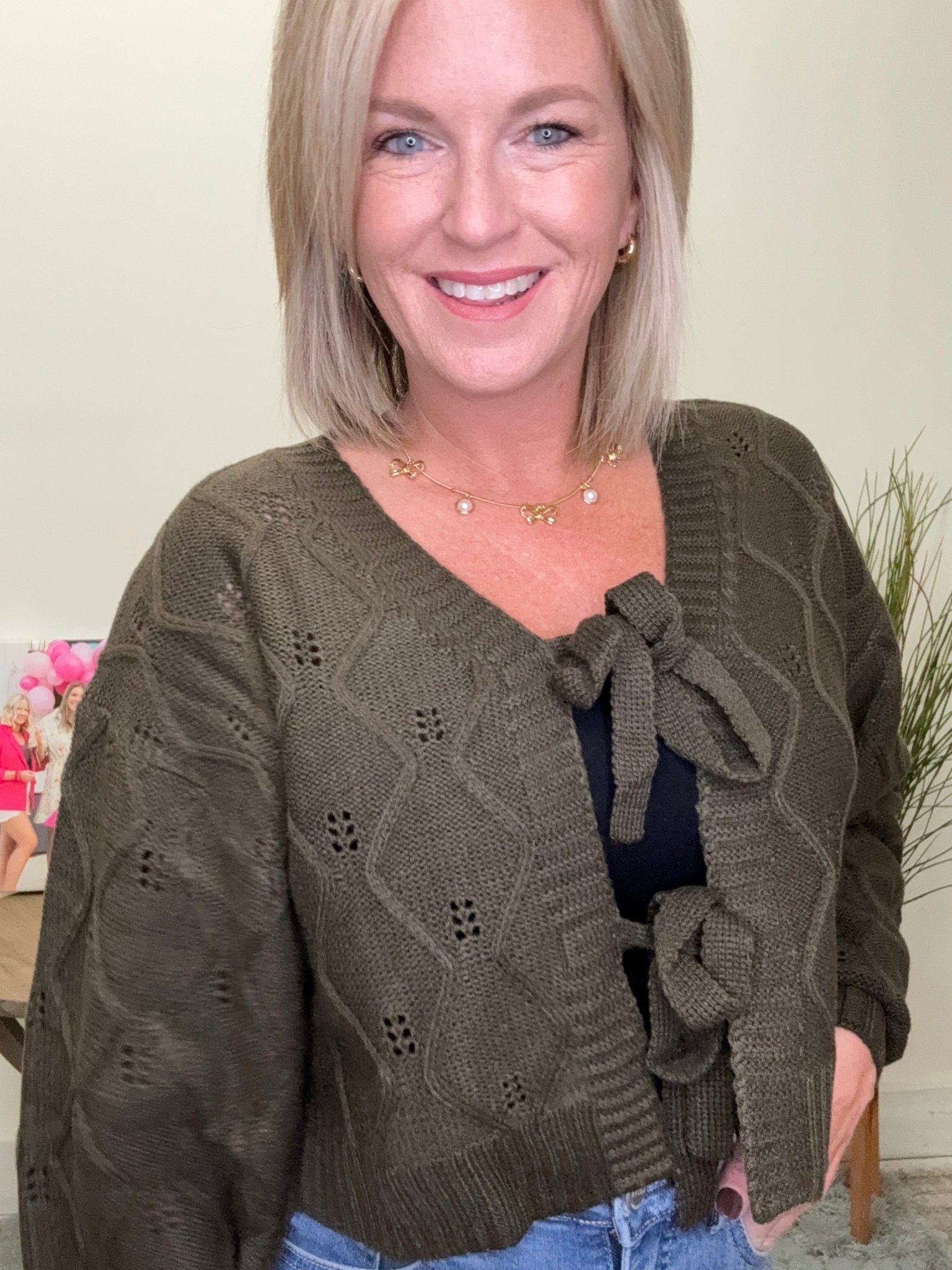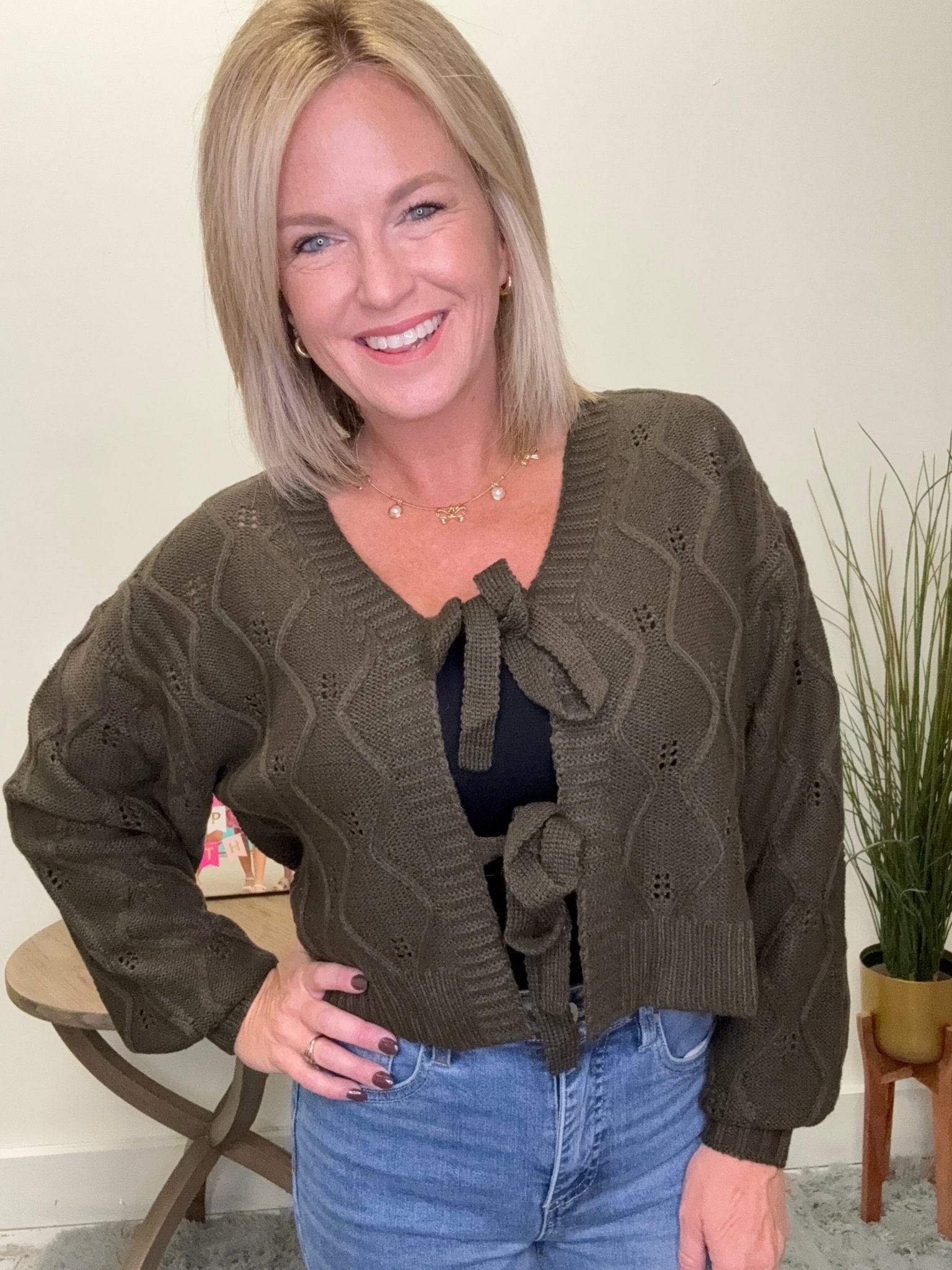 Add a touch of whimsy to your wardrobe with our Knotted Long Sleeve Cardigan in Thyme Leaf. This cropped cardigan features a beautifully crafted knit and a unique tie-front closure in a deep olive color. Perfect for layering or adding some personality to any outfit.