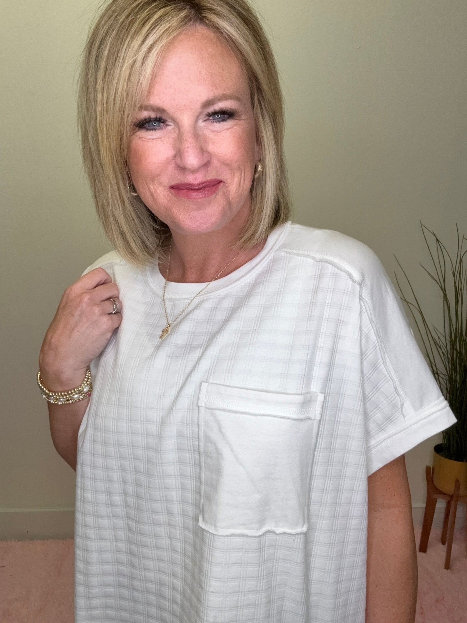 If you love those effortless, throw-on-and-go pieces, this one’s calling your name. Light, airy, and just a little elevated, this white top brings that relaxed-but-put-together vibe we all want for busy days.