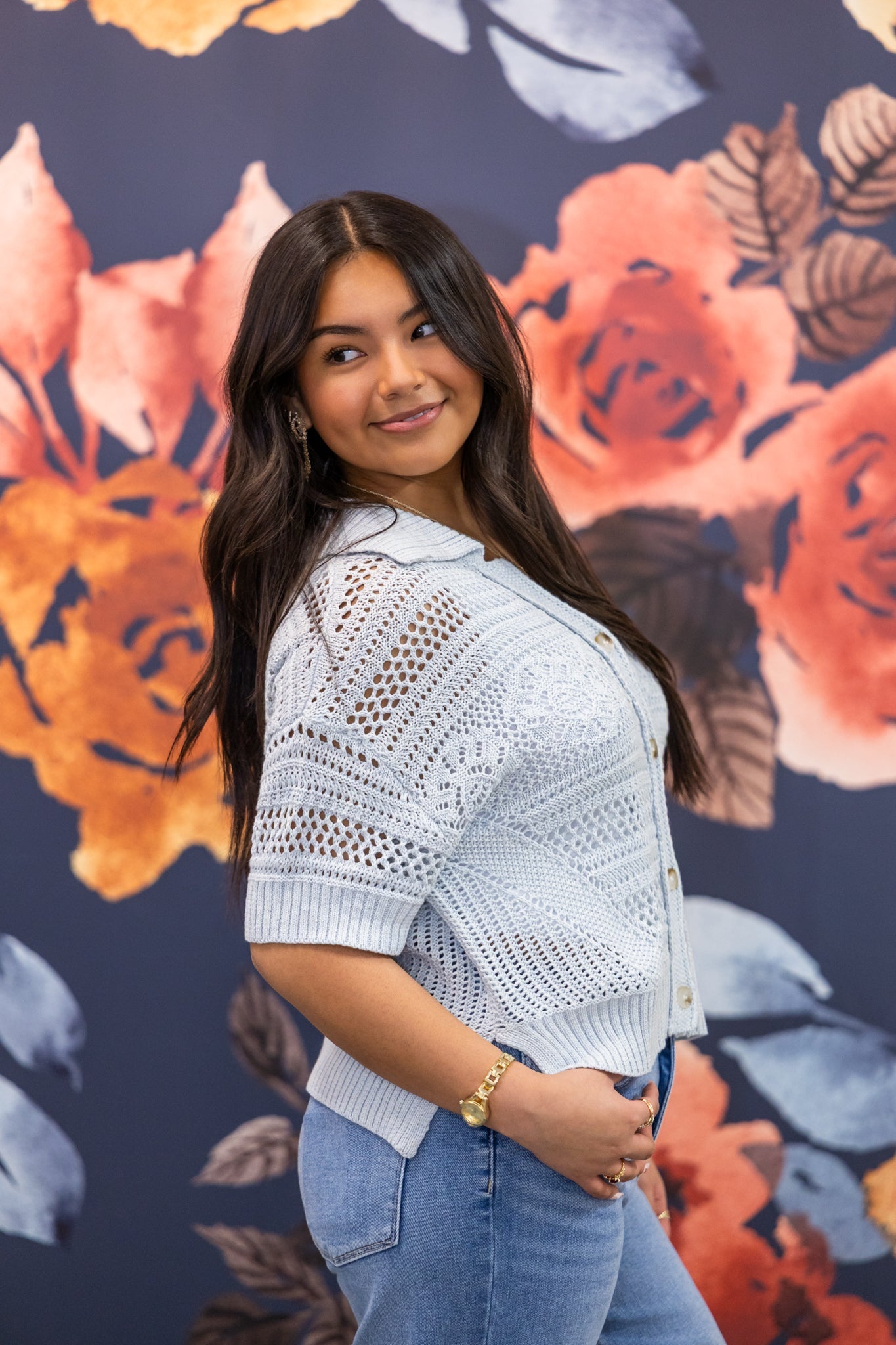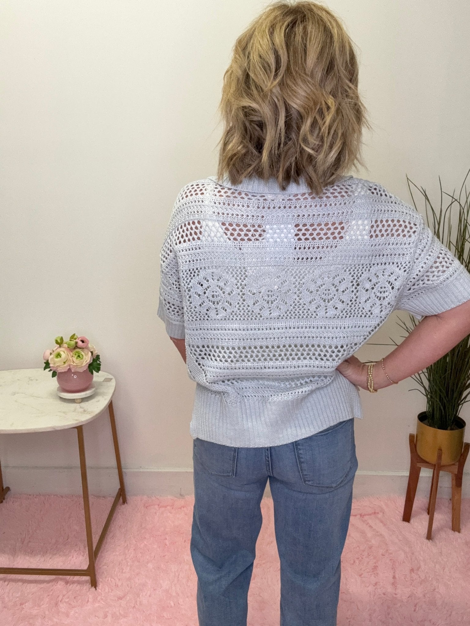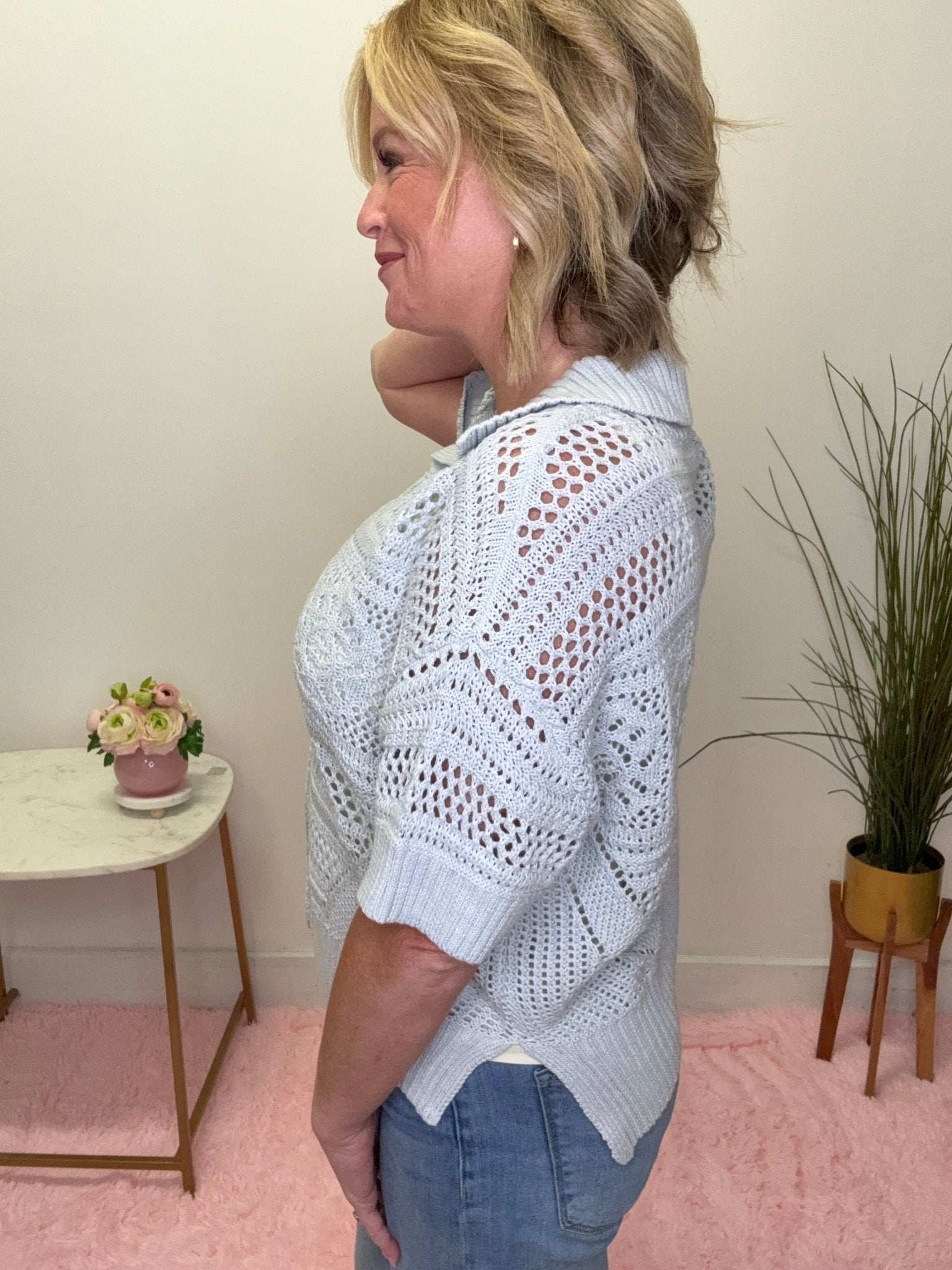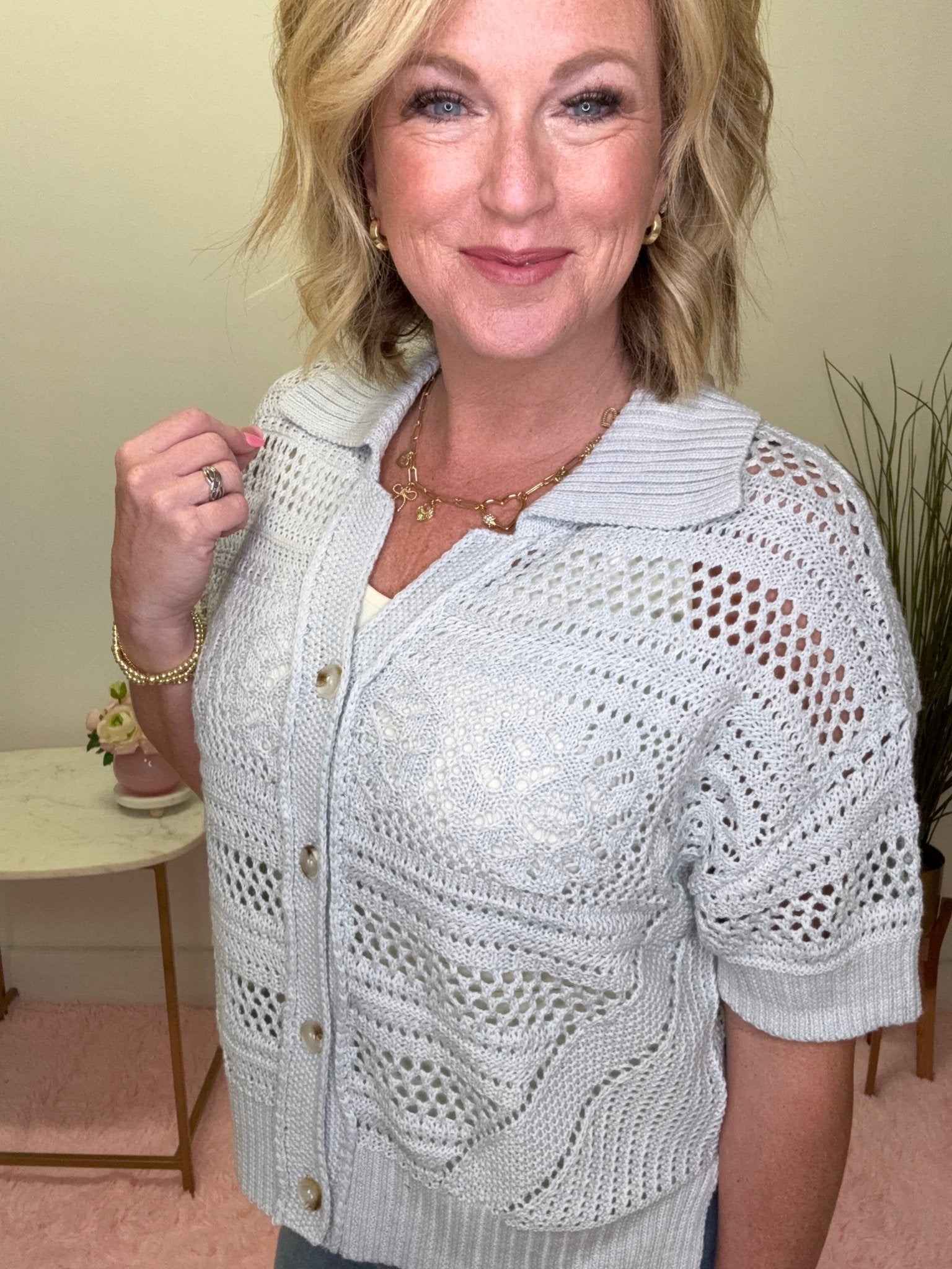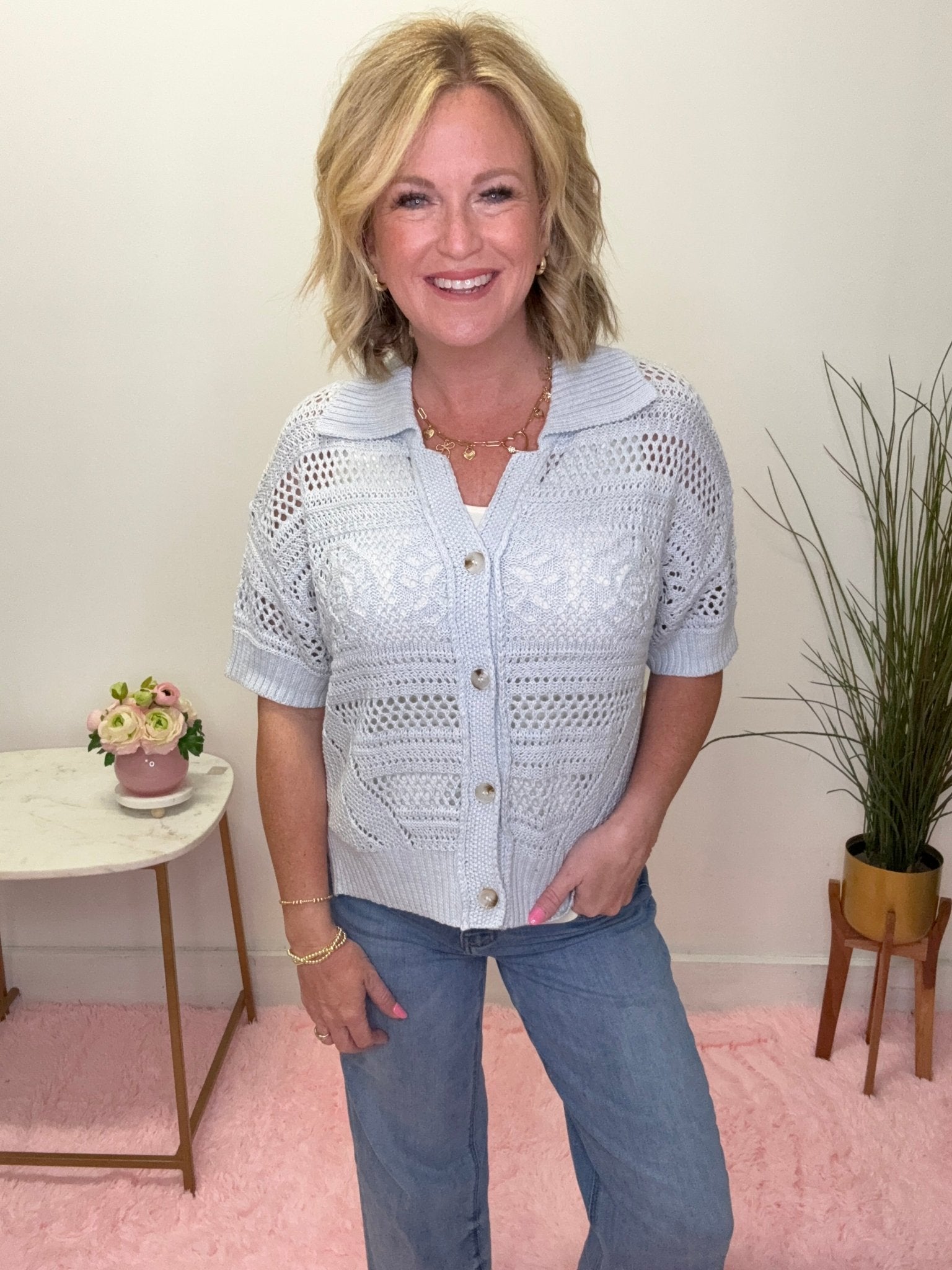 Soft, feminine, and effortlessly chic 💙 This light blue open knit cardigan top is the perfect lightweight layer for spring and summer. Featuring delicate open knit detailing, a flattering relaxed fit, and a classic button front with a subtle collar, this piece feels polished but still easy to wear.
