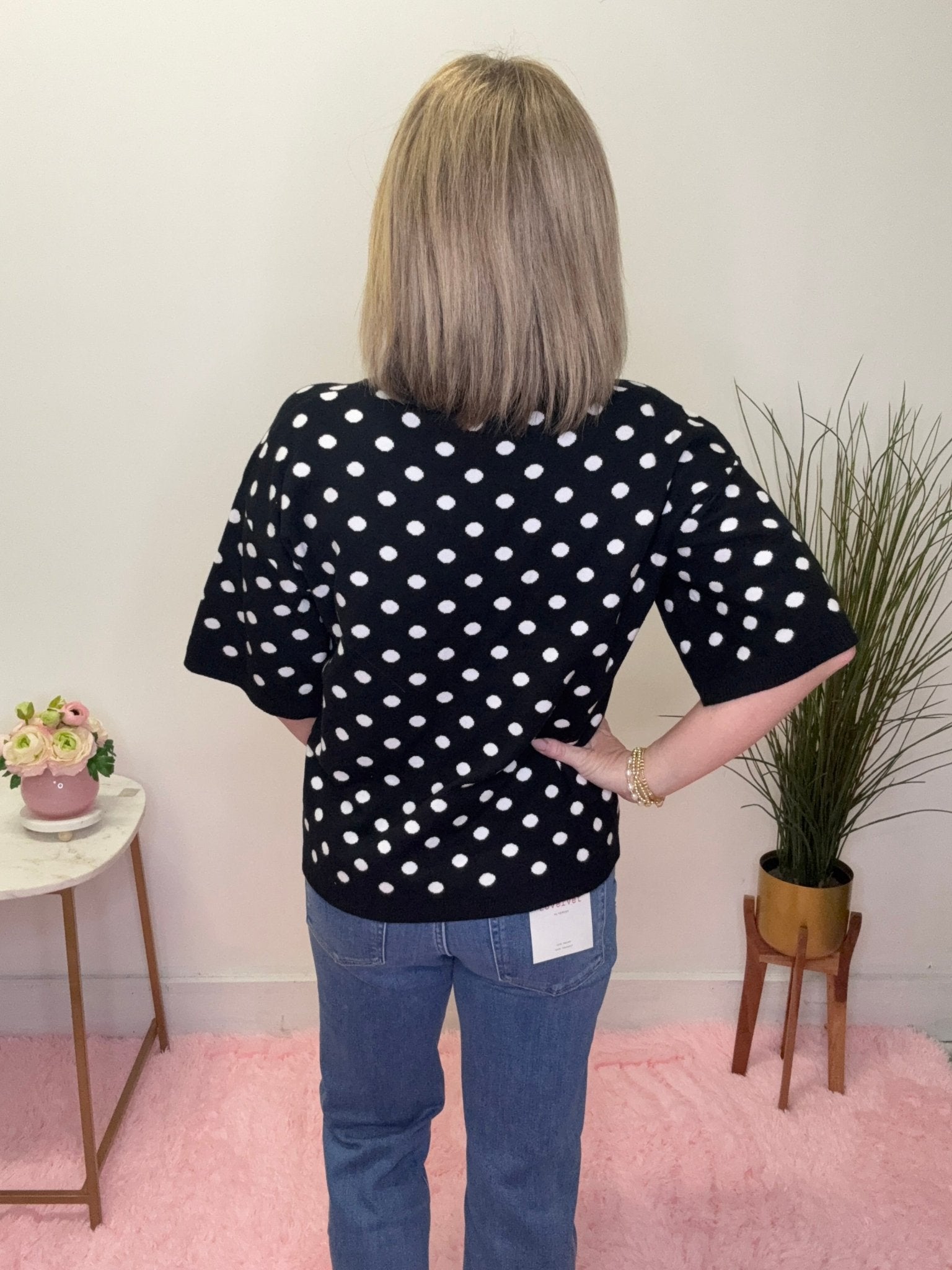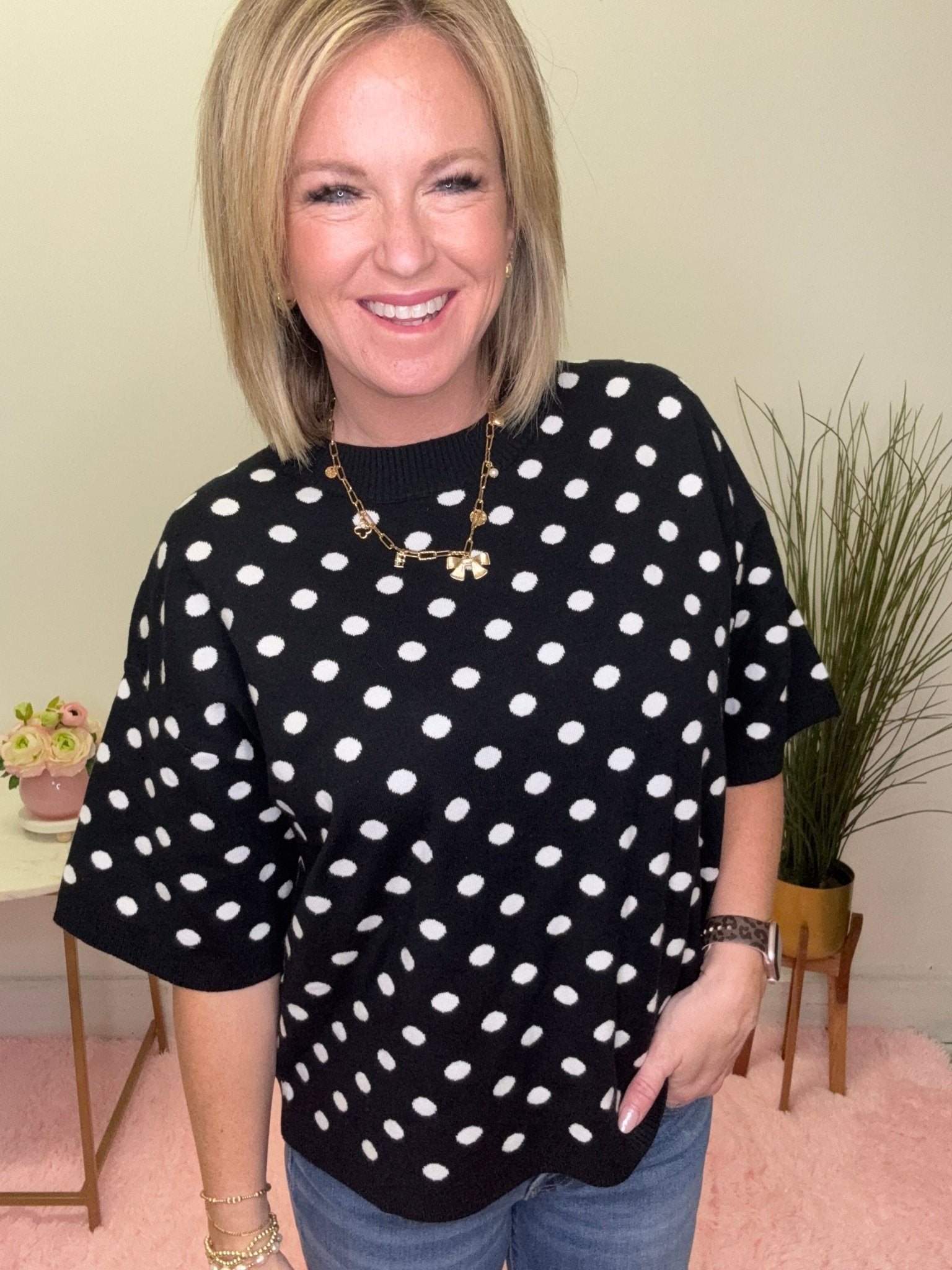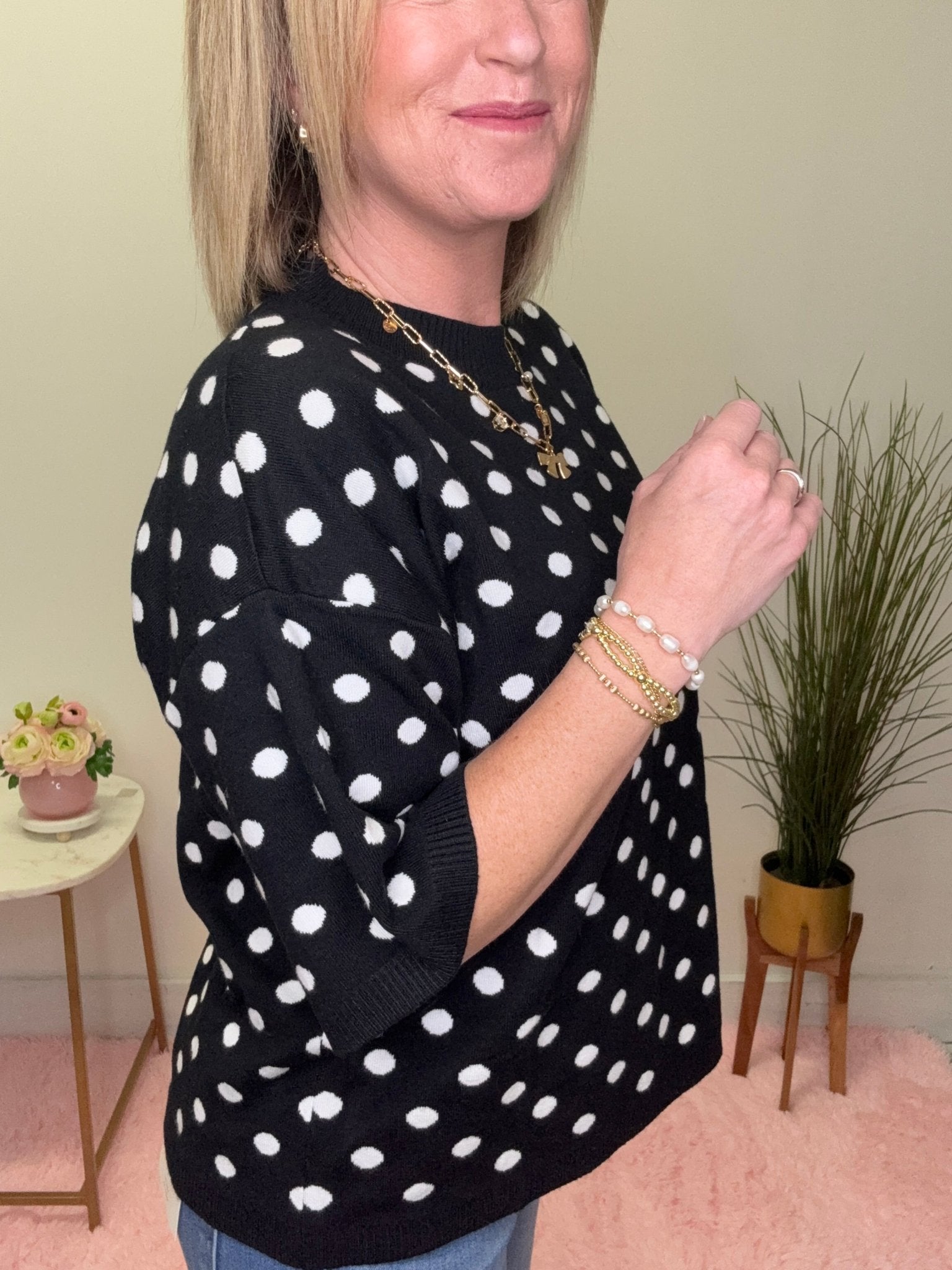 Classic, playful, and effortlessly chic 🖤 This black and white polka dot knit top is the perfect piece for adding a little personality to your everyday outfits. The timeless polka dot pattern paired with the soft knit fabric creates a look that’s both polished and comfortable.