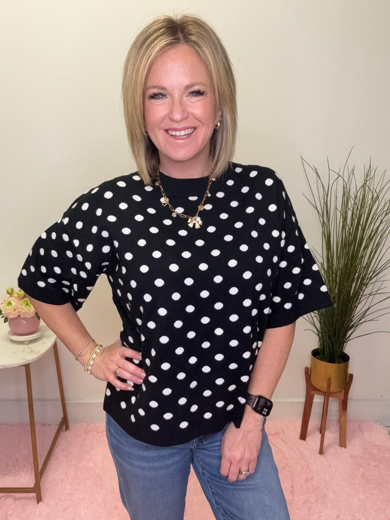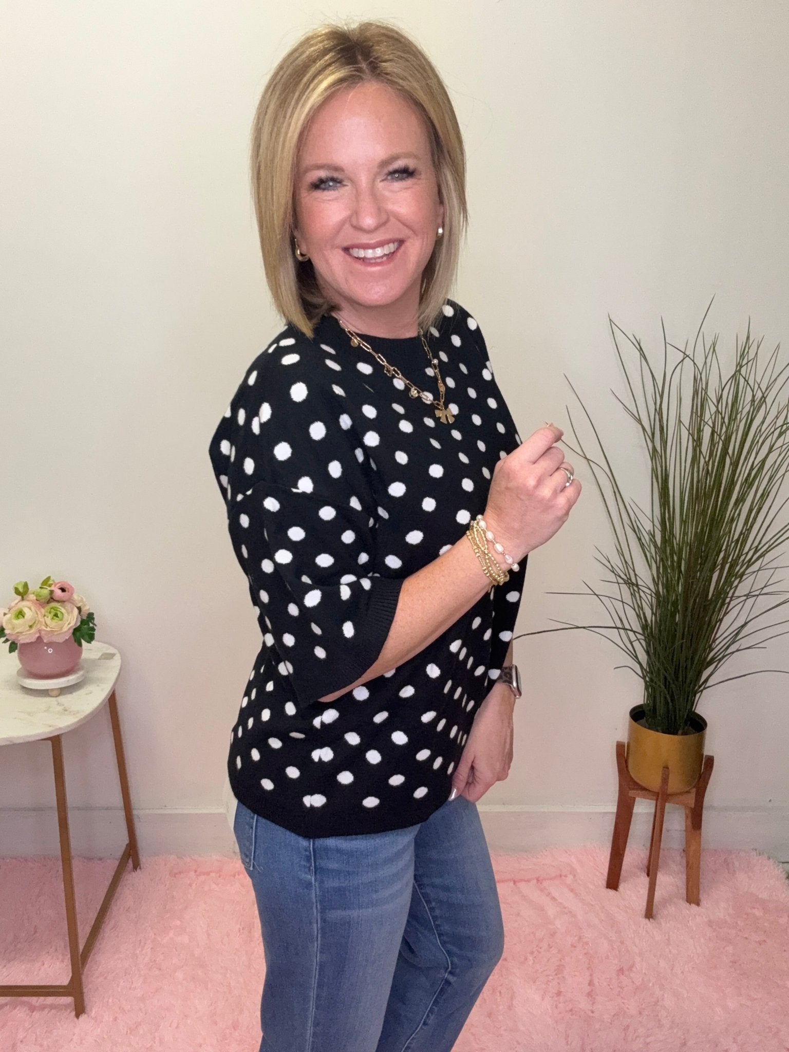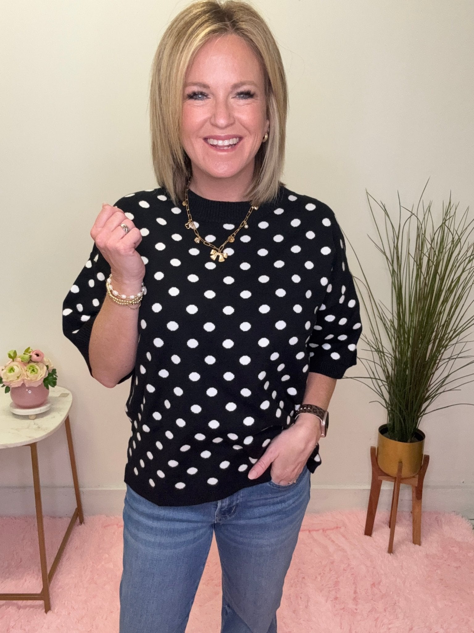 Classic, playful, and effortlessly chic 🖤 This black and white polka dot knit top is the perfect piece for adding a little personality to your everyday outfits. The timeless polka dot pattern paired with the soft knit fabric creates a look that’s both polished and comfortable.