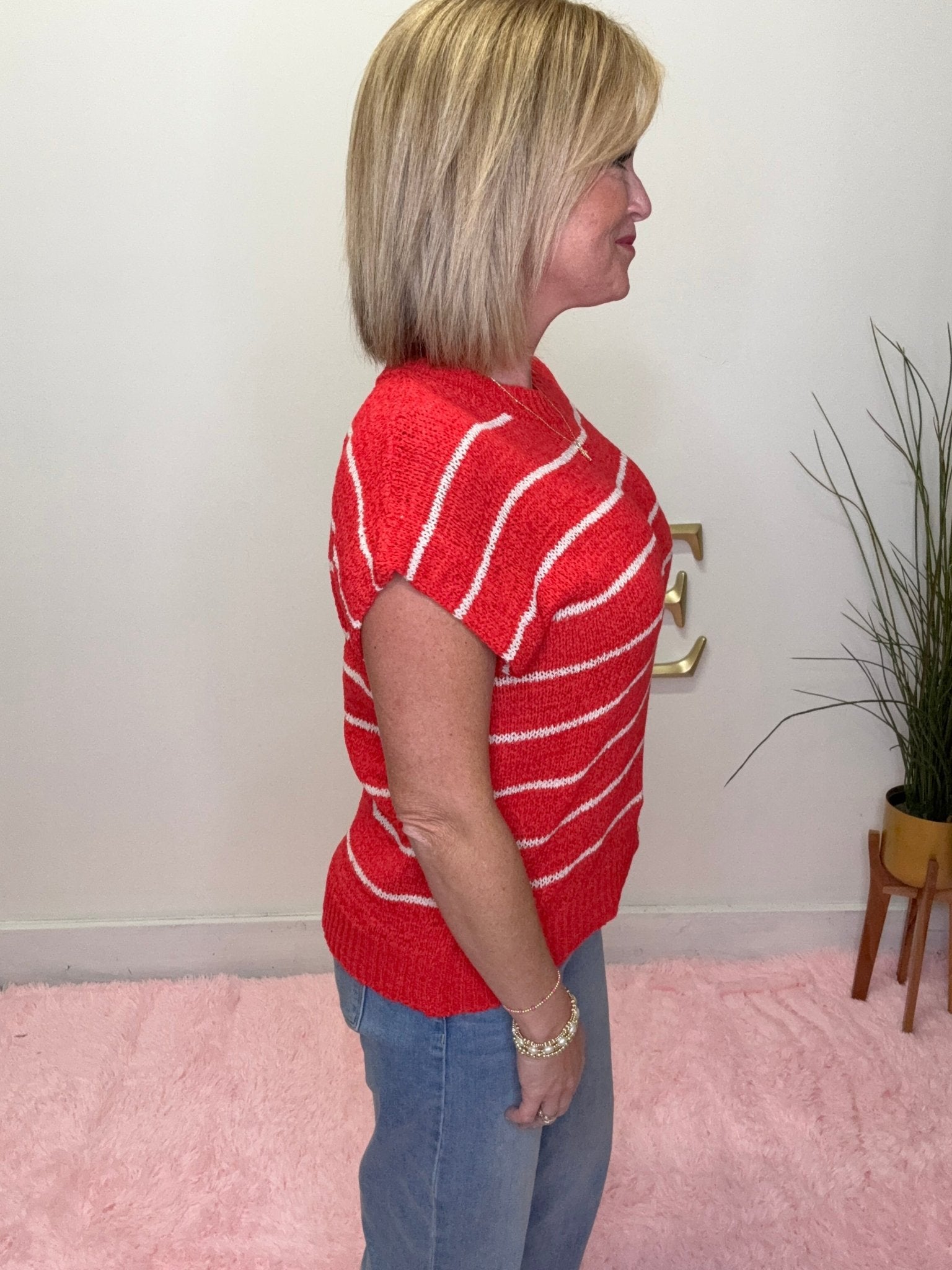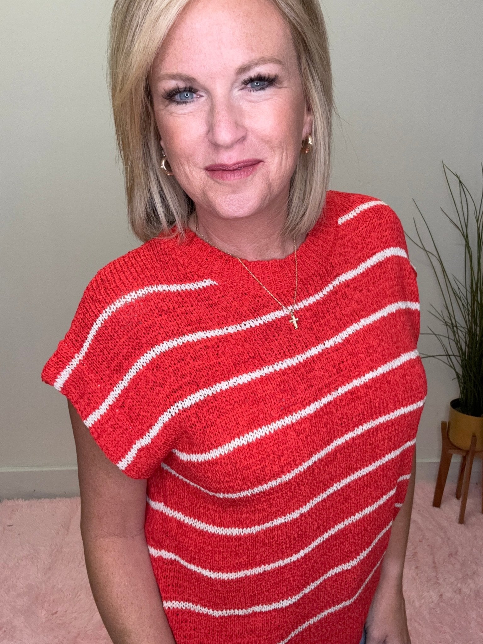 Bring on the sunshine ☀️ This bold red striped knit top is the perfect mix of classic and fun—an easy way to add a pop of color while keeping things comfy and casual.
