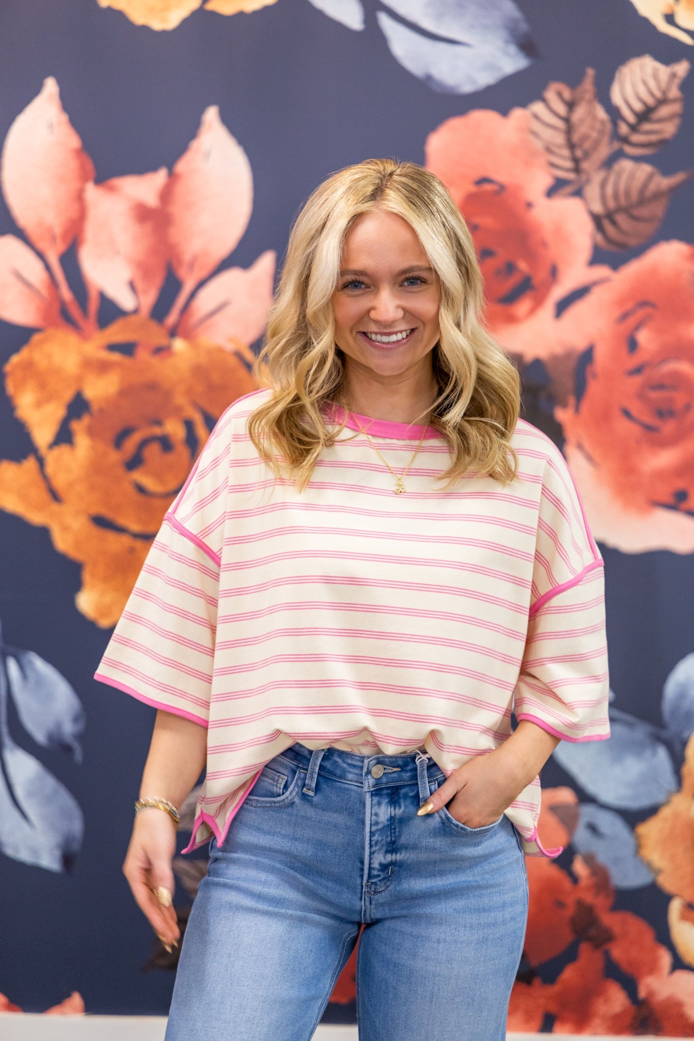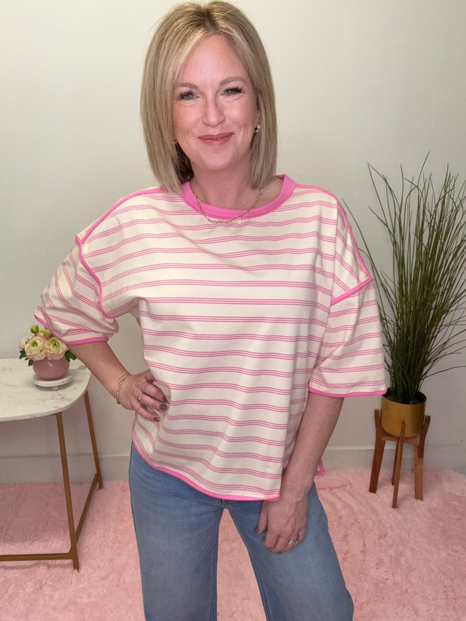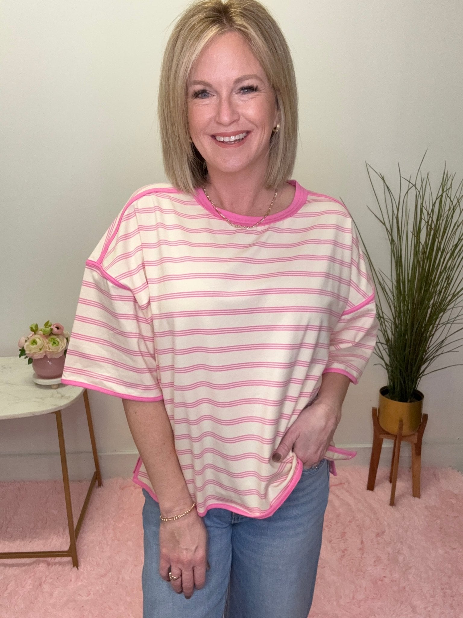 An easy favorite for everyday wear, this striped oversized top brings together soft neutrals and a pop of pink for a look that’s comfy, cute, and effortlessly flattering. Perfect for busy mom days, casual weekends, and everything in between.