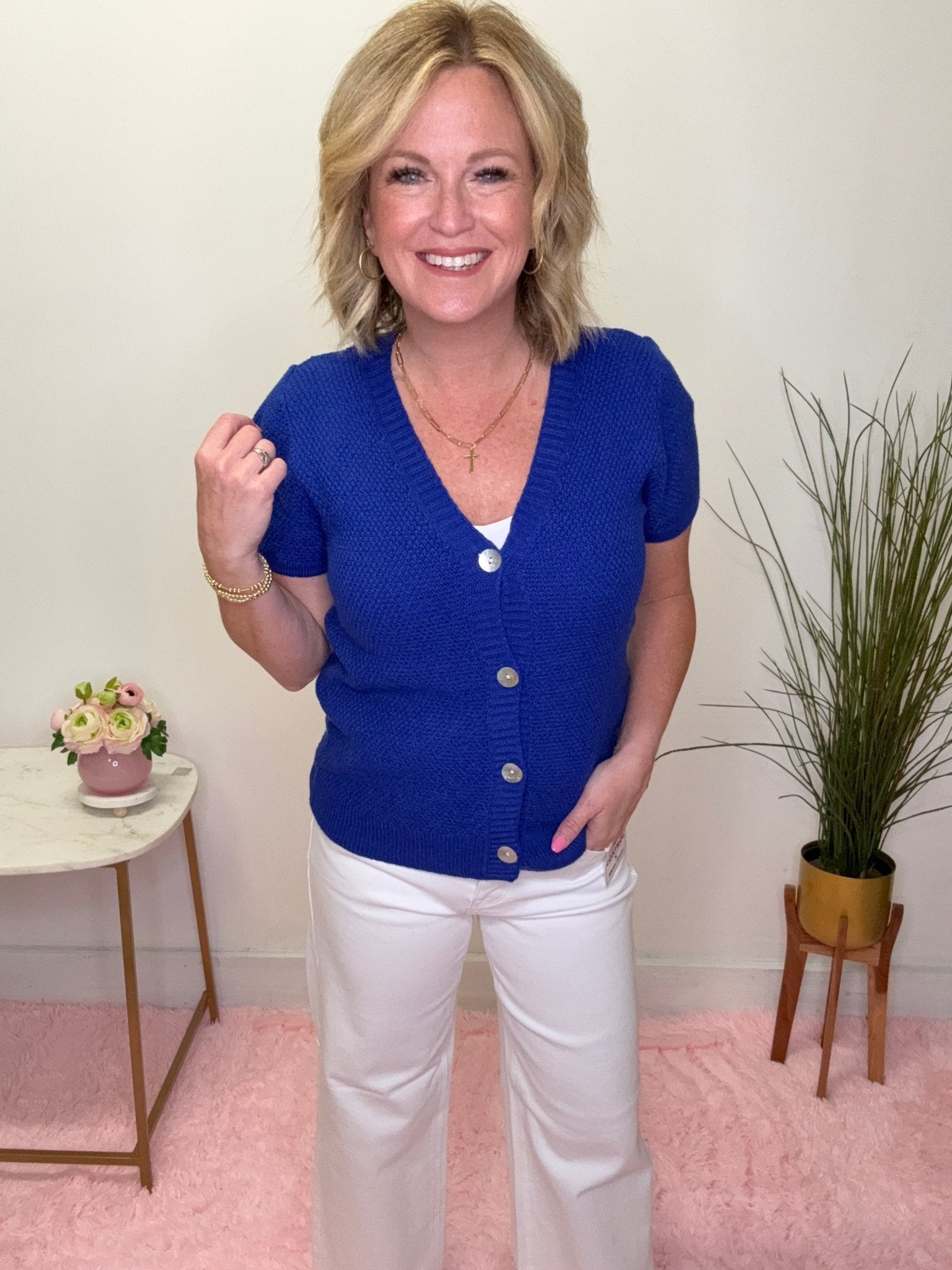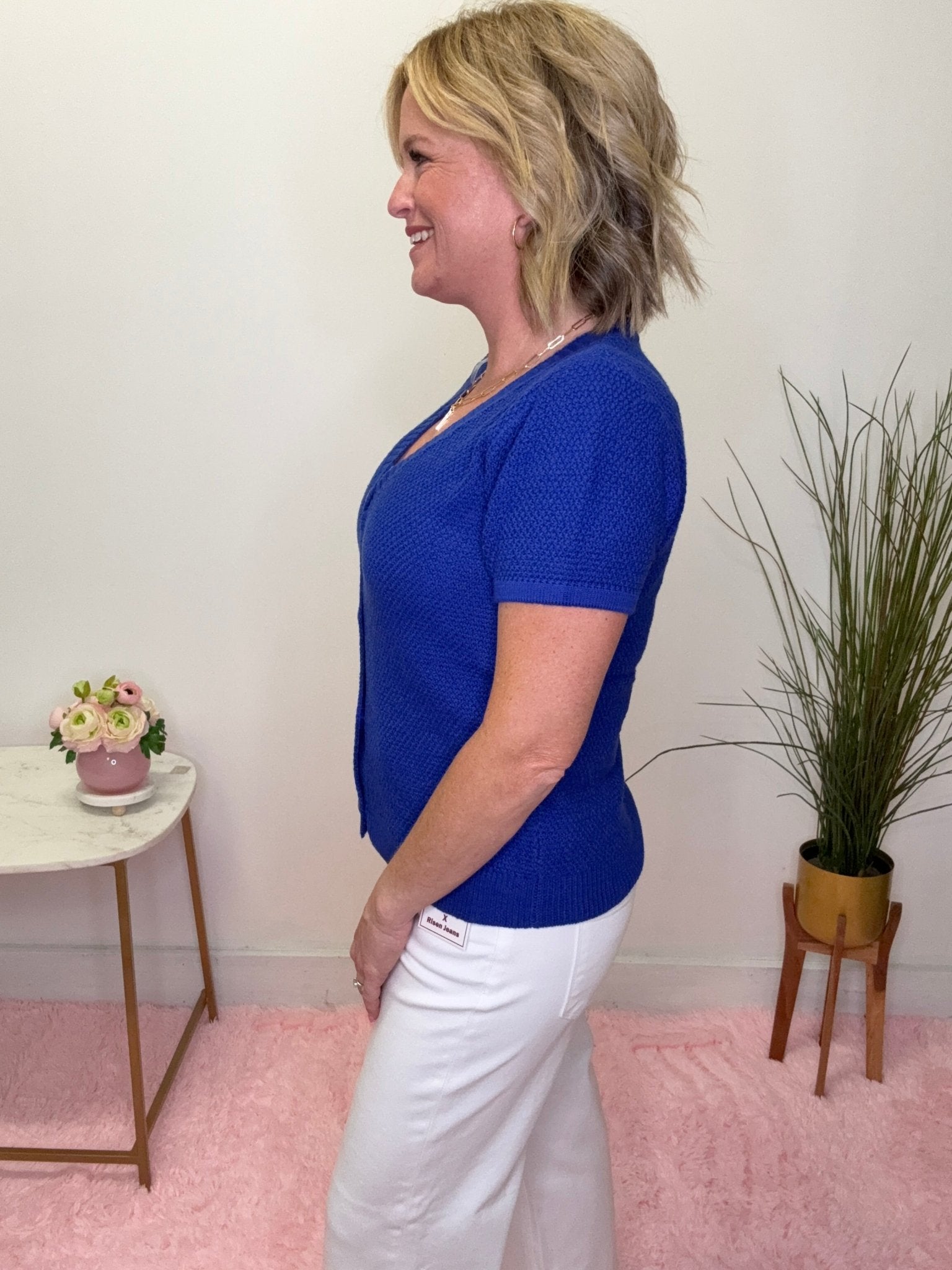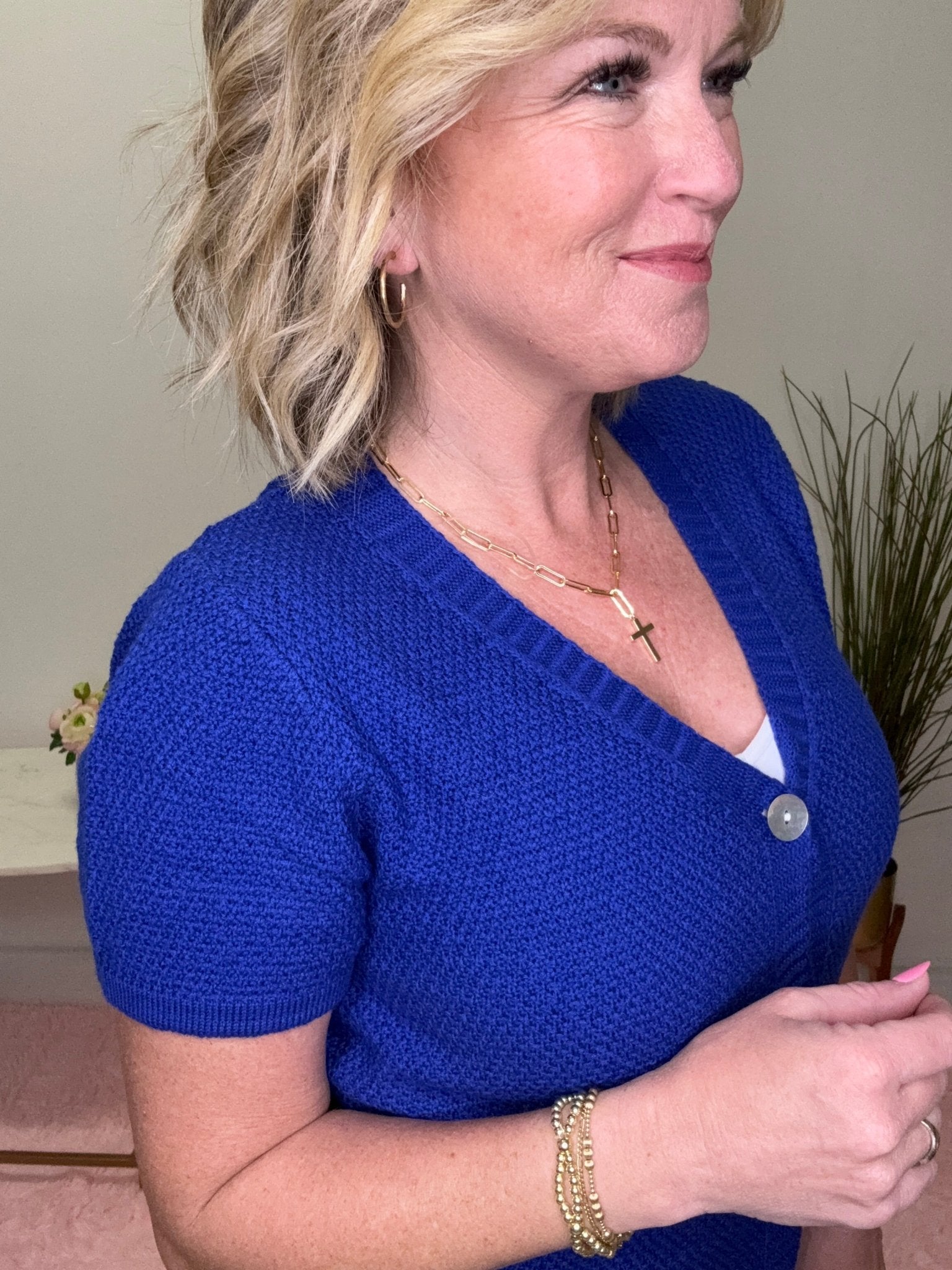 Bold, classic, and effortlessly flattering 💙 This royal blue short sleeve knit top is the perfect pop of color for spring and summer. Featuring a flattering V-neckline and statement button front detail, this piece blends timeless style with an easy, everyday feel.