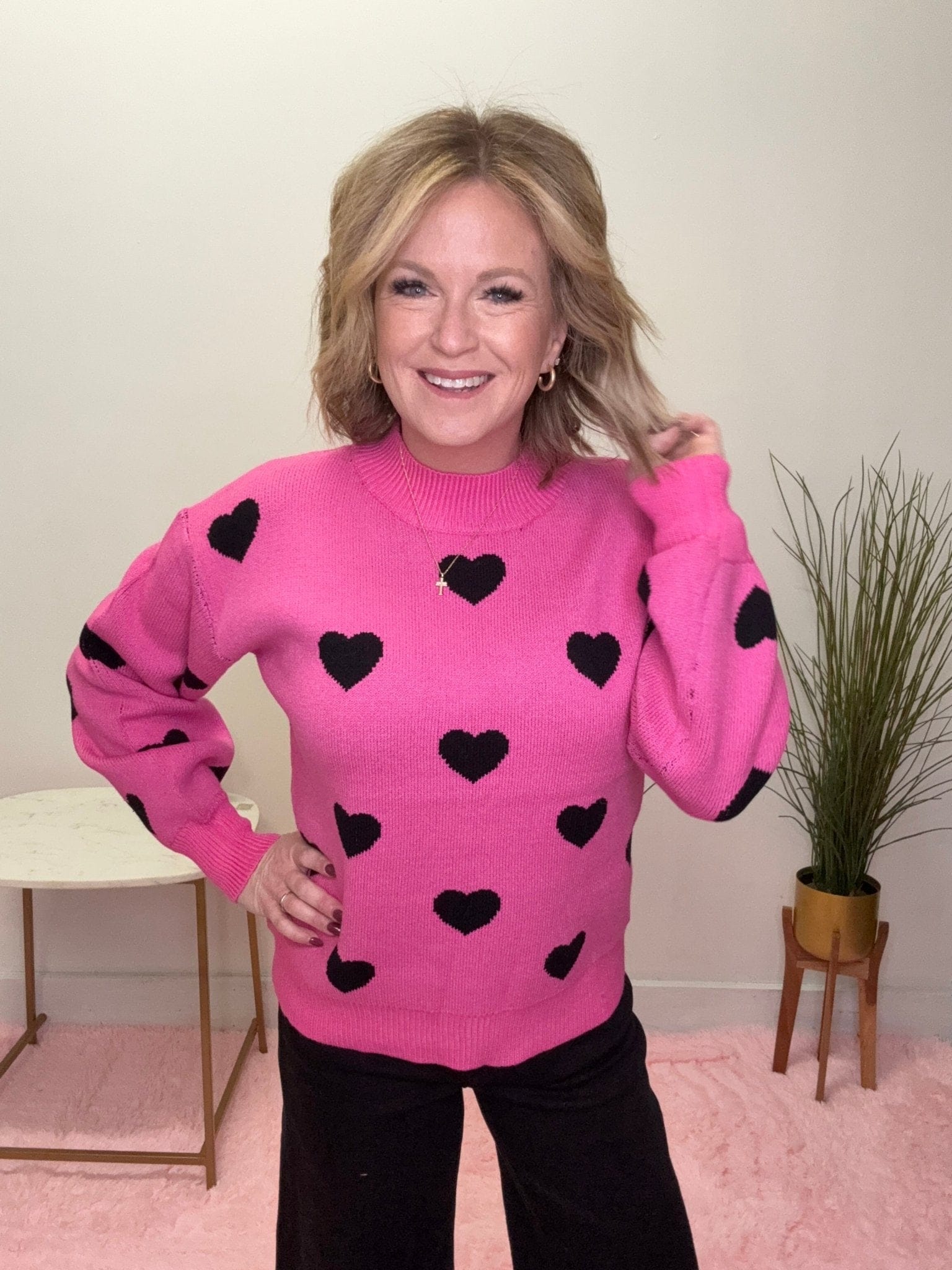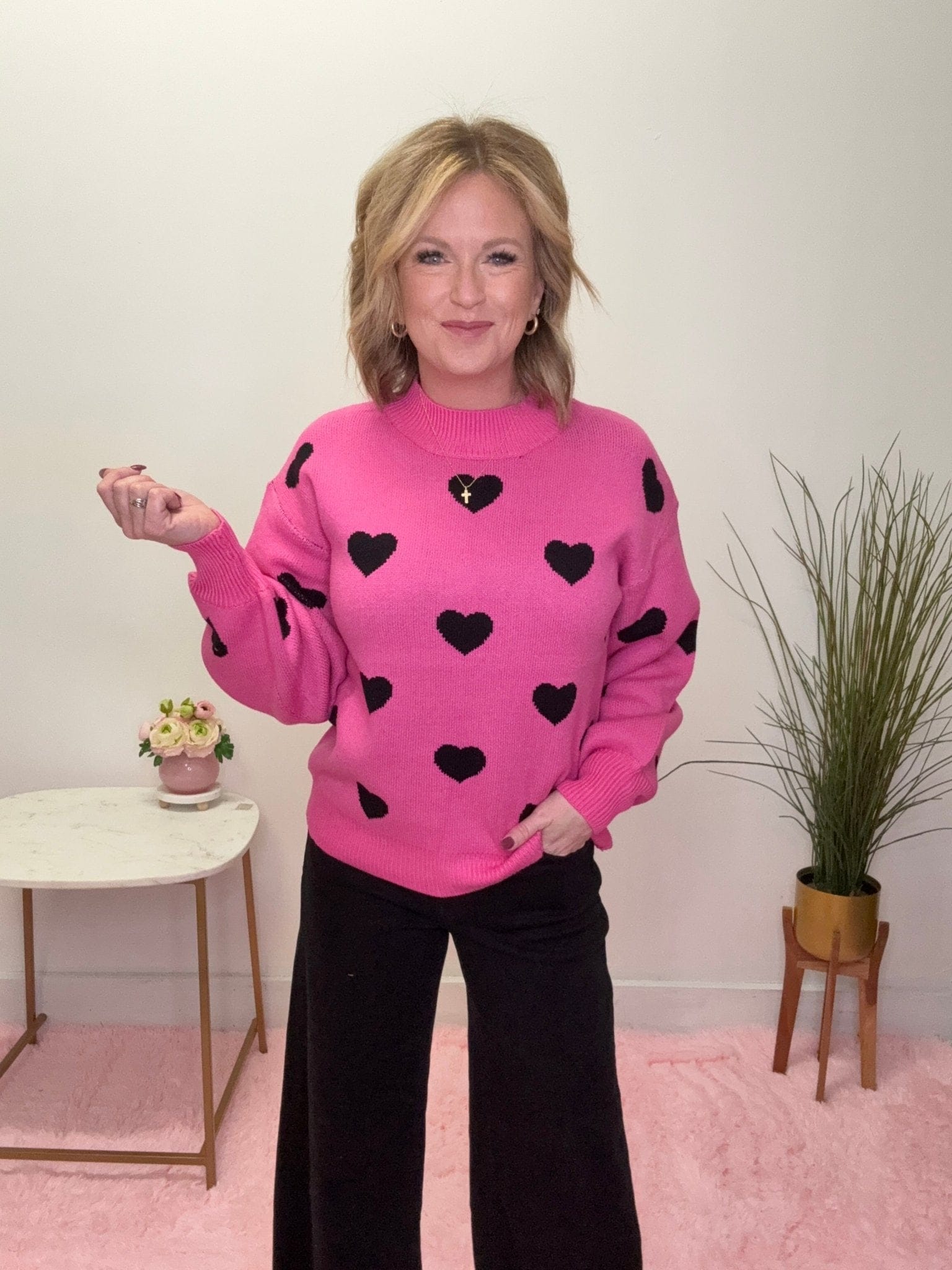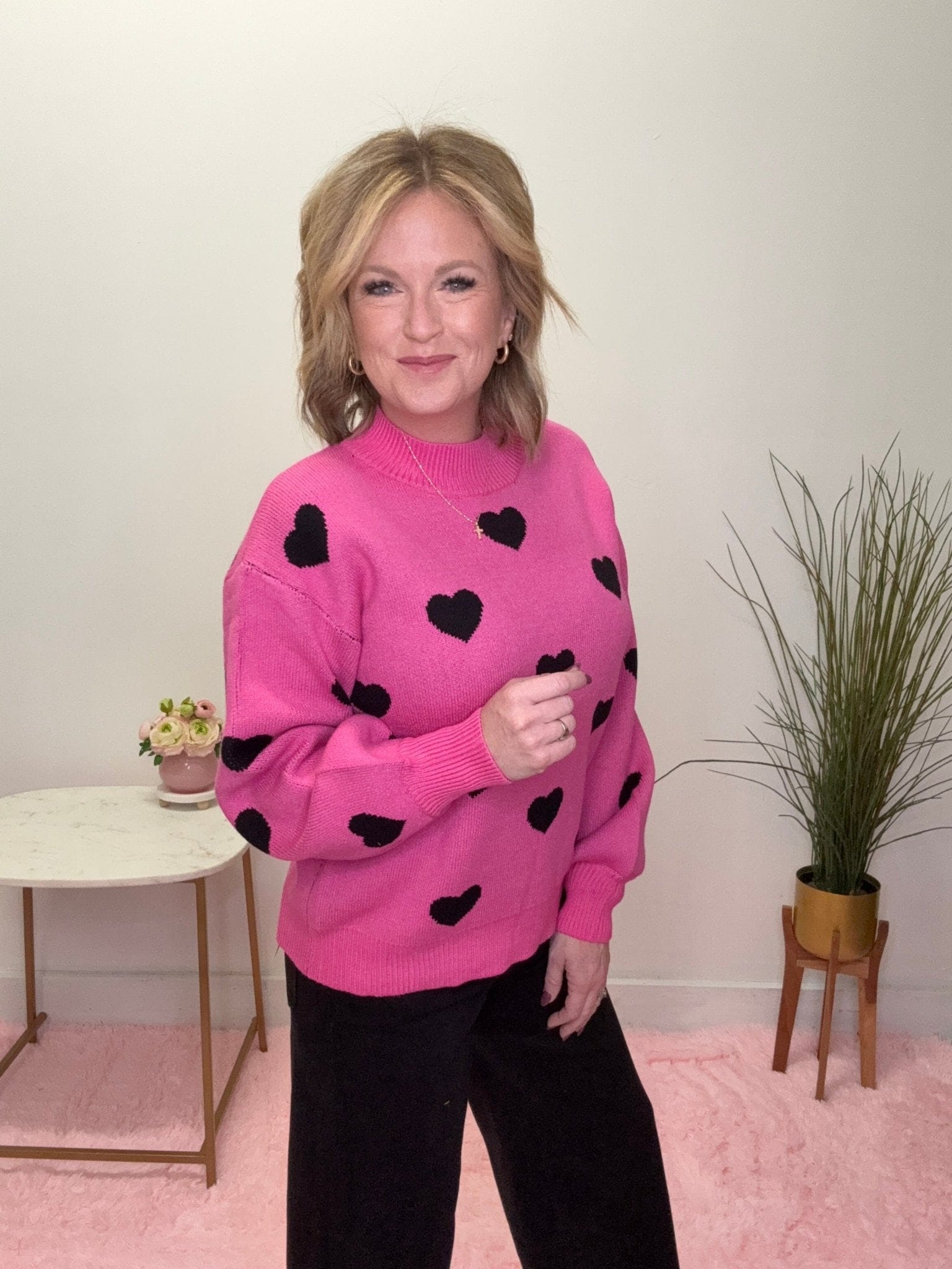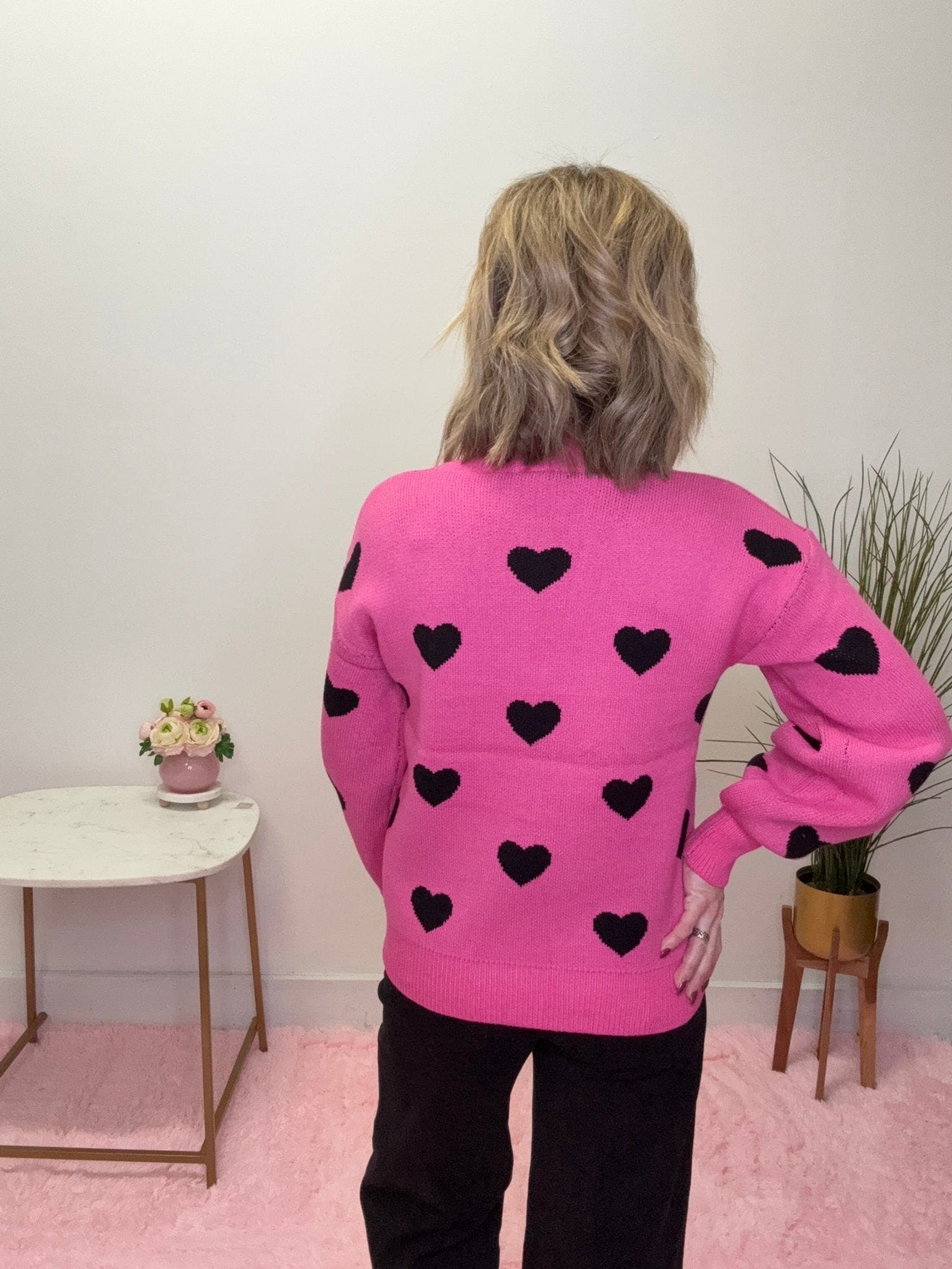 Get ready to wear your heart on your sleeve—literally! This lightweight mock neck sweater in hot pink, adorned with playful black hearts, is as easy to dress up as it is to cozy up. Perfect for when you want to look cute without breaking a sweat (or a fashion law)!