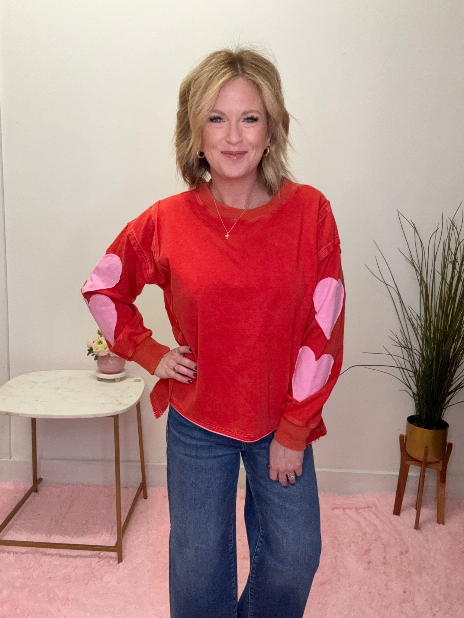 This cozy-meets-cute top brings just the right amount of Valentine’s charm to your everyday style. The soft red base gets a playful upgrade with pink heart patches down the sleeves, making it a standout without feeling over-the-top. Easy, comfy, and full of personality — this one’s made for coffee dates, errands, and casual nights out.