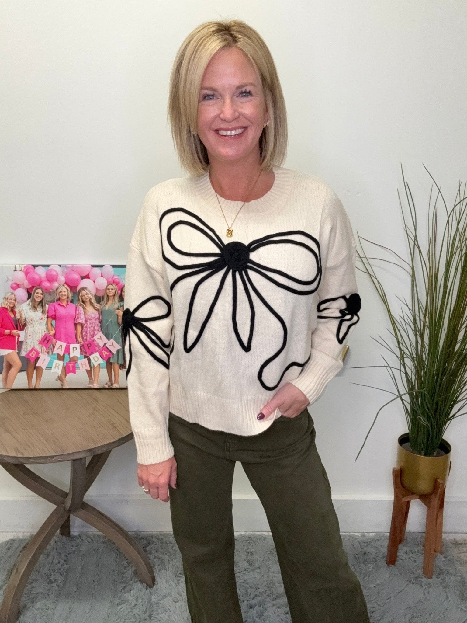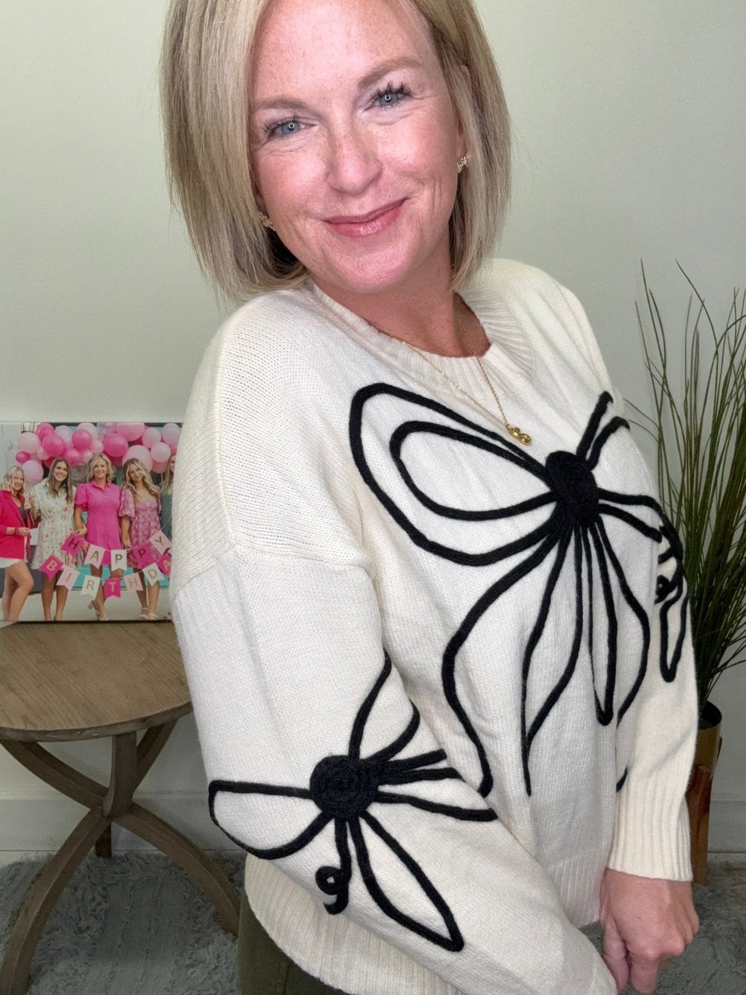 Stay cozy and stylish in our Need This Round Neck Bow Sweater. The ivory color paired with a raised black bow trim adds a touch of elegance. With a great fit and shorter length, it's perfect for dressing up or down. Don't miss out on this must-have piece!