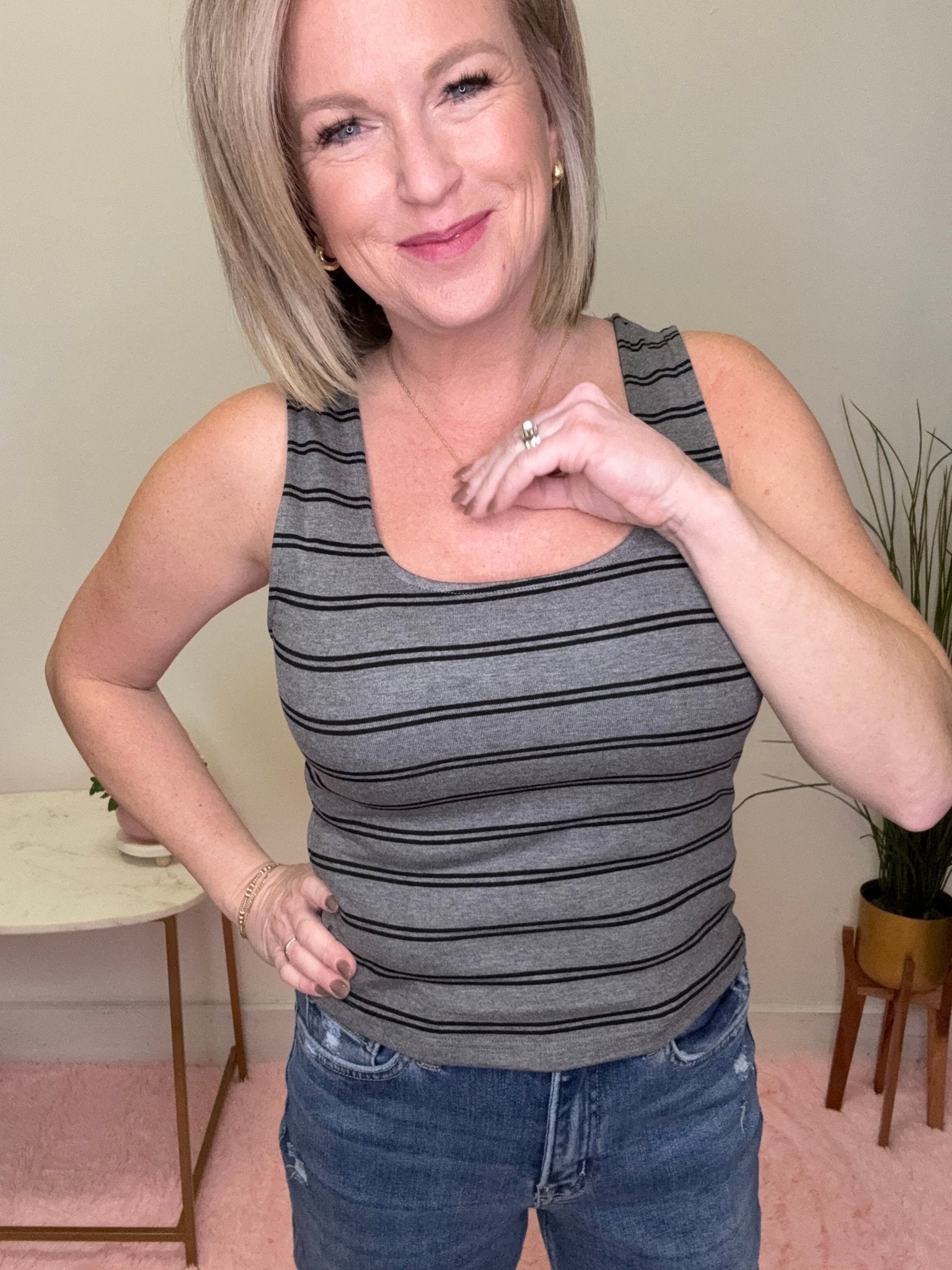 A versatile striped tank that works for everyday outfits, layering seasons, and effortless styling—this one’s a closet staple in the making 🤍💚
