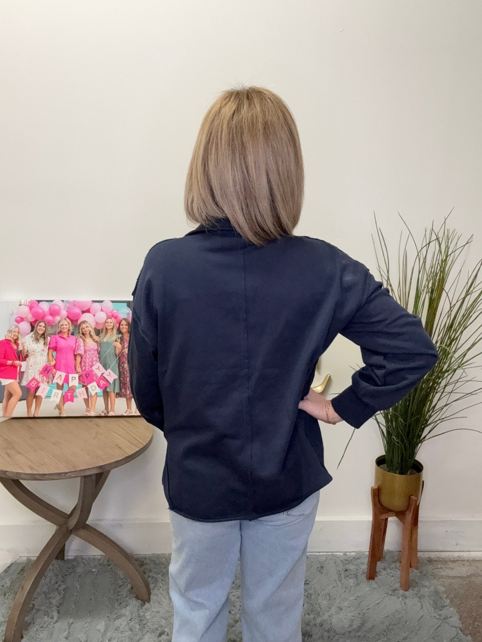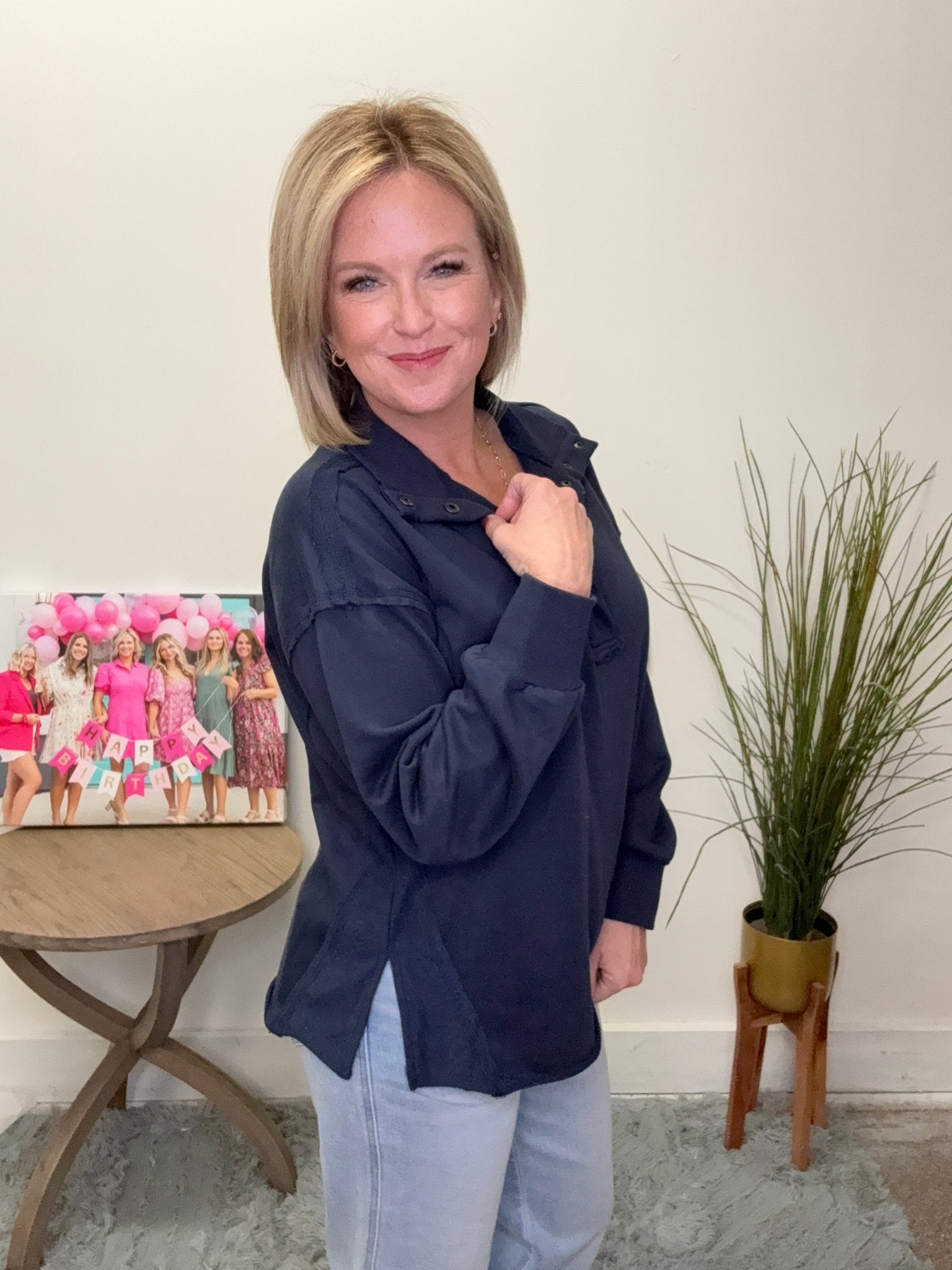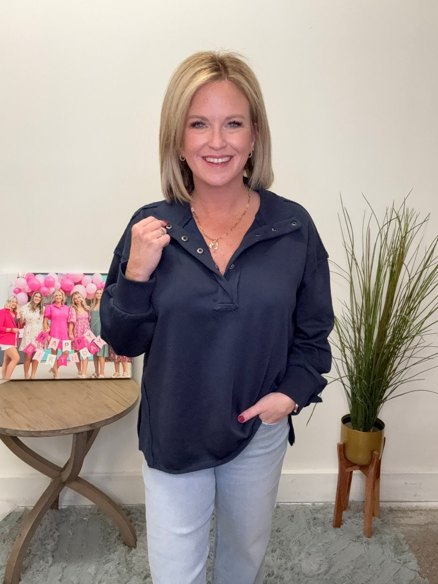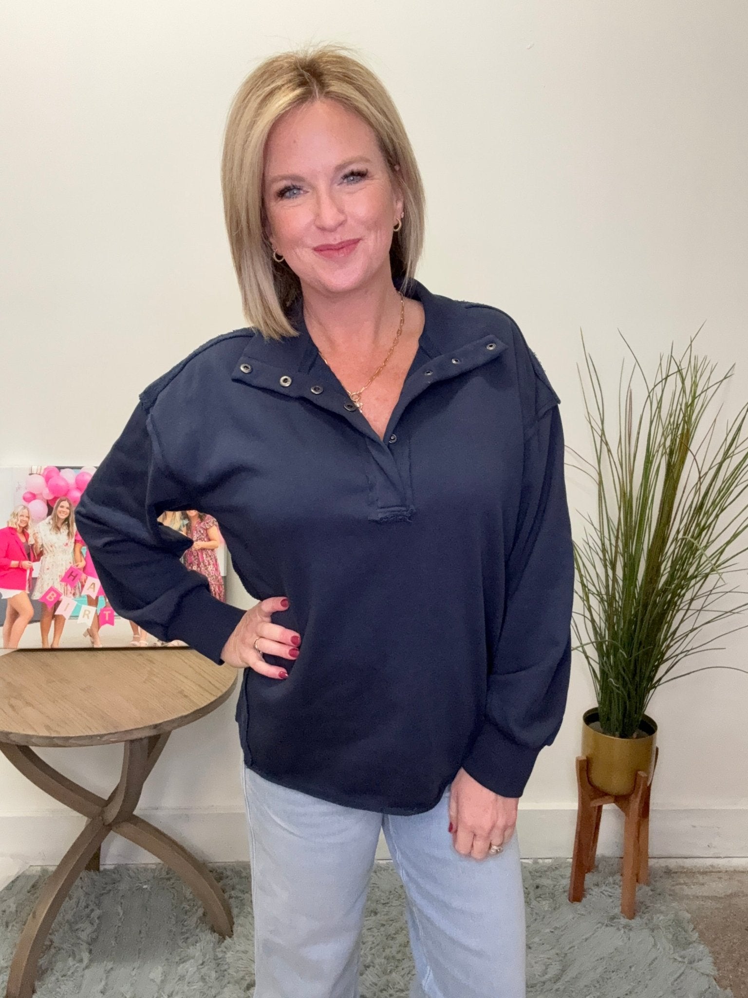 Funnel Neck Half Snap Button Sweatshirt in Navy