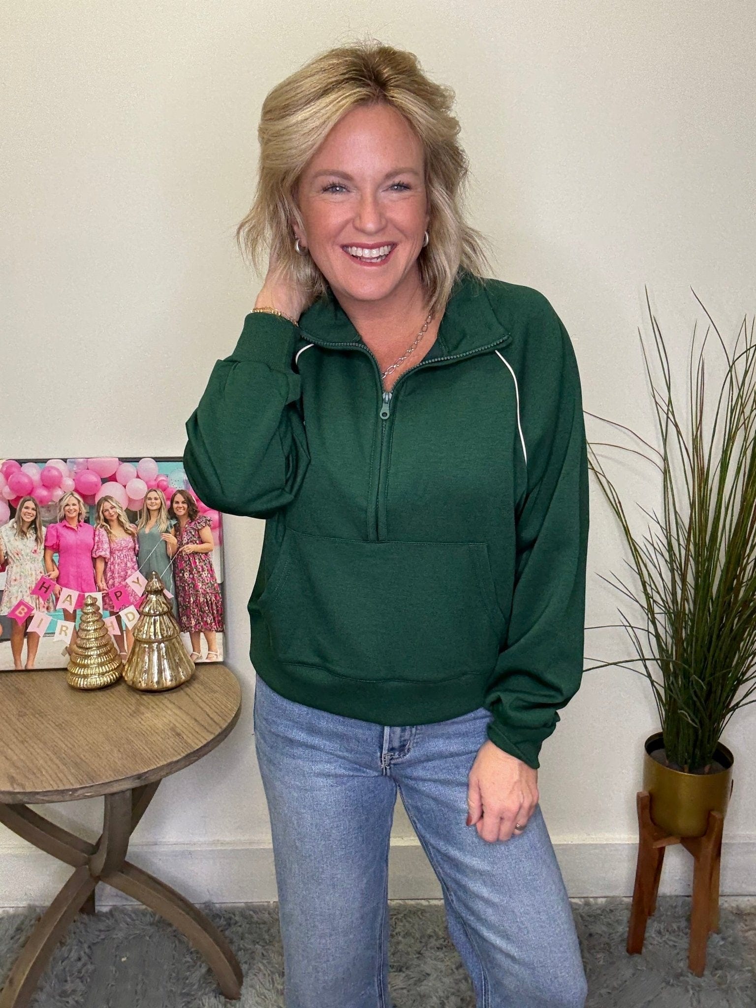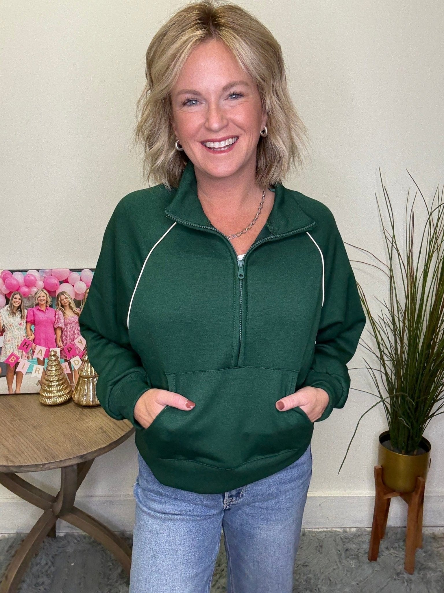 Introducing our Half Zip Piping Detail Top, the perfect combination of comfort and style. Made from the softest material, this sweatshirt is both lightweight and cozy. The beautiful emerald green color is accented with white piping, adding a touch of elegance. And with its shorter length, it's the perfect top for any daily occasion.
