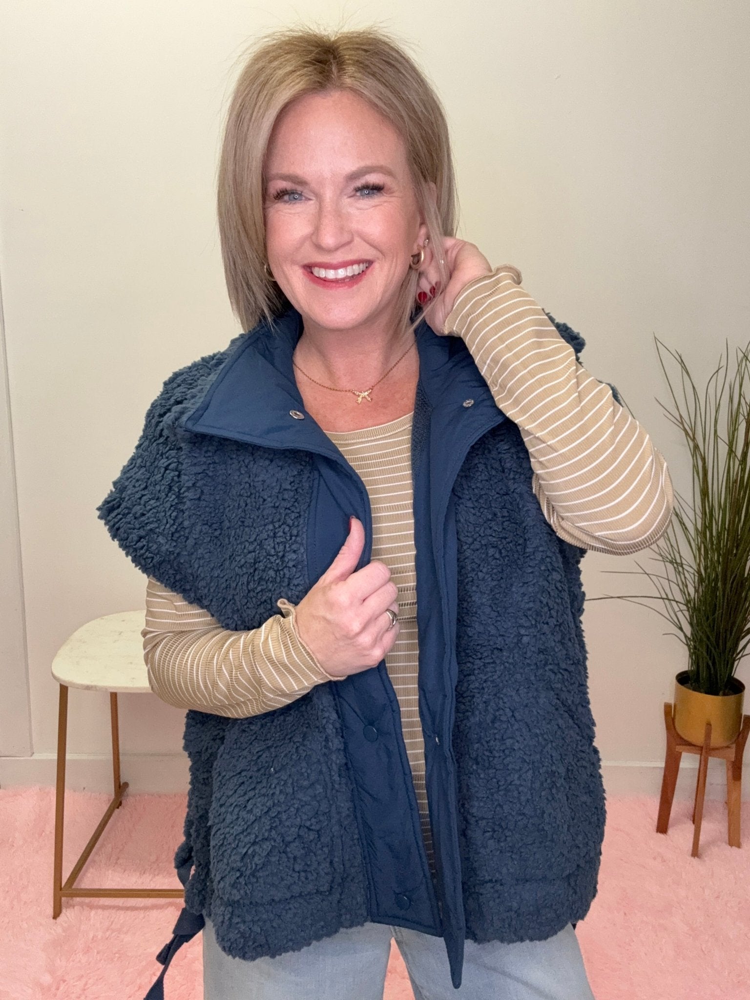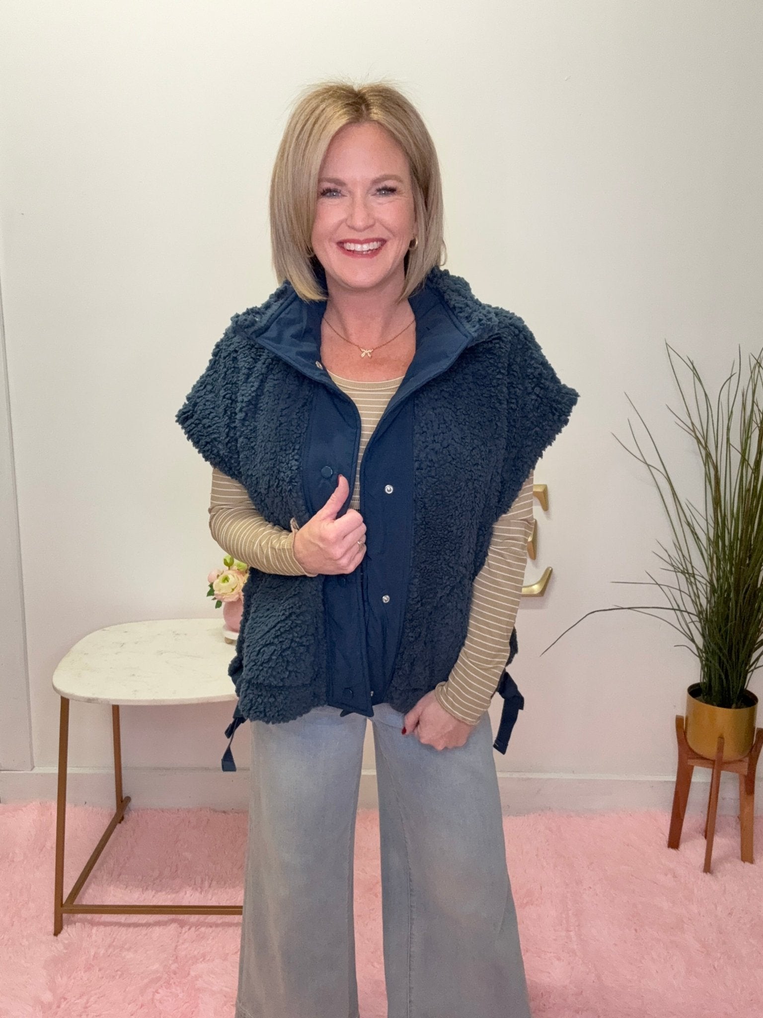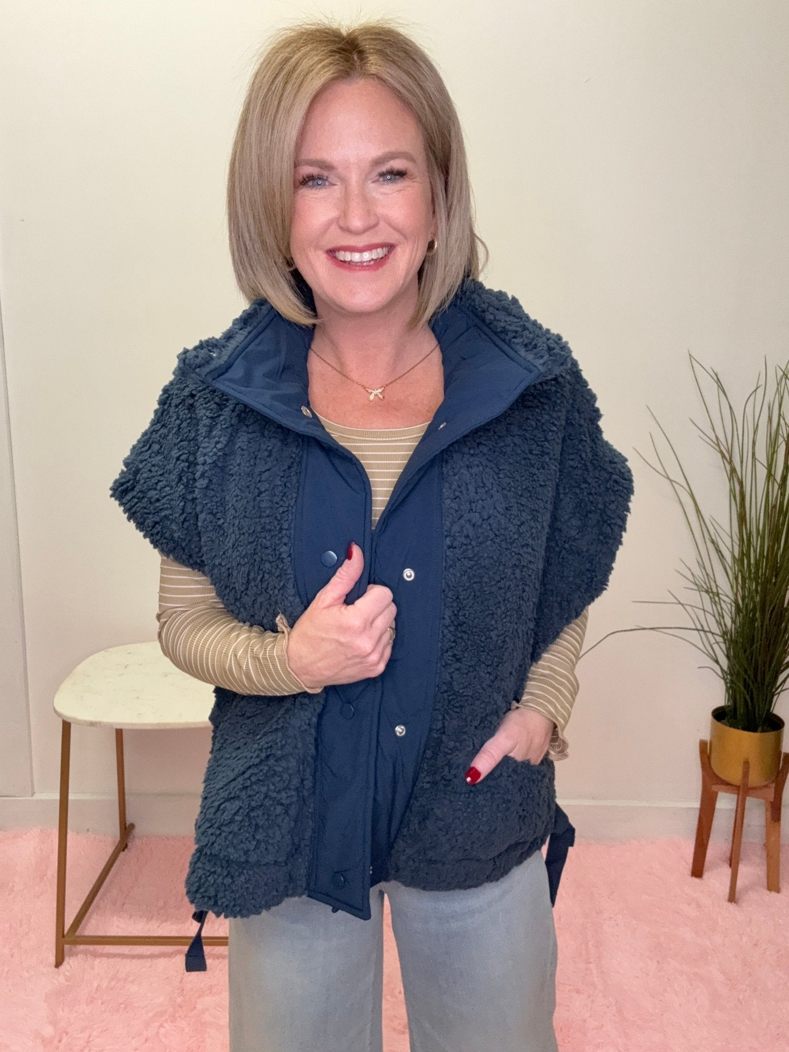 Stay cozy and stylish with the Looks Sharp Oversized Sherpa Sleeveless Vest Jacket. The navy fuzzy vest adds a fun touch to any outfit, while the oversized fit ensures ultimate comfort. With its unique design, this jacket is perfect for anyone who wants to stand out while staying warm.
