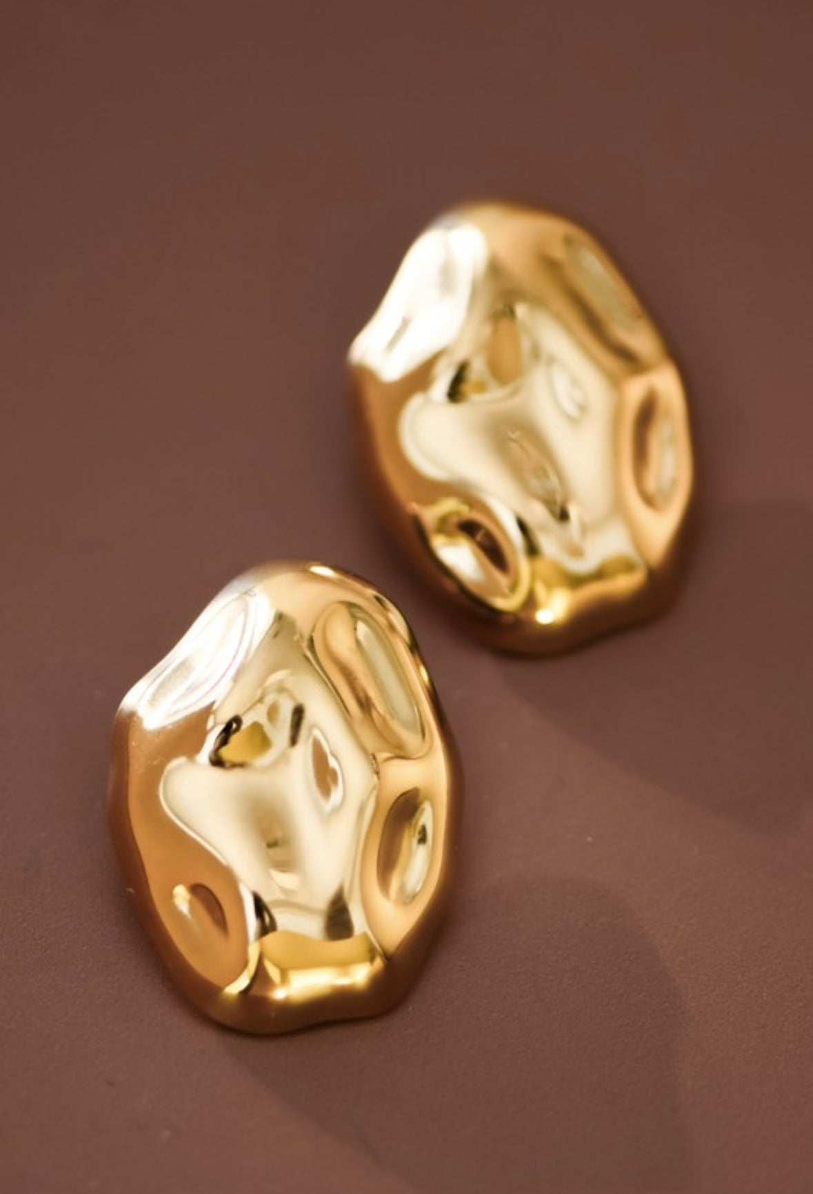 Elevate your everyday look with these 18k gold waterproof hammered studs. The unique hammered texture adds a touch of sophistication and the oval shape creates a flattering silhouette. Perfect for any occasion, you can confidently wear these studs rain or shine. Upgrade your jewelry collection today.