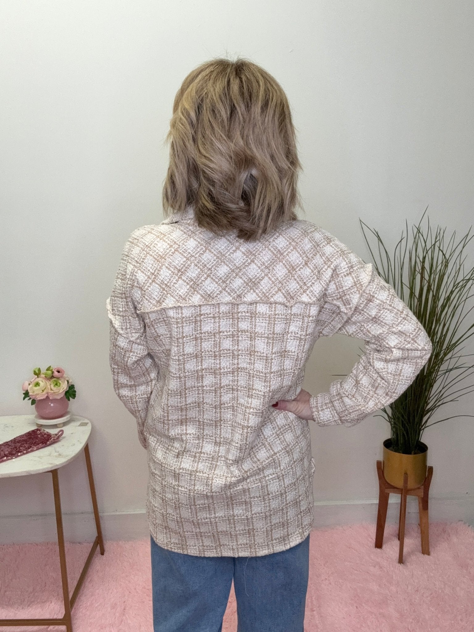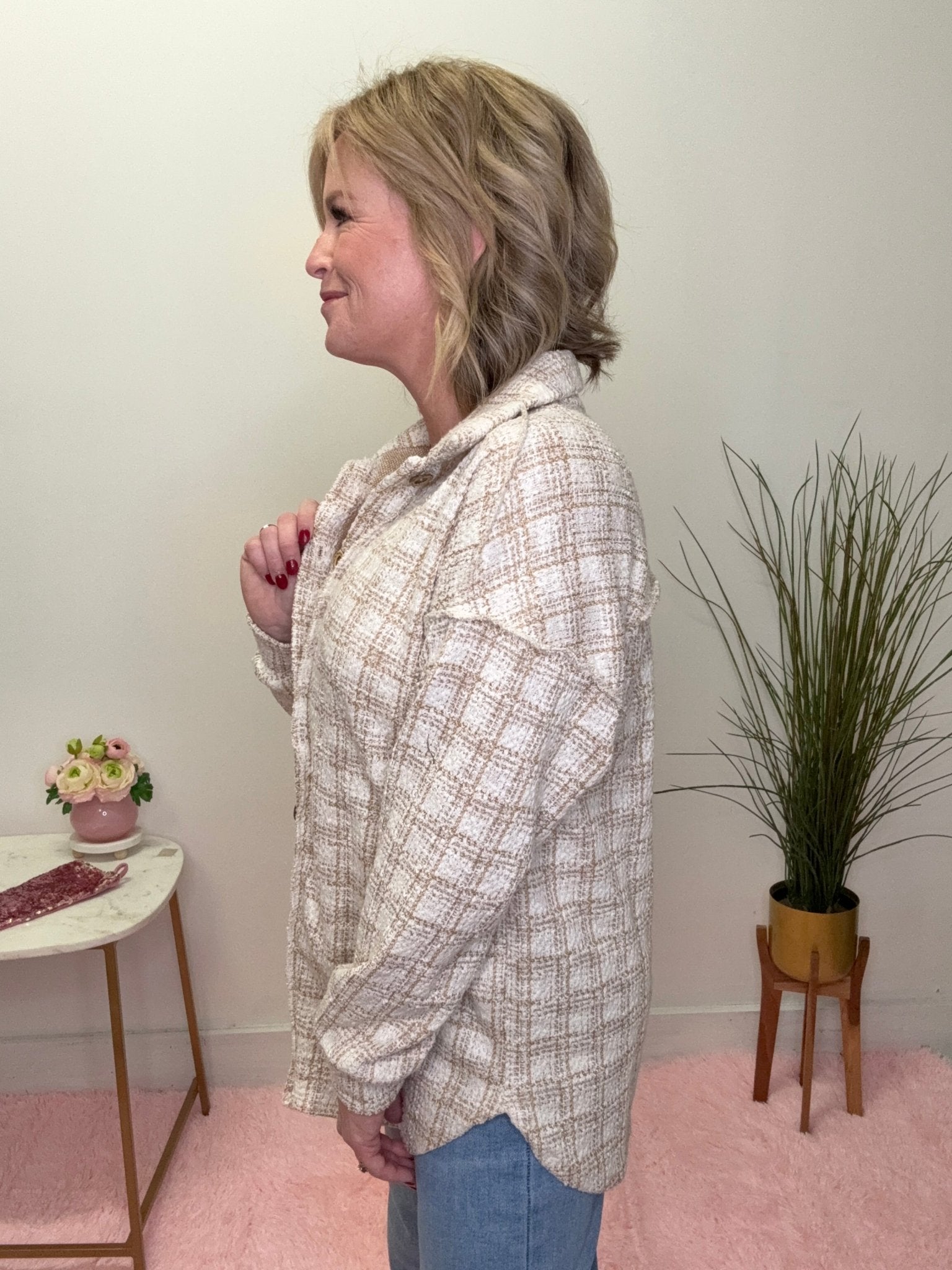 Cozy meets polished in the Oatmeal Plaid Button-Front Shacket — the layering piece you’ll reach for nonstop. With its soft neutral plaid, relaxed fit, and lightweight feel, this shacket is perfect for throwing on and instantly looking put together.