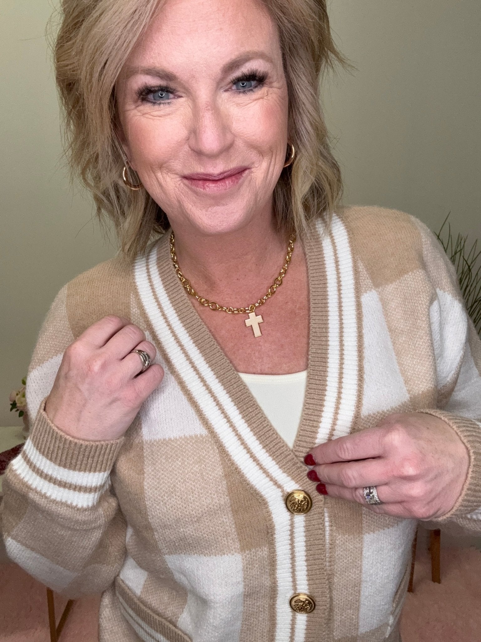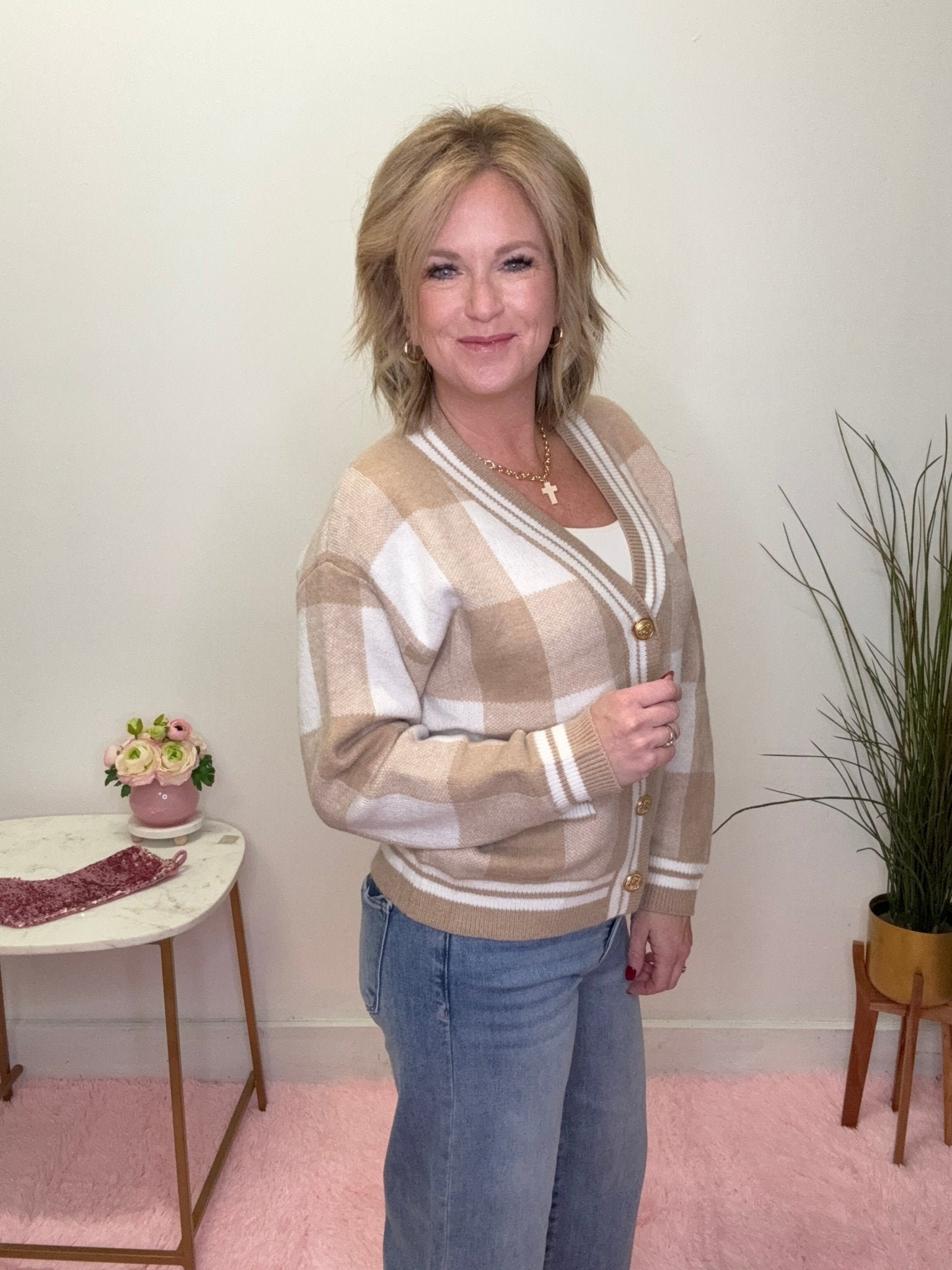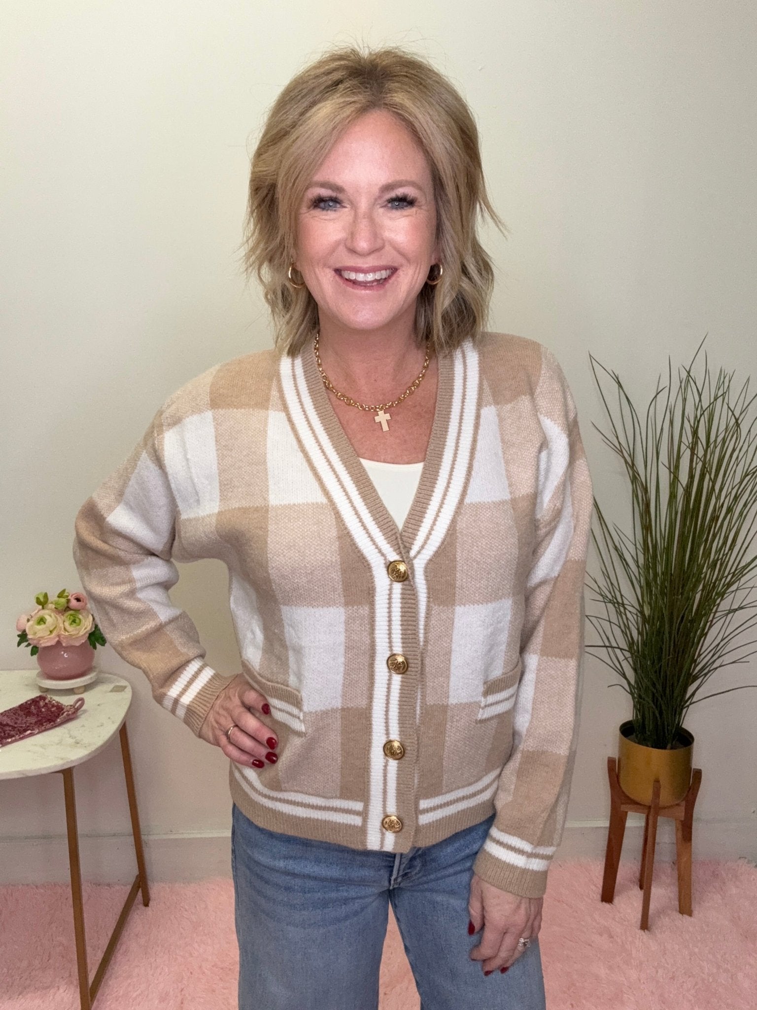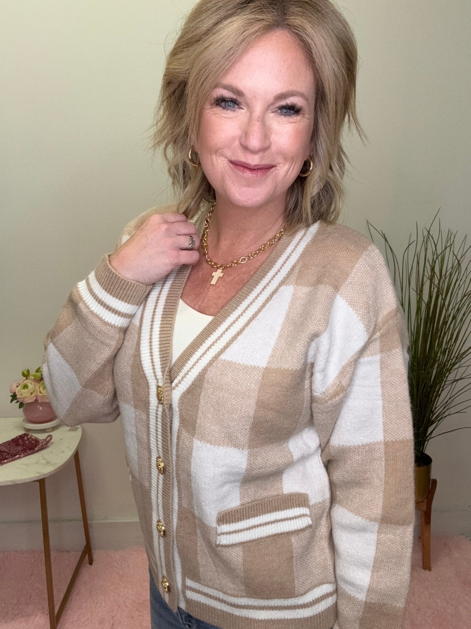 Timeless, cozy, and effortlessly chic — the Checkered Plaid Gold Button Soft Cardigan Sweater is a boutique staple you’ll reach for season after season. With its soft neutral plaid, flattering V-neckline, and classic gold-tone buttons, this cardigan delivers that pulled-together without trying look every woman loves.