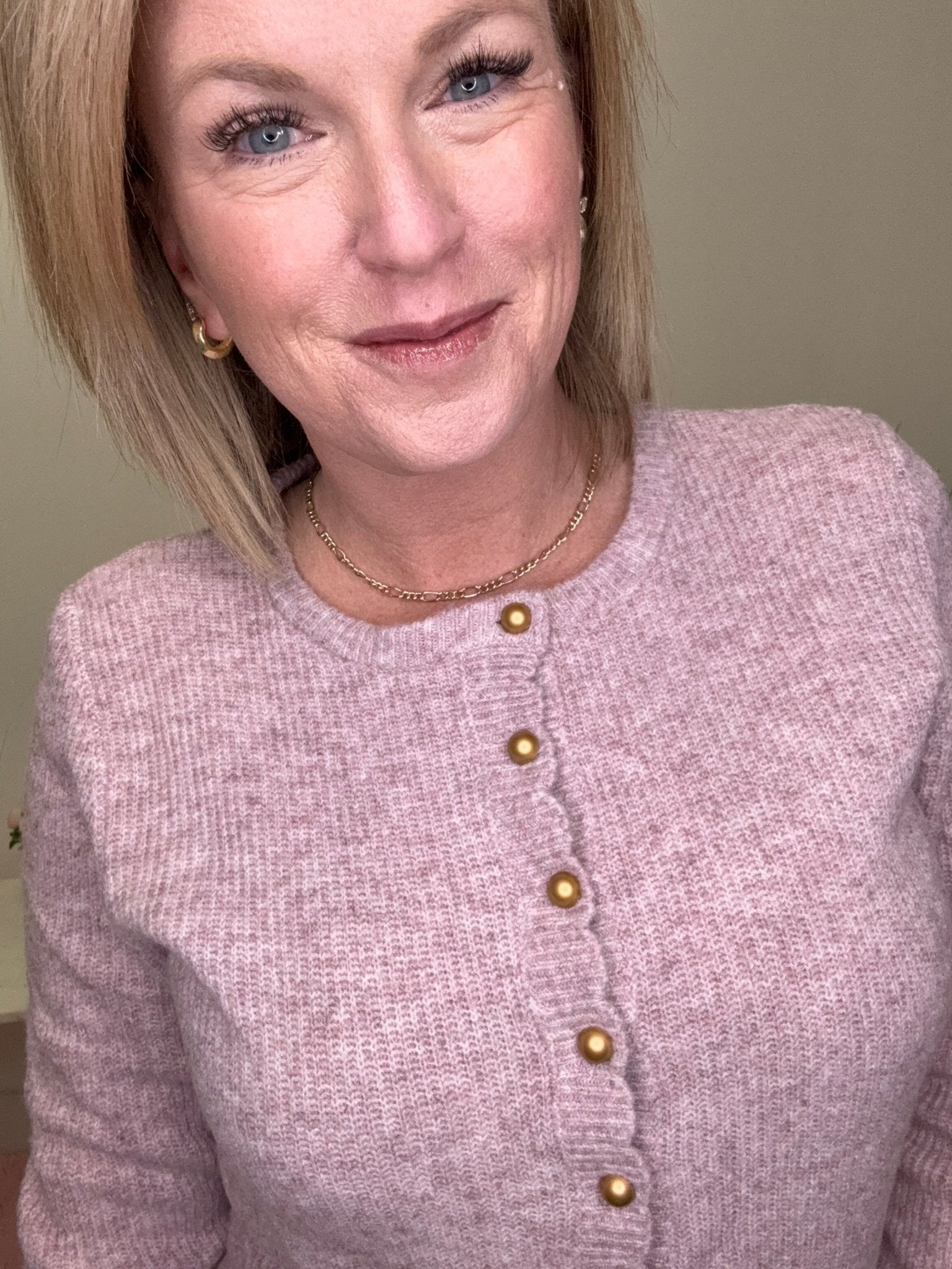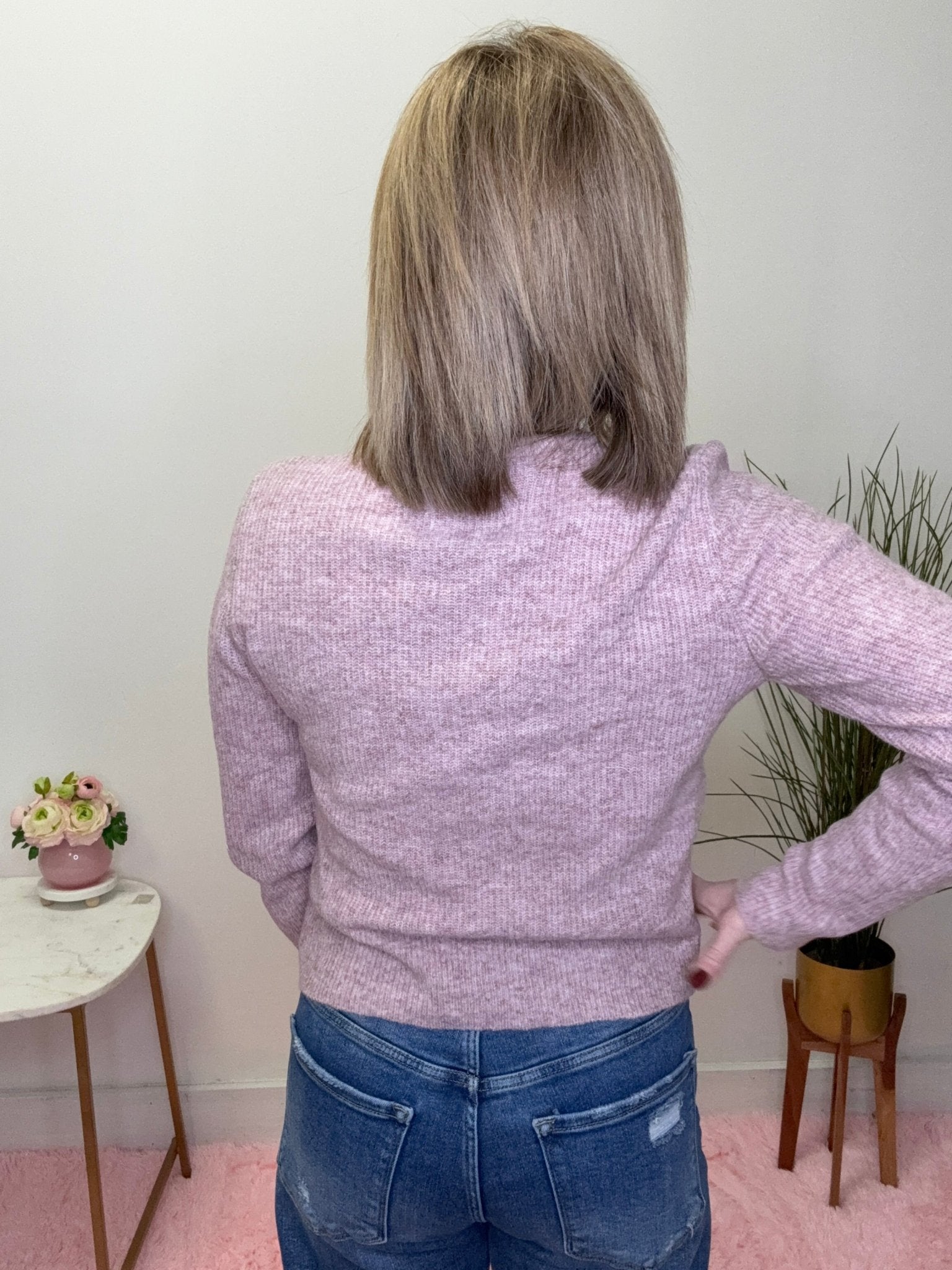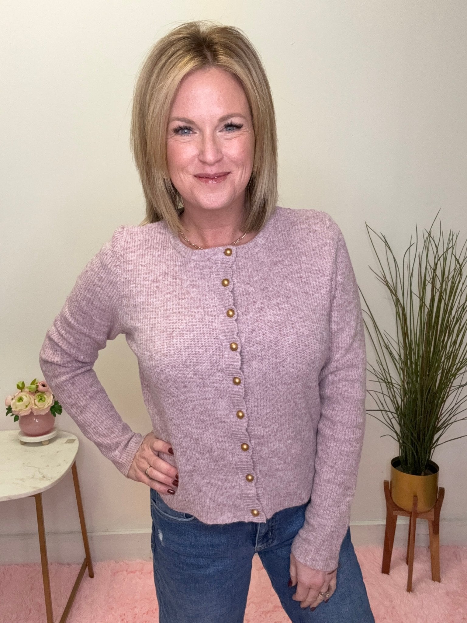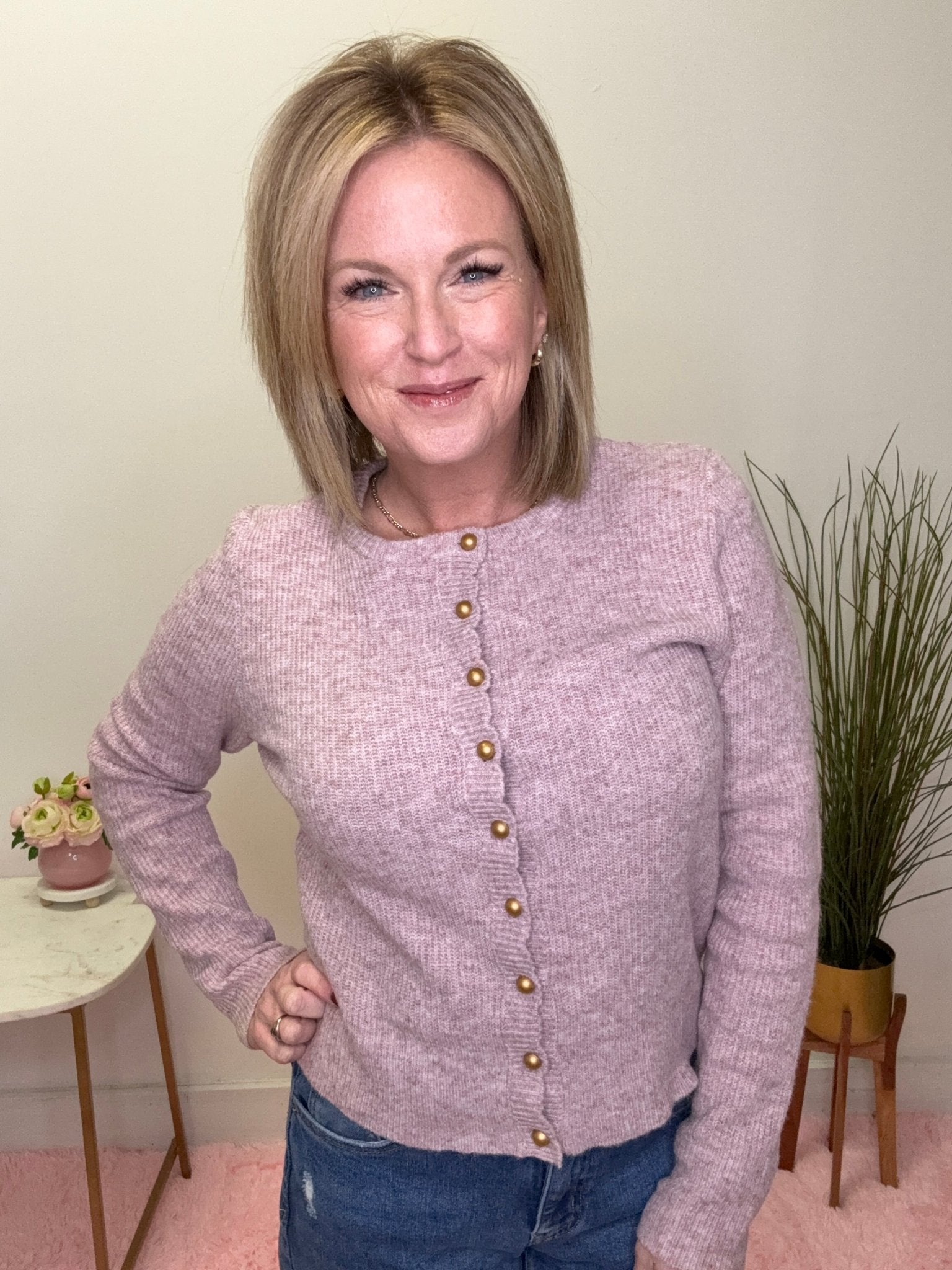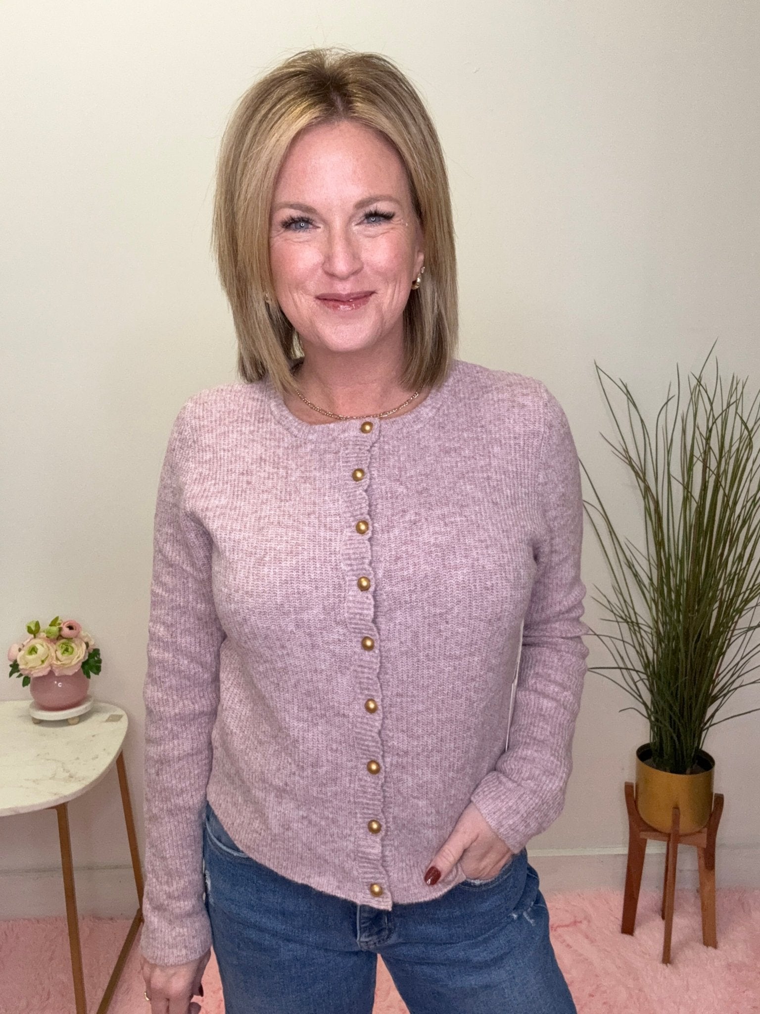 Pearl Button Ribbed Knit Cardigan in Mauve
