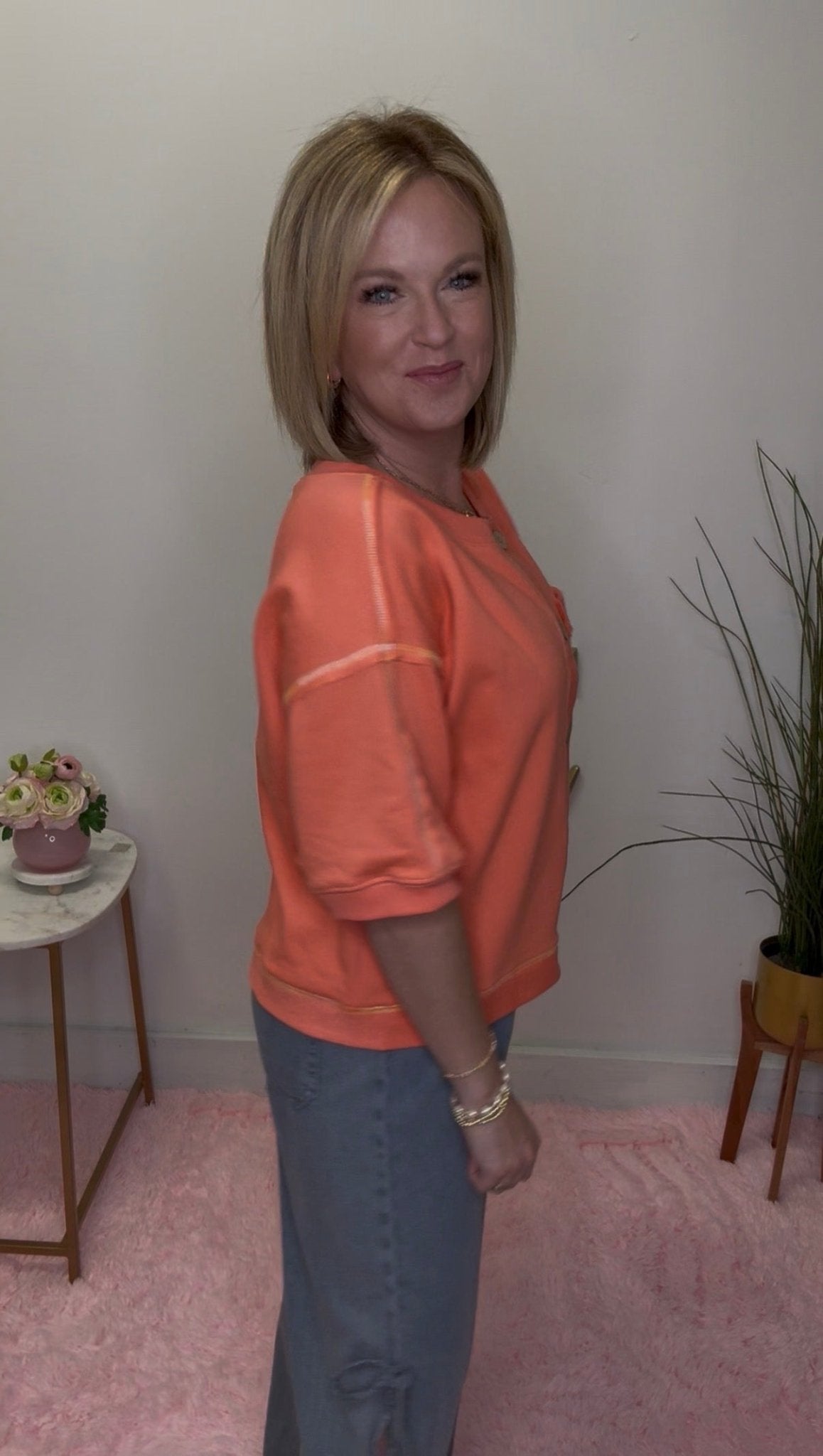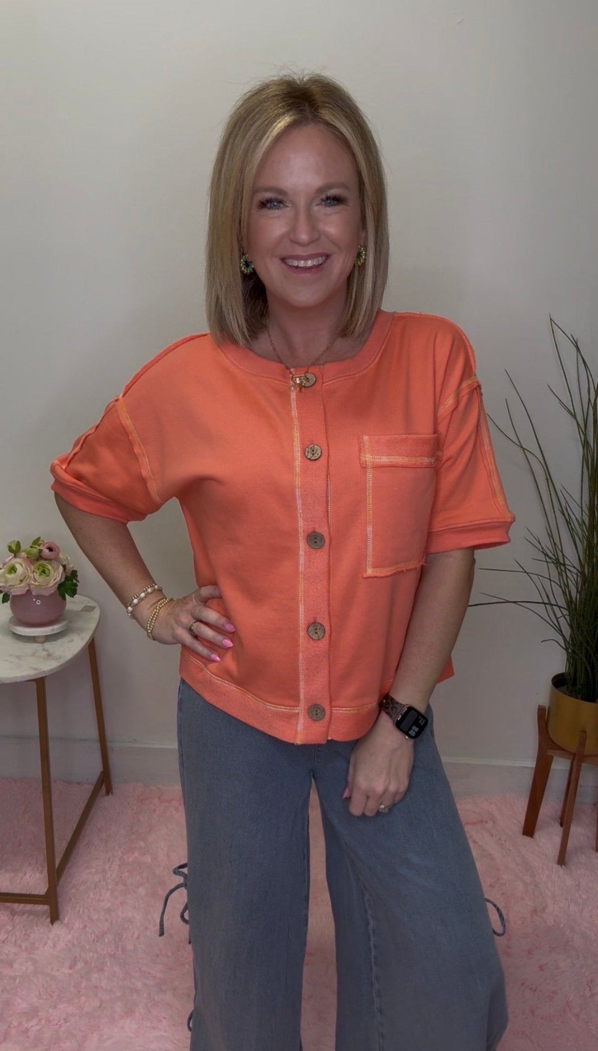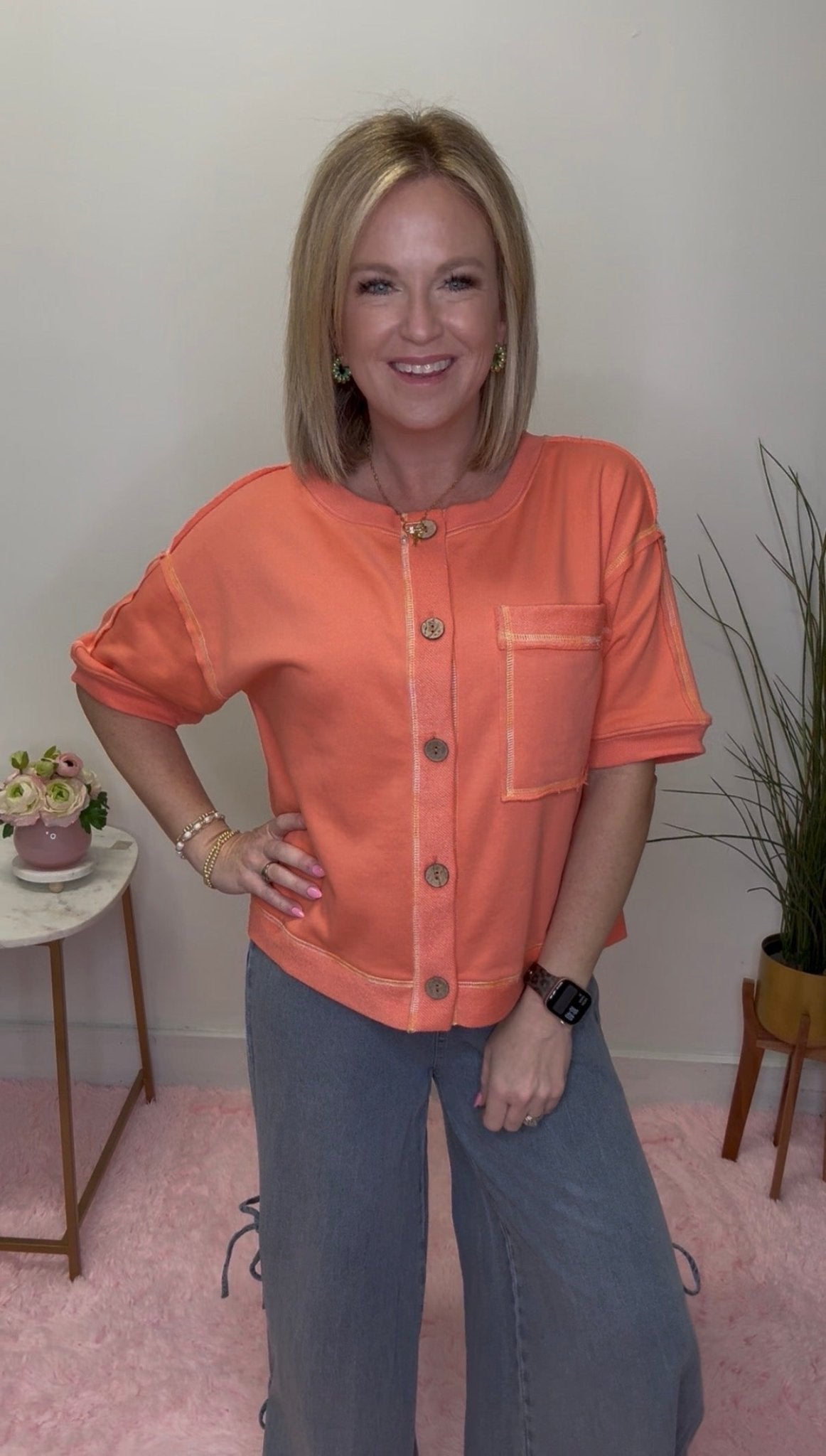 Brighten your wardrobe with this cheerful coral cardigan top featuring vibrant, colorful stitching and oversized buttons running down the front. Cut with comfortable elbow-length short sleeves, it's the perfect piece to layer or wear solo. Style it buttoned up for a polished look or leave it open for an effortlessly chic vibe. Cute, cozy, and endlessly versatile—your new go-to for adding a pop of color to any outfit.