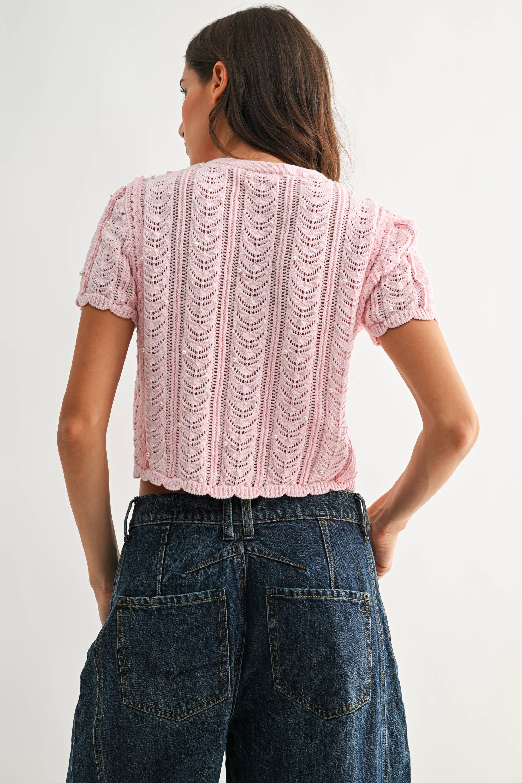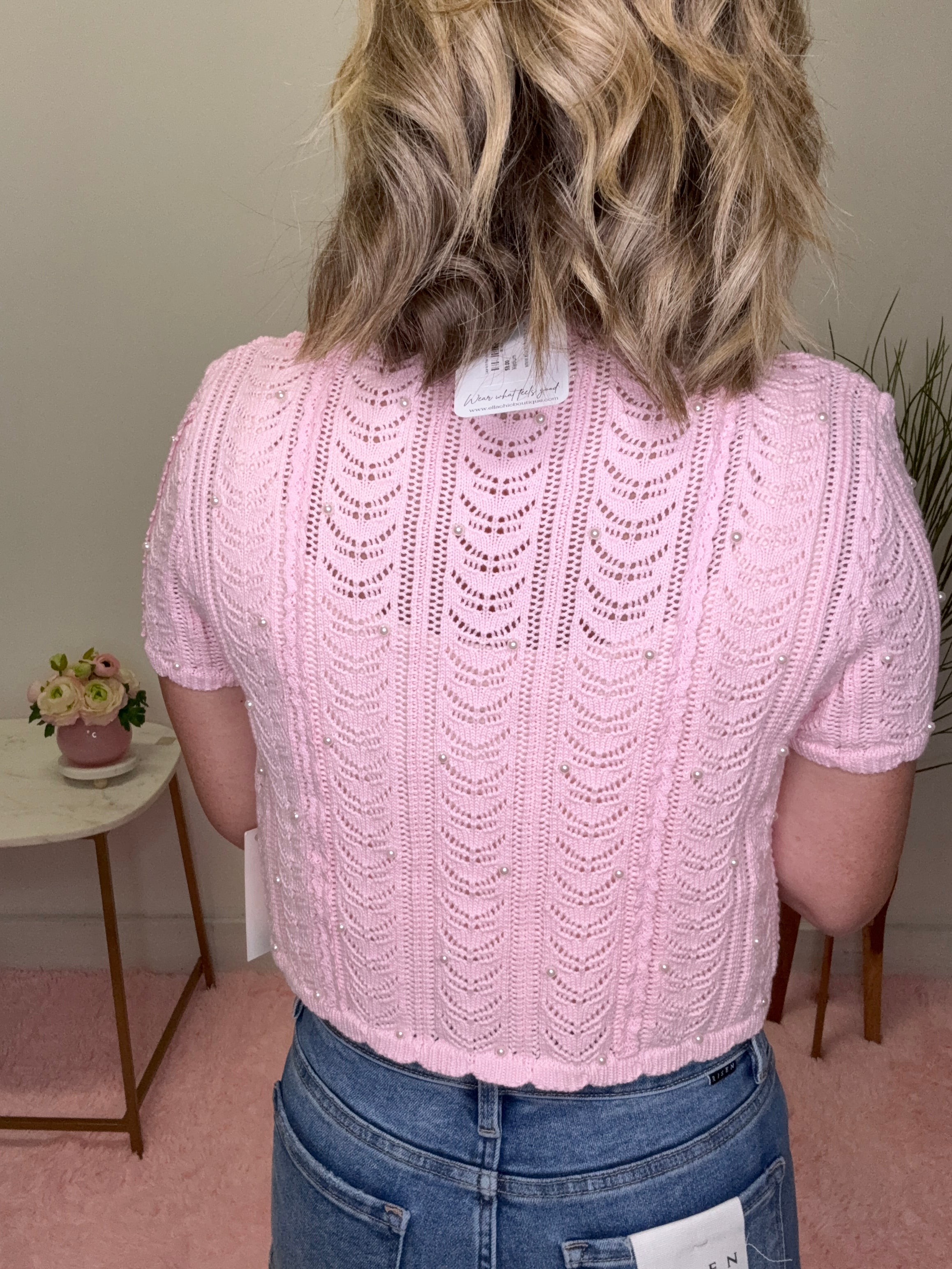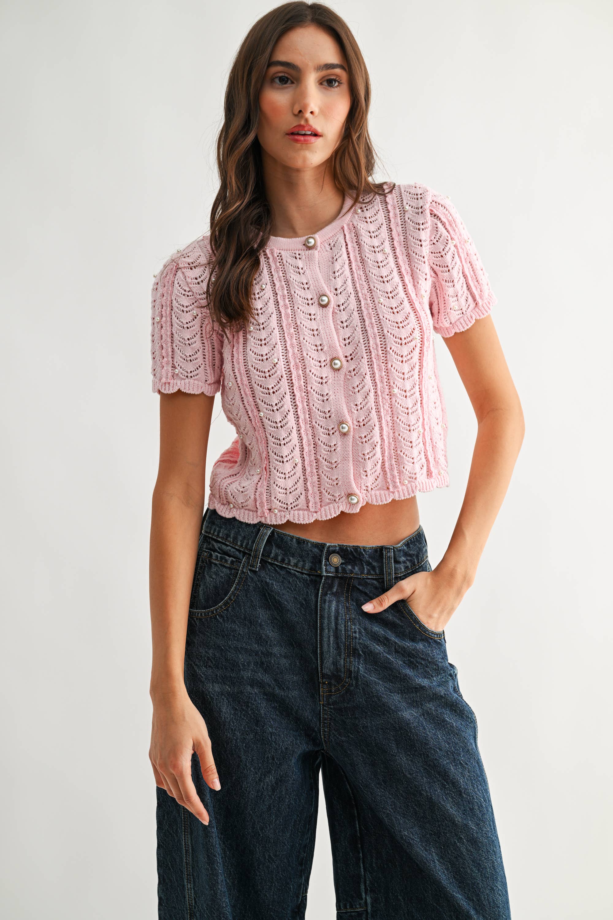 Lace Knit Pearl-Button Cardigan in Blush Pink