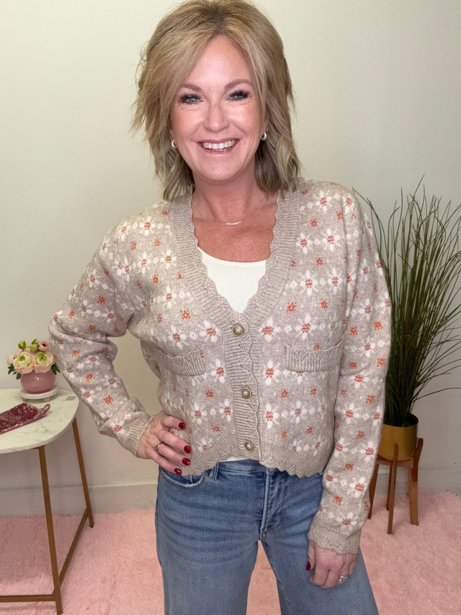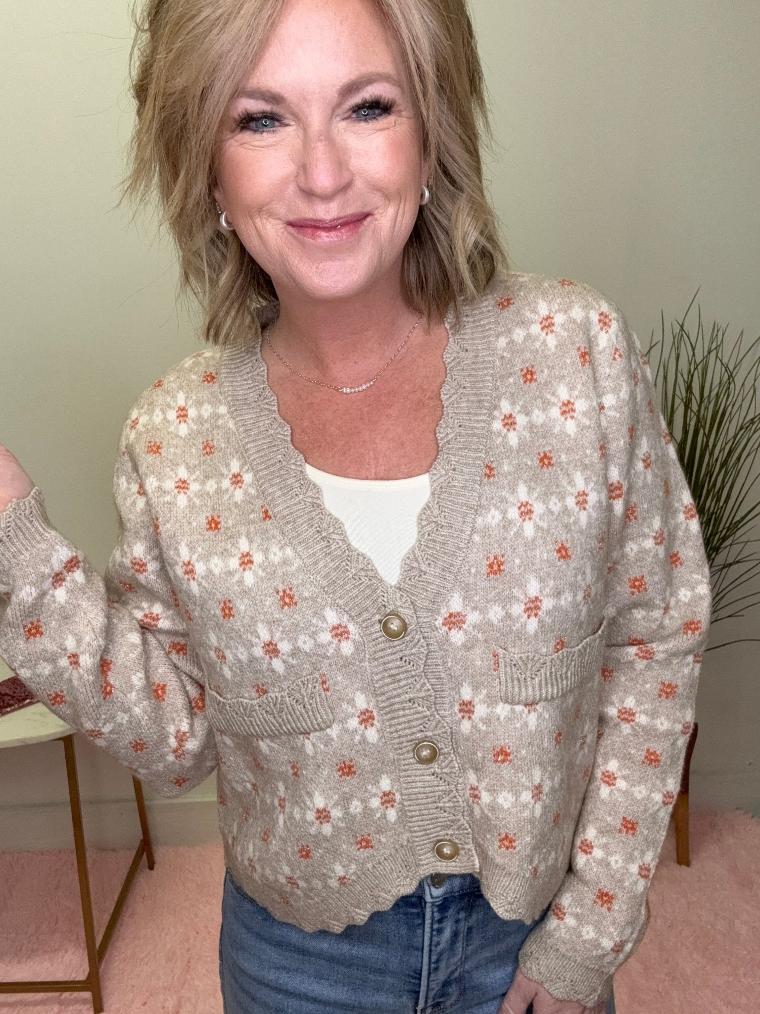 Soft, charming, and perfectly feminine — the First is Best Scalloped Cardigan Sweater is a cozy layering piece with the prettiest little details. From the delicate floral pattern to the scalloped trim, this cardigan feels vintage-inspired but totally wearable for everyday life.