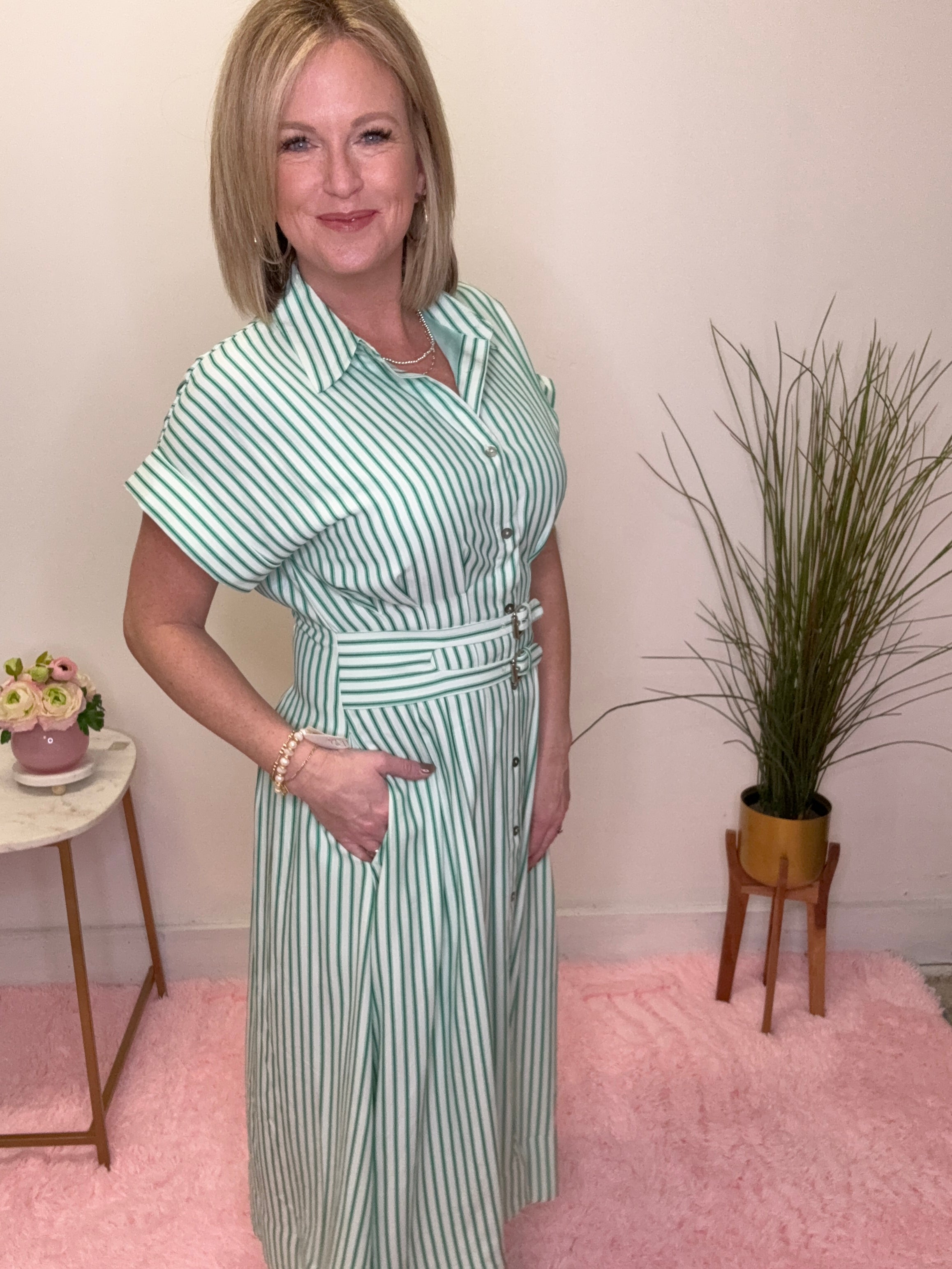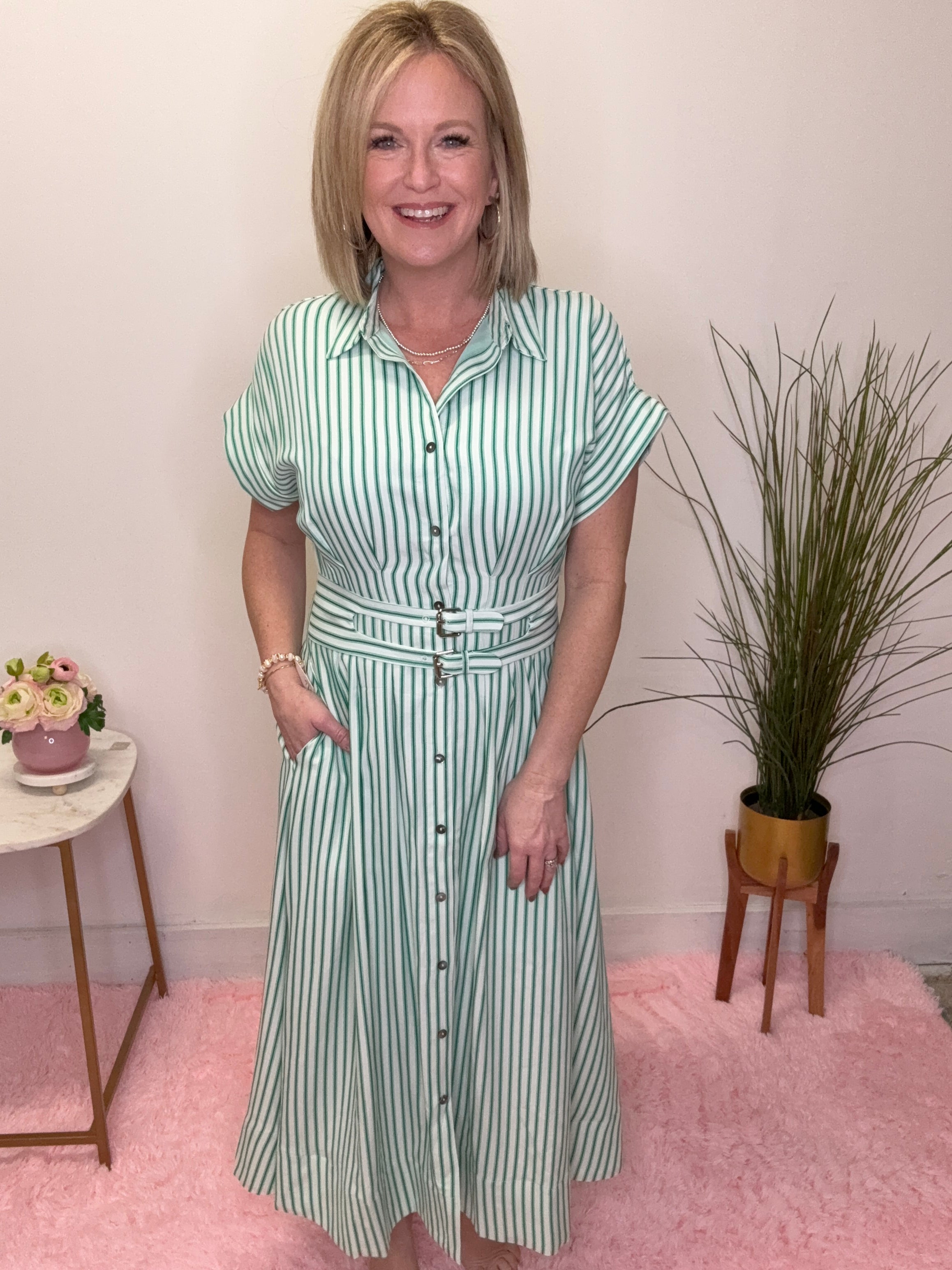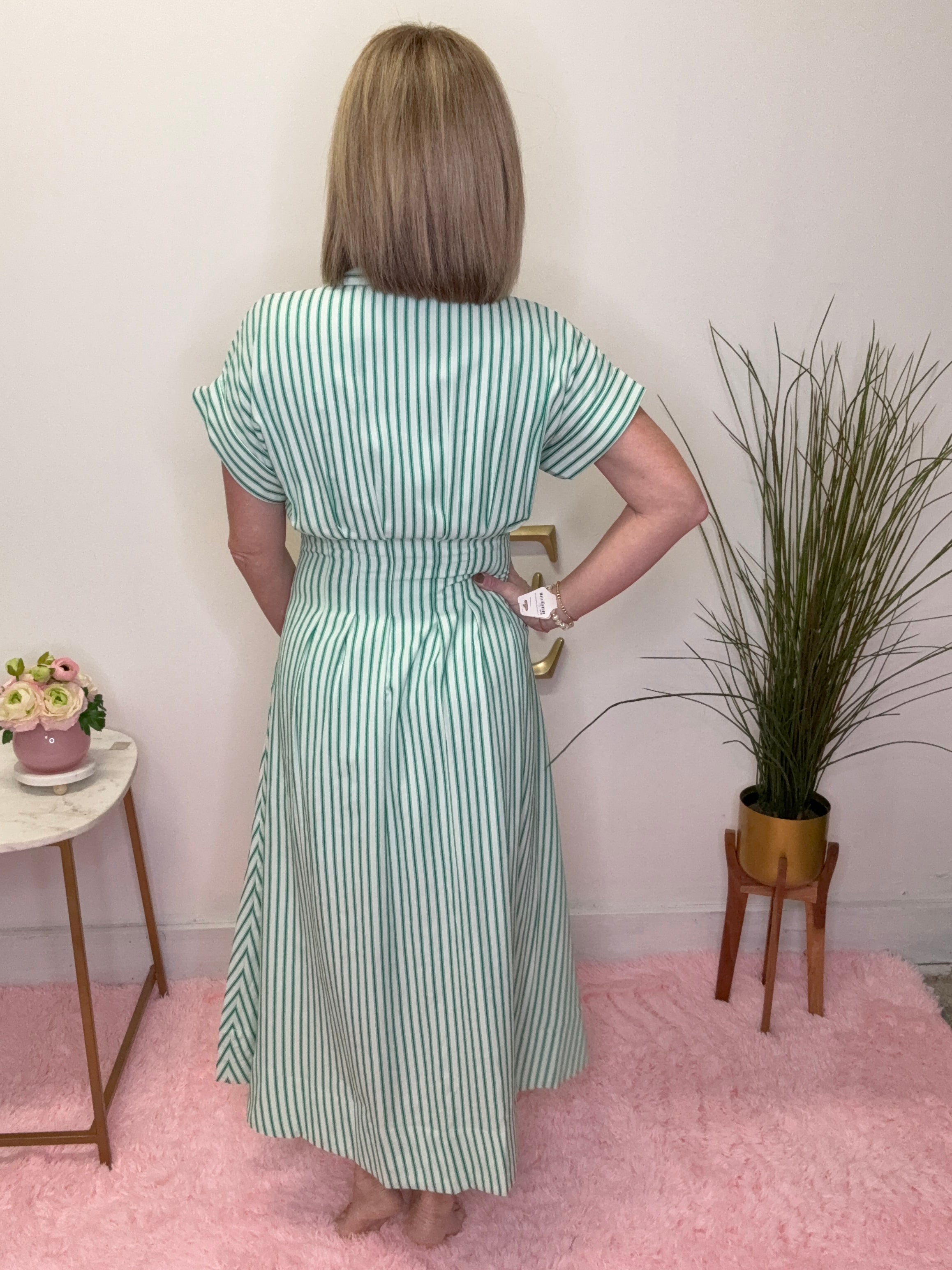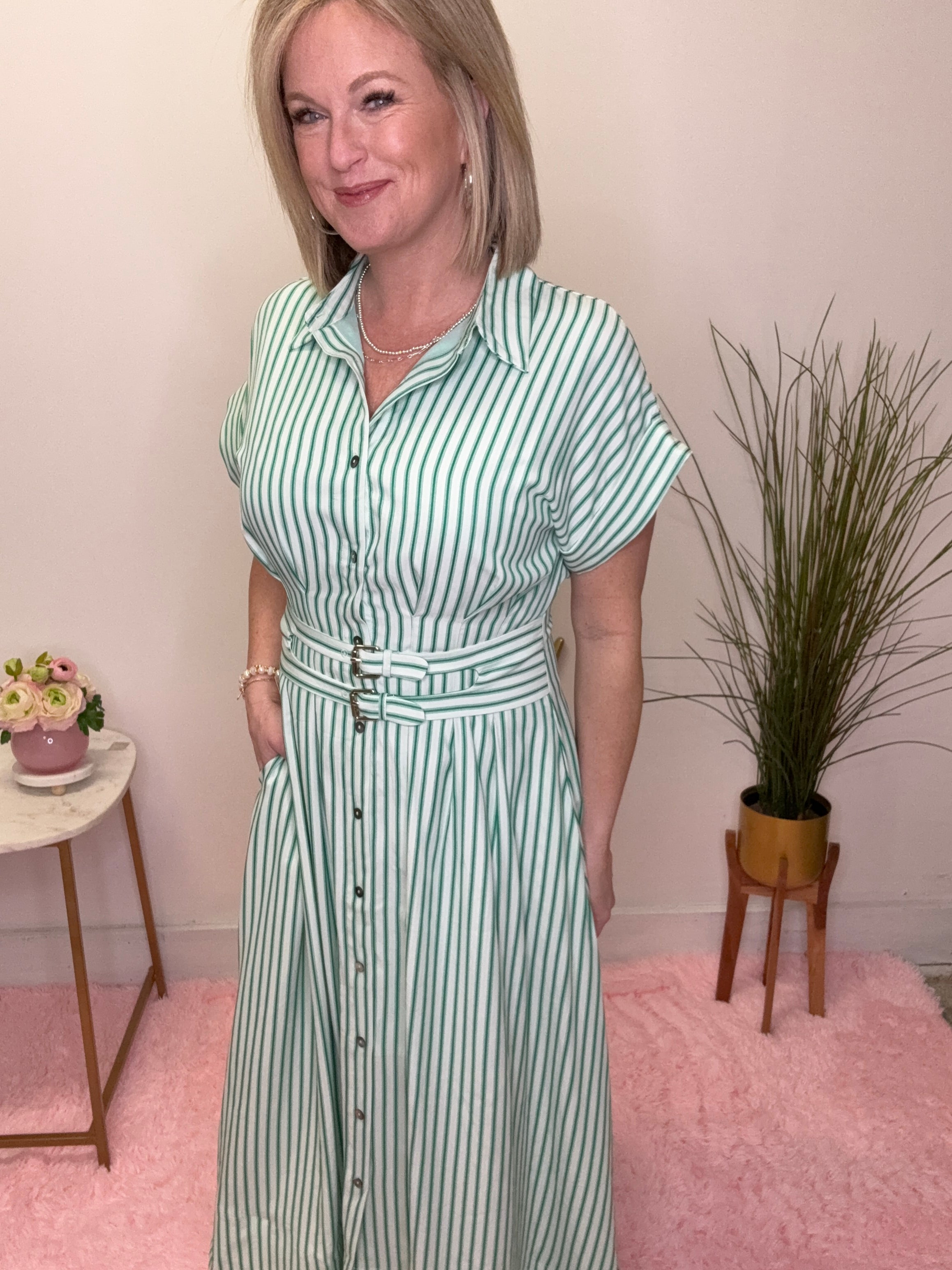 Fresh, feminine, and effortlessly put-together — this green striped midi dress is the perfect blend of classic charm and everyday ease. The soft vertical stripes elongate your silhouette while the belted waist adds a flattering, girly touch you’ll love.