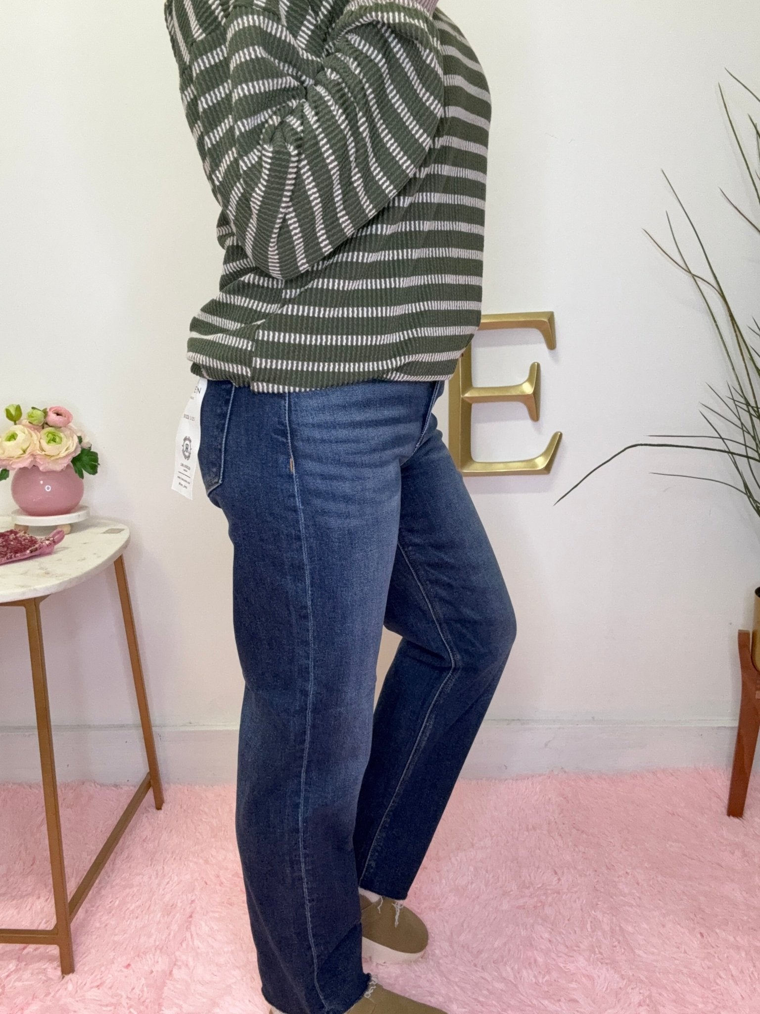 Modern, flattering, and insanely wearable — the Risen High-Rise Dark Wash Slim Barrel Jeans give you that on-trend barrel silhouette without feeling oversized or overwhelming. Designed with a high-rise waist and a subtly curved leg, these jeans offer structure, comfort, and a fresh update to your everyday denim.