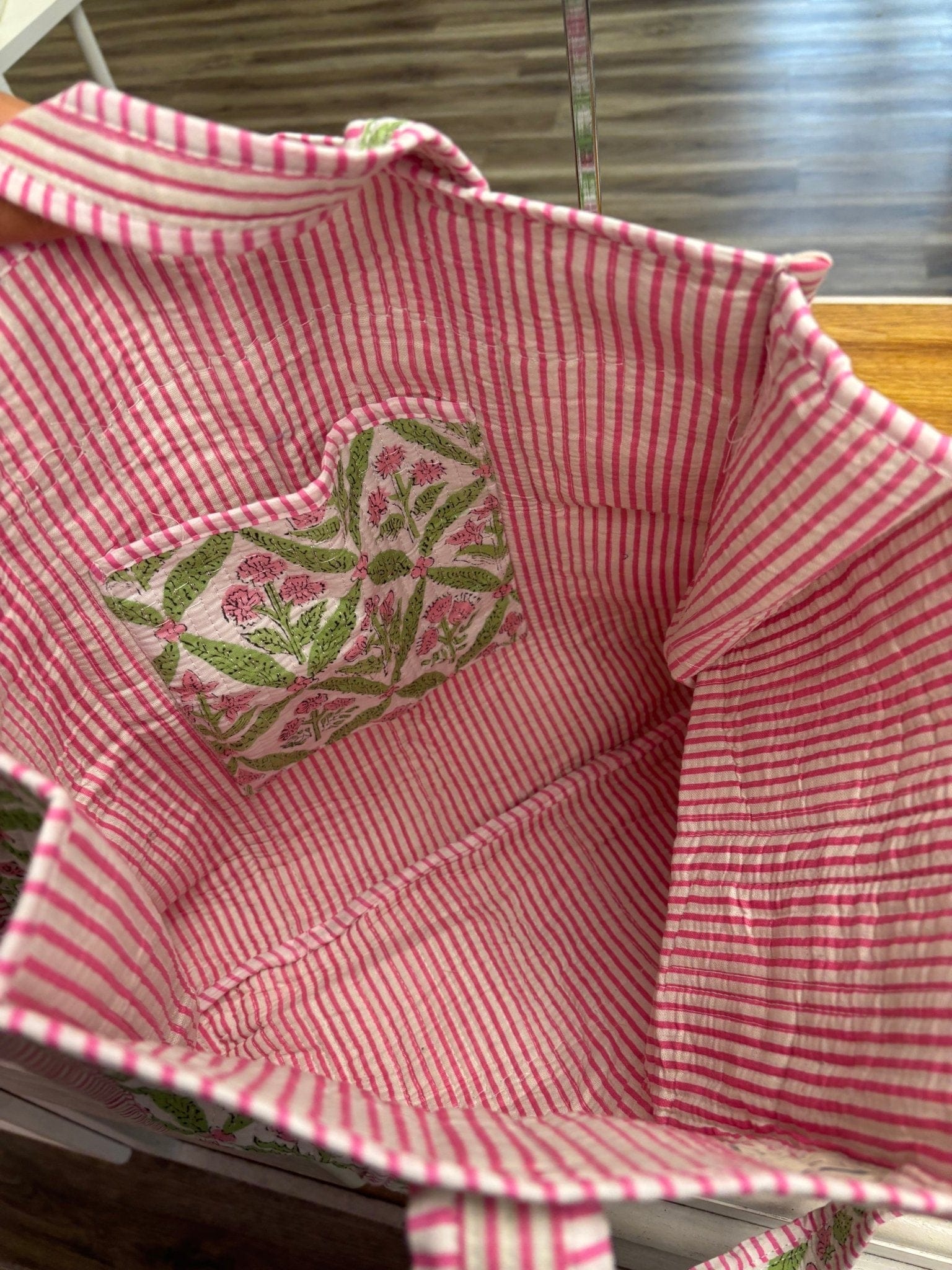 Get ready to add some playful florals to your style with the Miller Pink and Green Floral Tote Bag! This eye-catching tote bag is perfect for any occasion and features a pretty pink and green floral pattern on the outside. Plus, the striped interior adds a fun touch. Use it for anything and everything - this tote bag is a must-have!