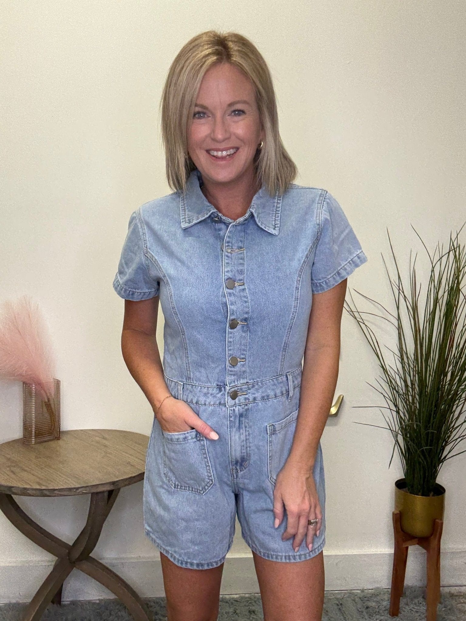 Experience true comfort and style with the Must Be Gorgeous Denim Romper. This stretchy and comfy piece is a dream come true, featuring a not-too-short shorts design and front button closure. A must-have addition to your wardrobe!
