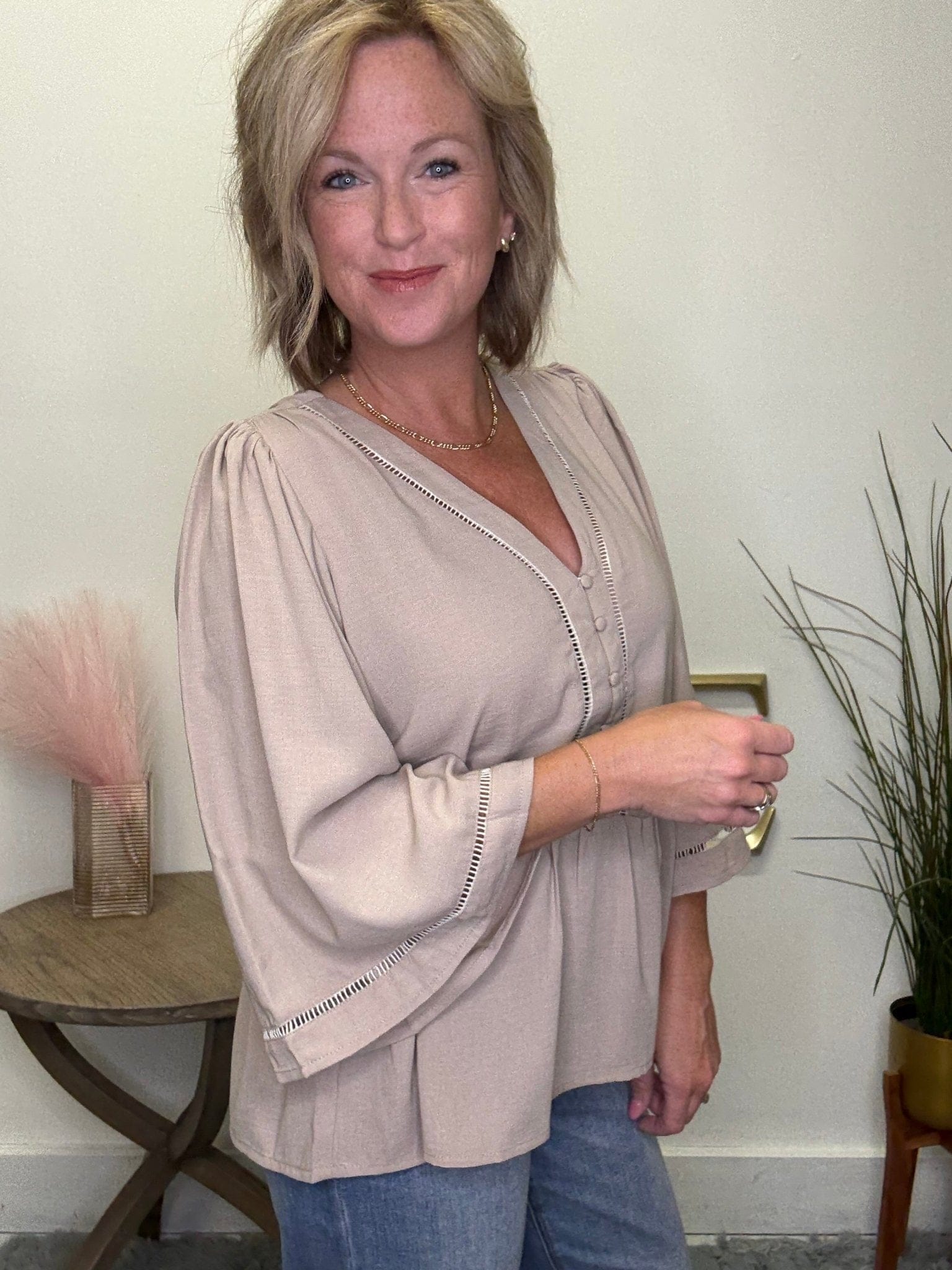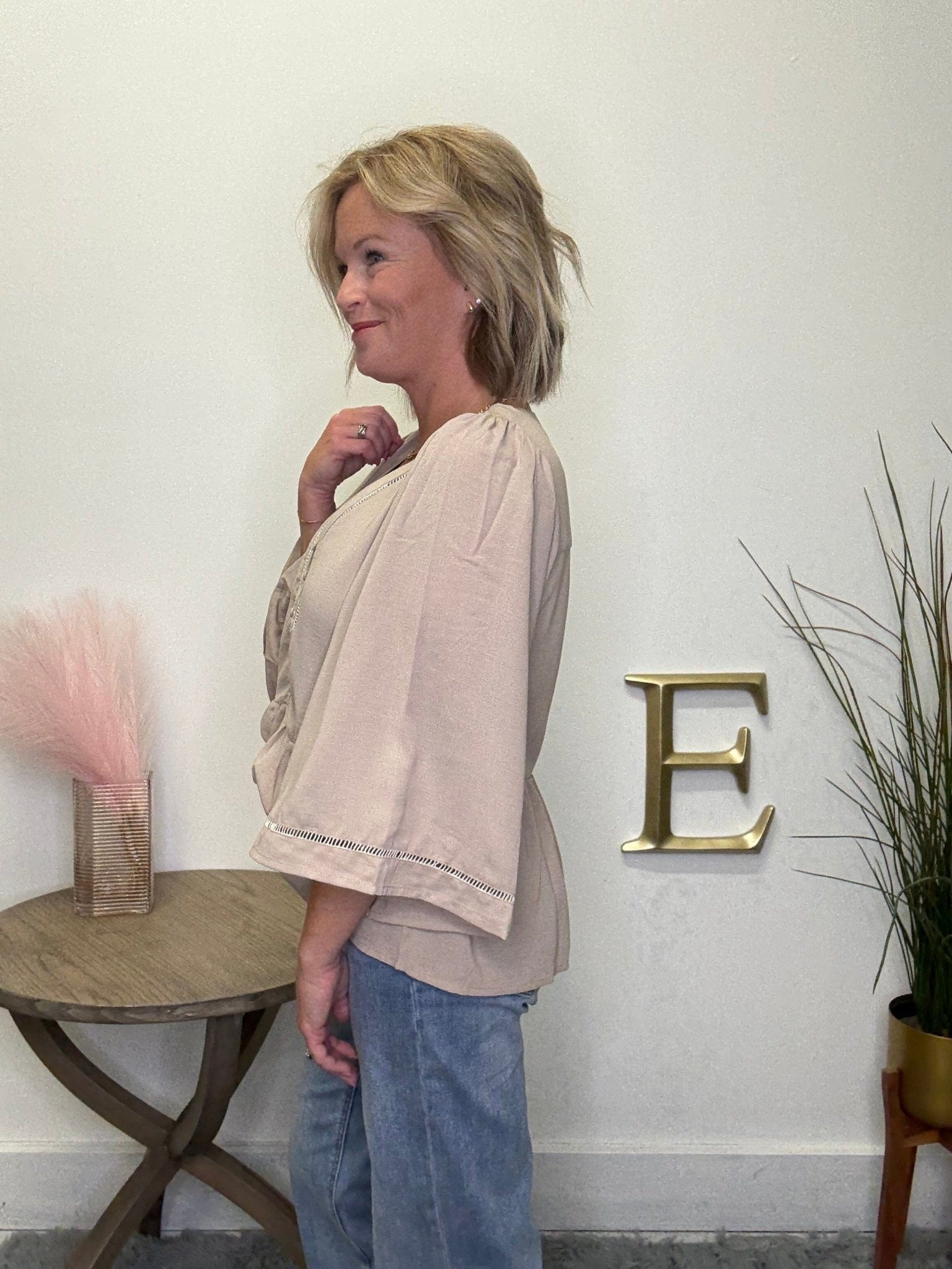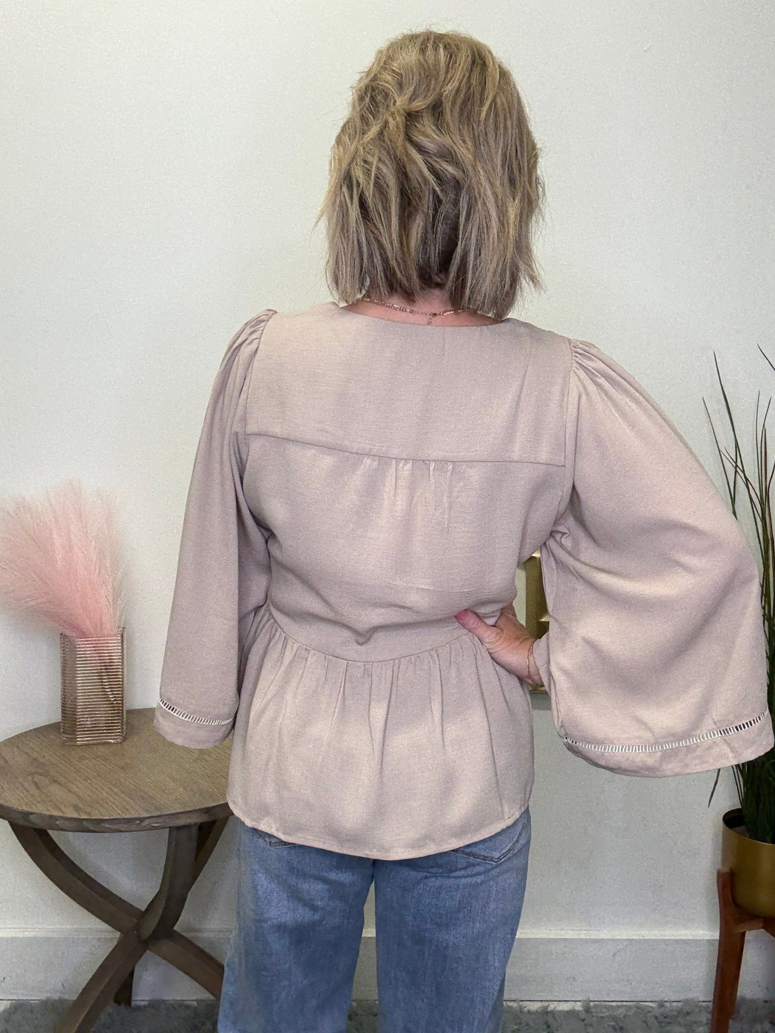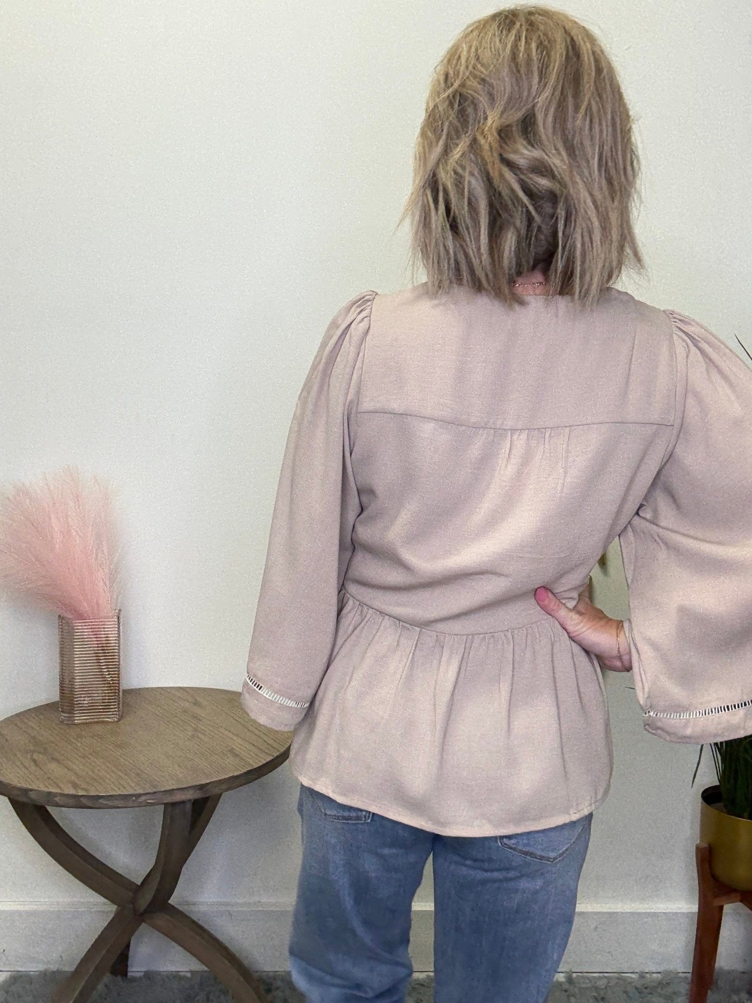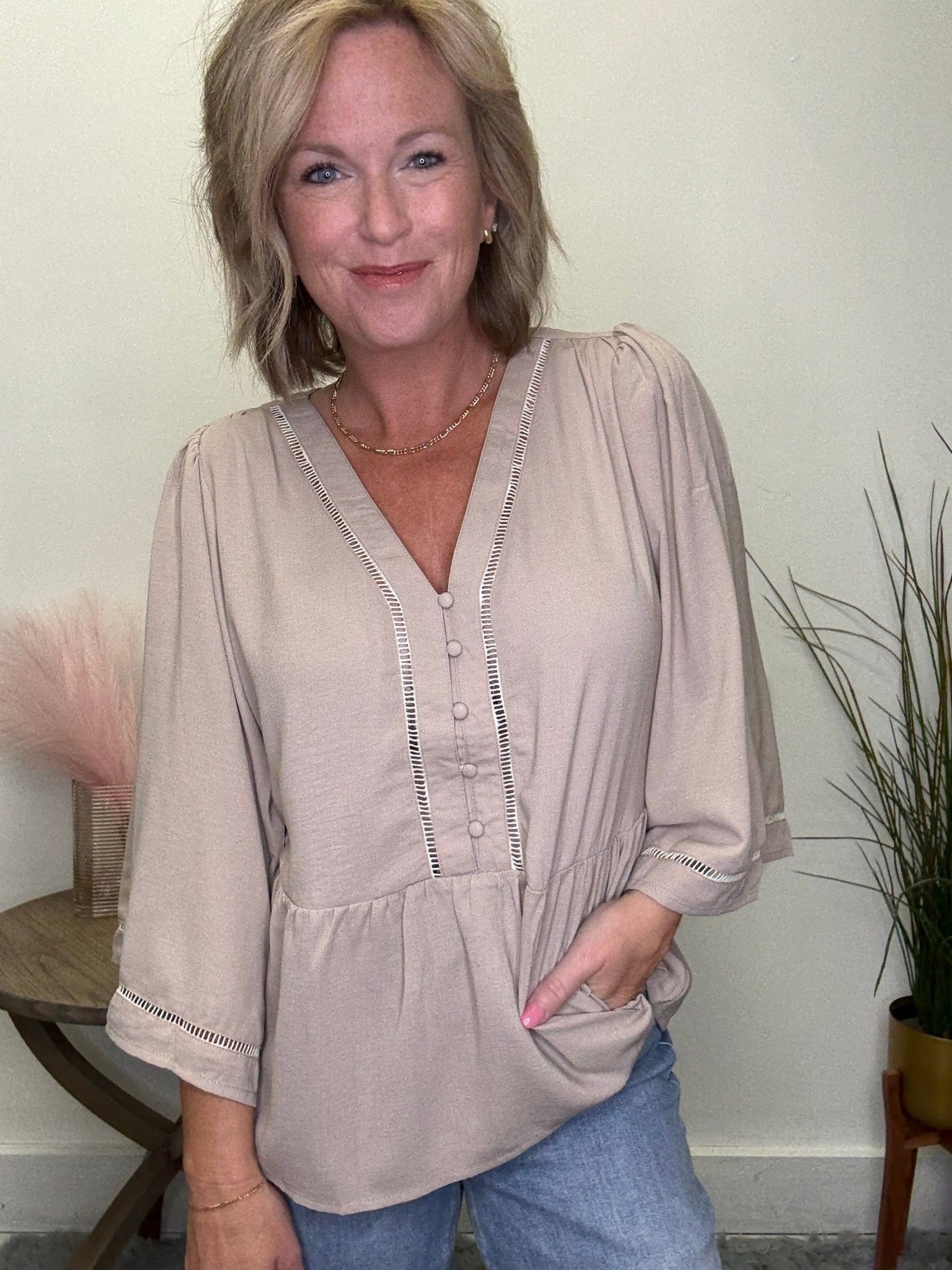 Get ready for the Must Happen Monroe Top in Tan! This playful top features detailed trim, wide 3/4 length sleeves, and a flattering peplum cut. With its v-neck and fun taupe color, it's sure to add a touch of quirkiness to your wardrobe. (Don't miss out, it's a must have!)
