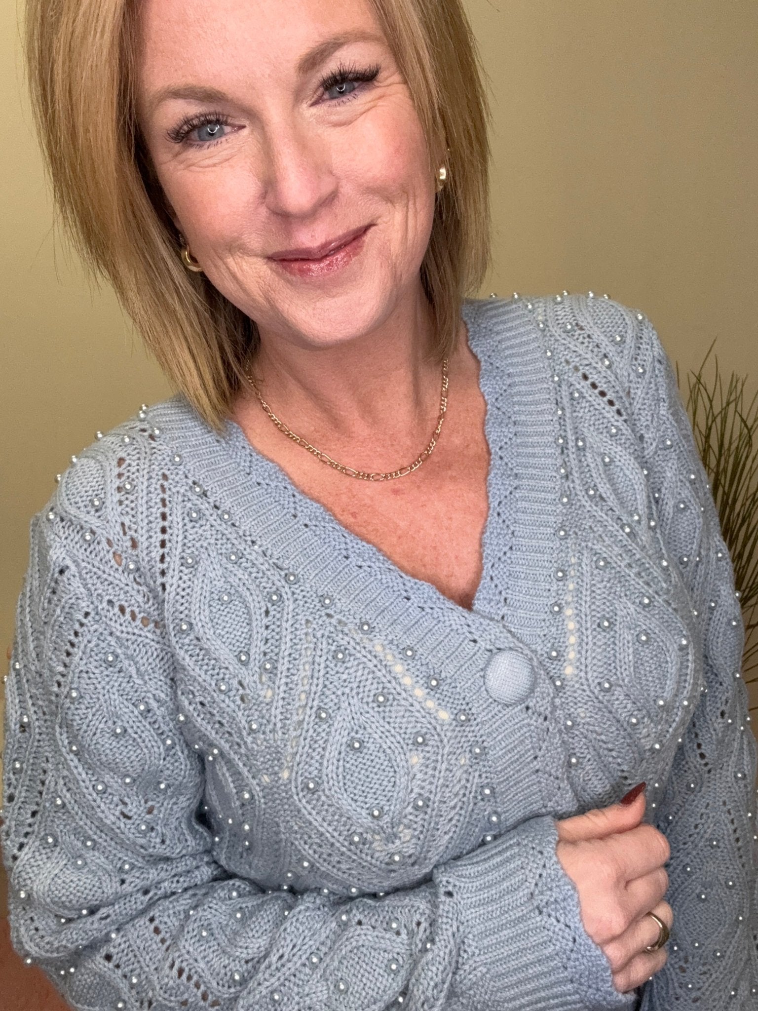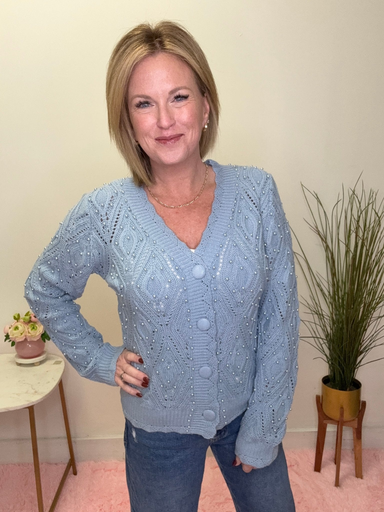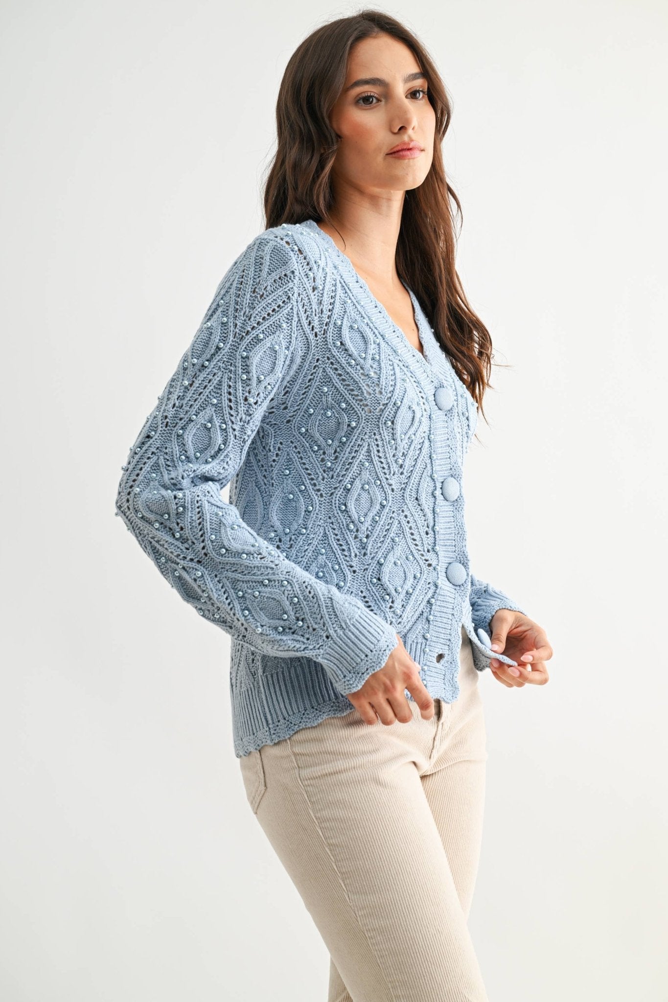 Brilliant Blue Pearl Adorned Knit Cardigan