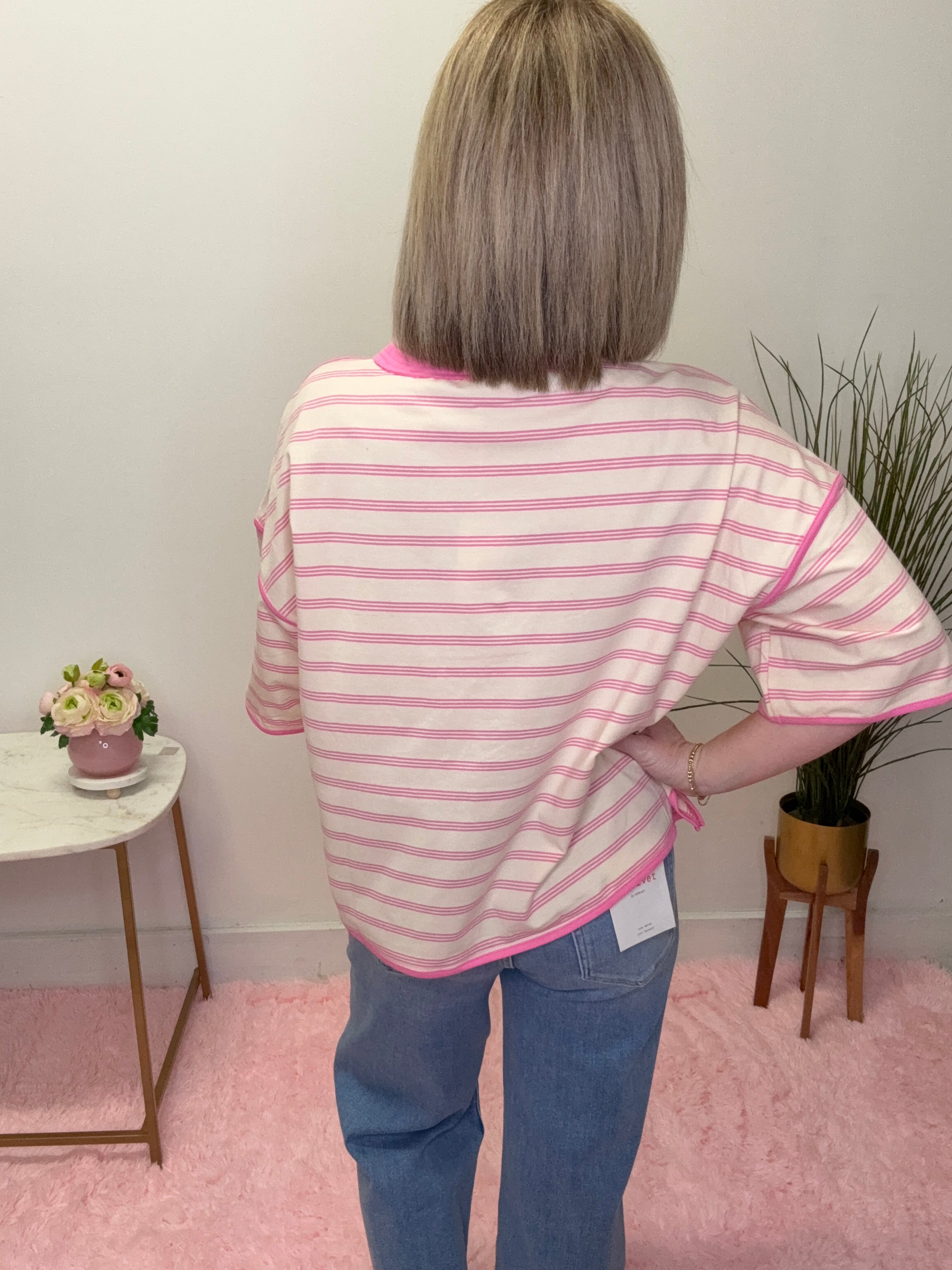 An easy favorite for everyday wear, this striped oversized top brings together soft neutrals and a pop of pink for a look that’s comfy, cute, and effortlessly flattering. Perfect for busy mom days, casual weekends, and everything in between.